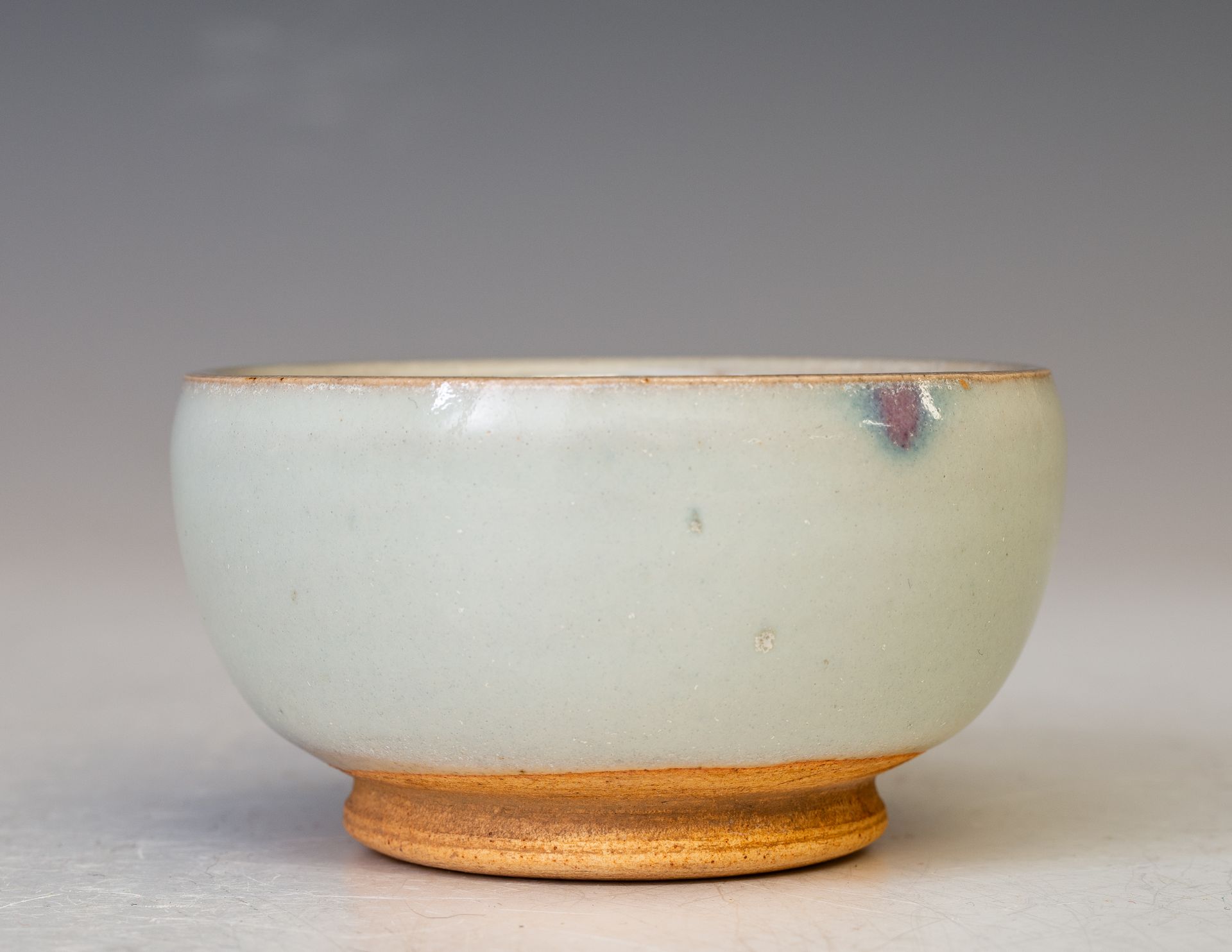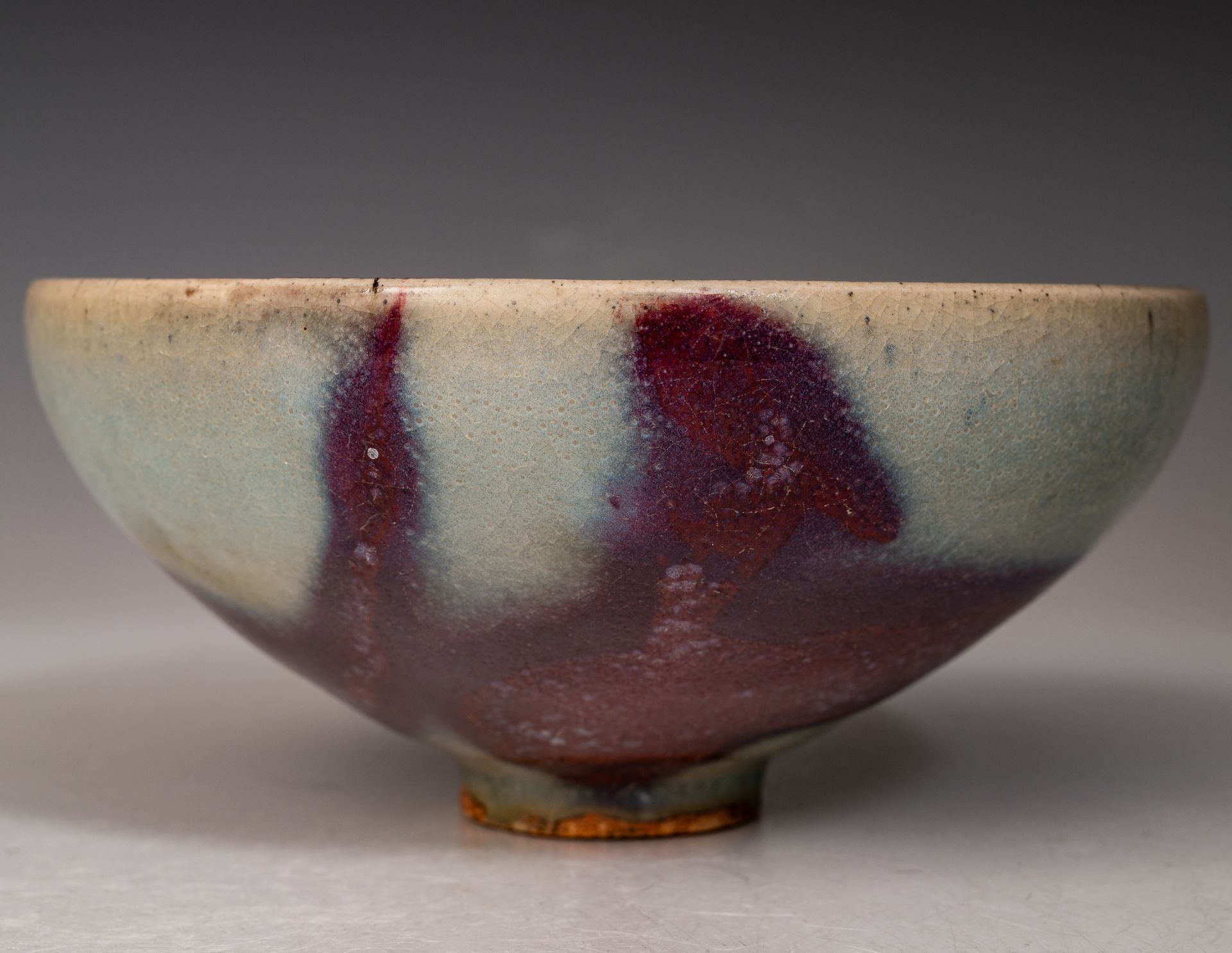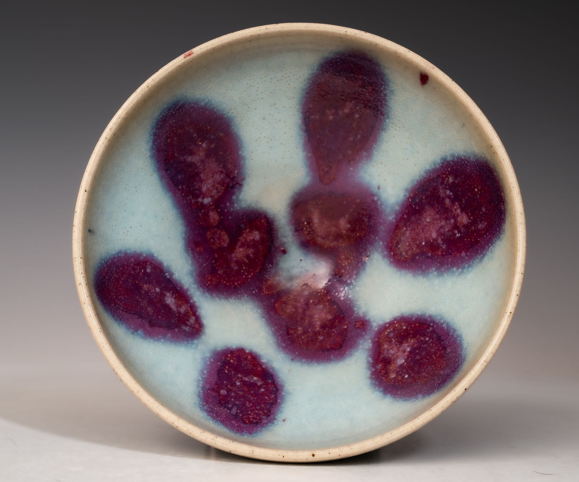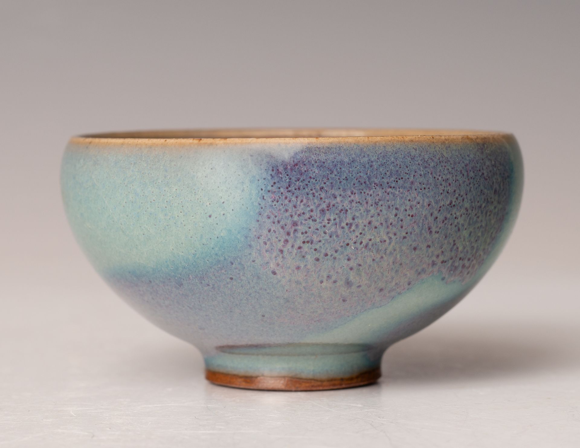 Song-Dynastie. Diese Schale ist im Inneren mit einem rötlich-violetten Farbtupfer auf blauem Grund verziert, und der äußere Rand weist einen leichten violetten Farbton auf, der sich zum Rand hin zu einem pilzfarbenen Ton verjüngt.