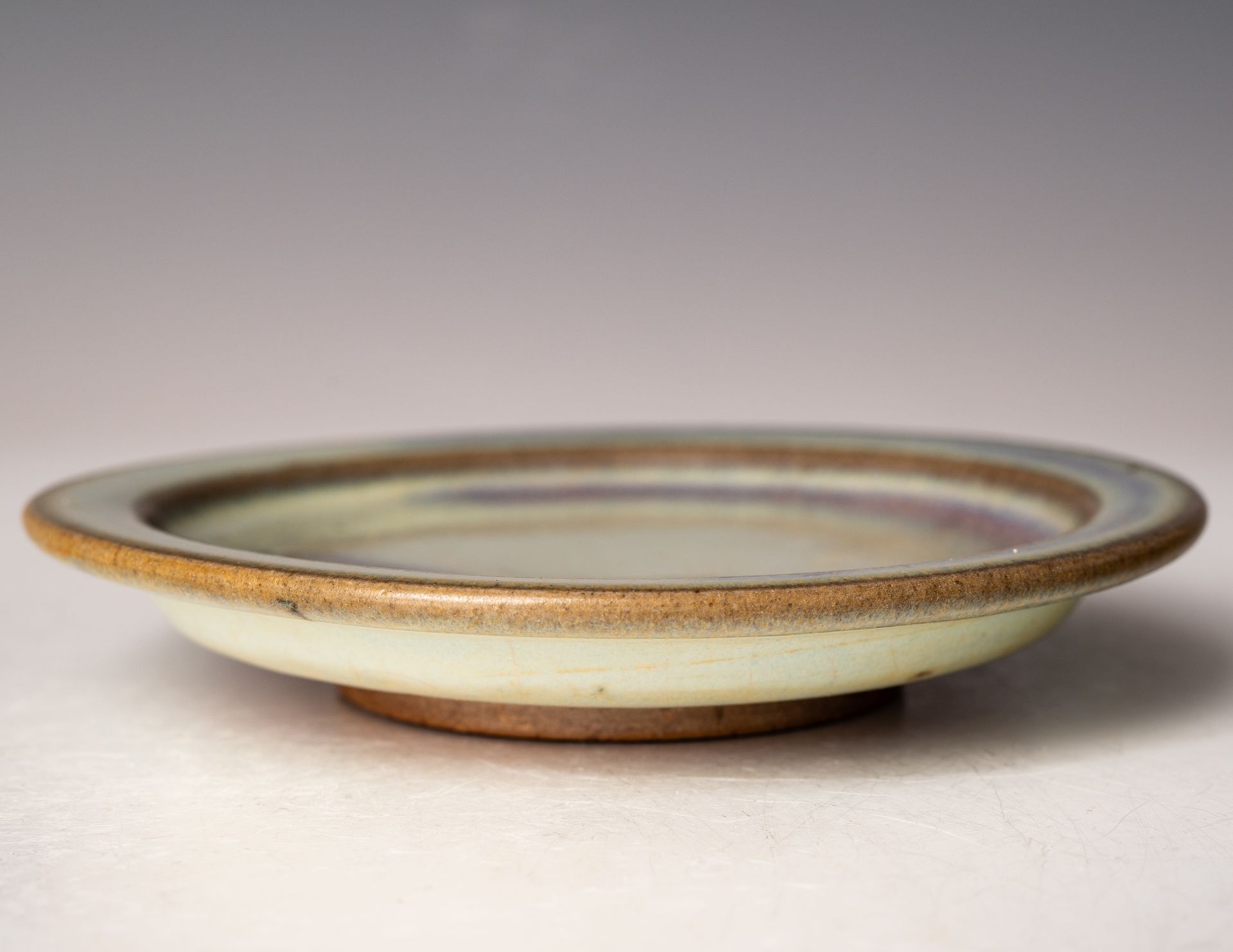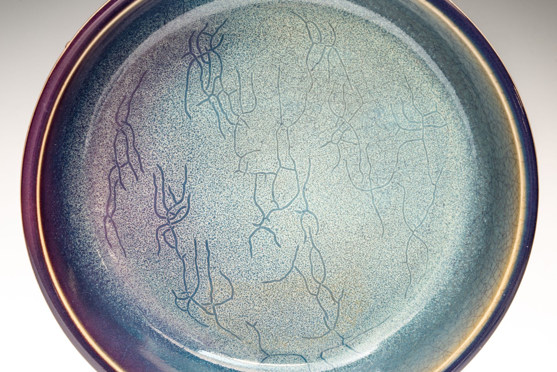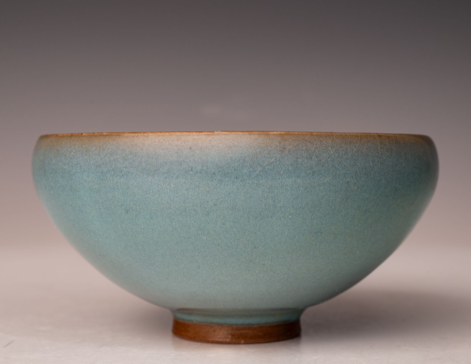 Song-Dynastie. Diese Schale ist im Inneren mit einem rötlich-violetten Farbtupfer auf blauem Grund verziert, und der äußere Rand weist einen leichten violetten Farbton auf, der sich zum Rand hin zu einem pilzfarbenen Ton verjüngt.
