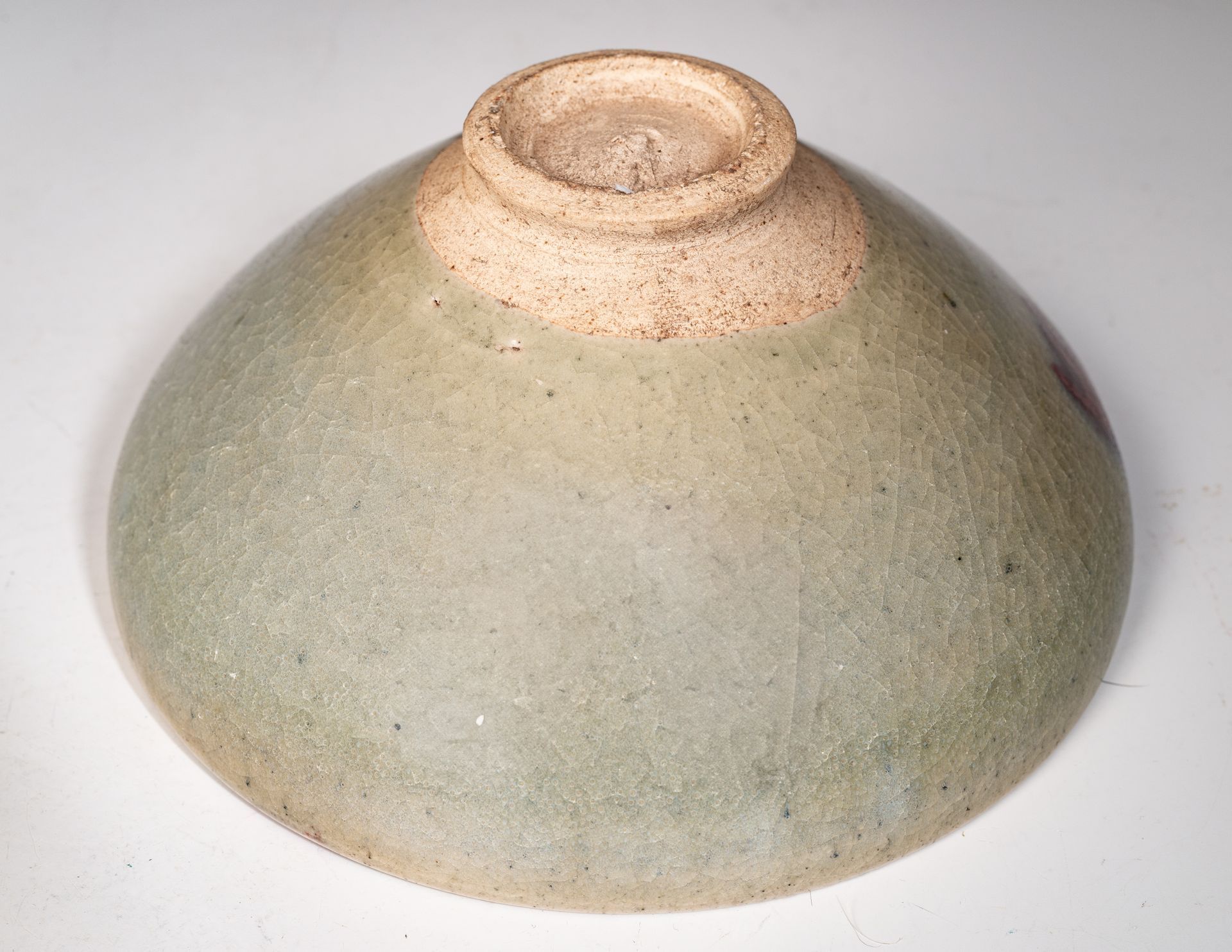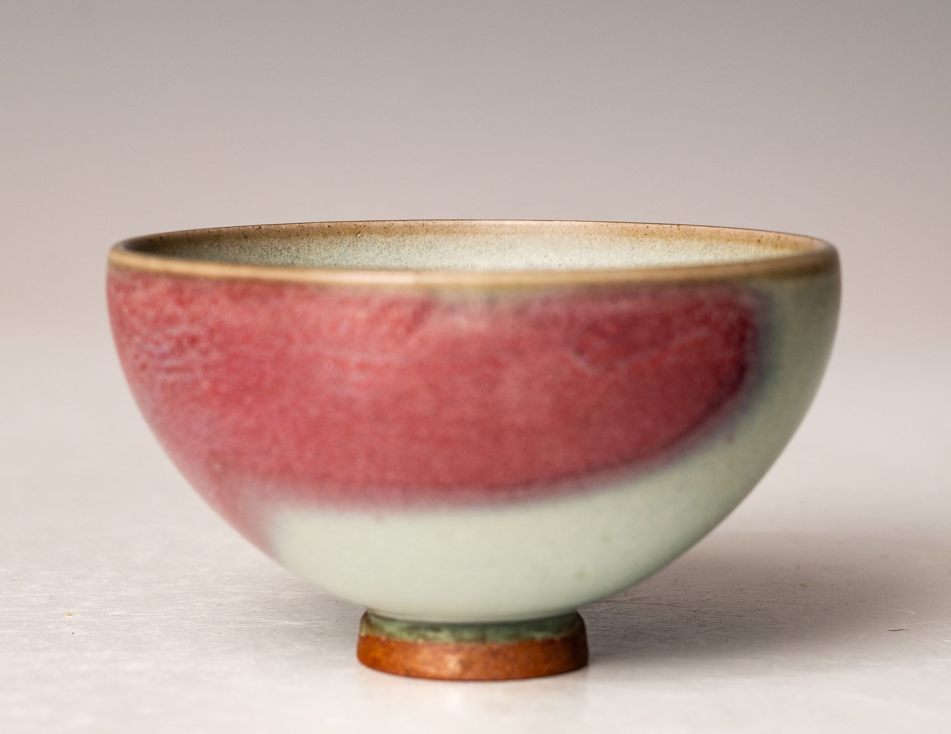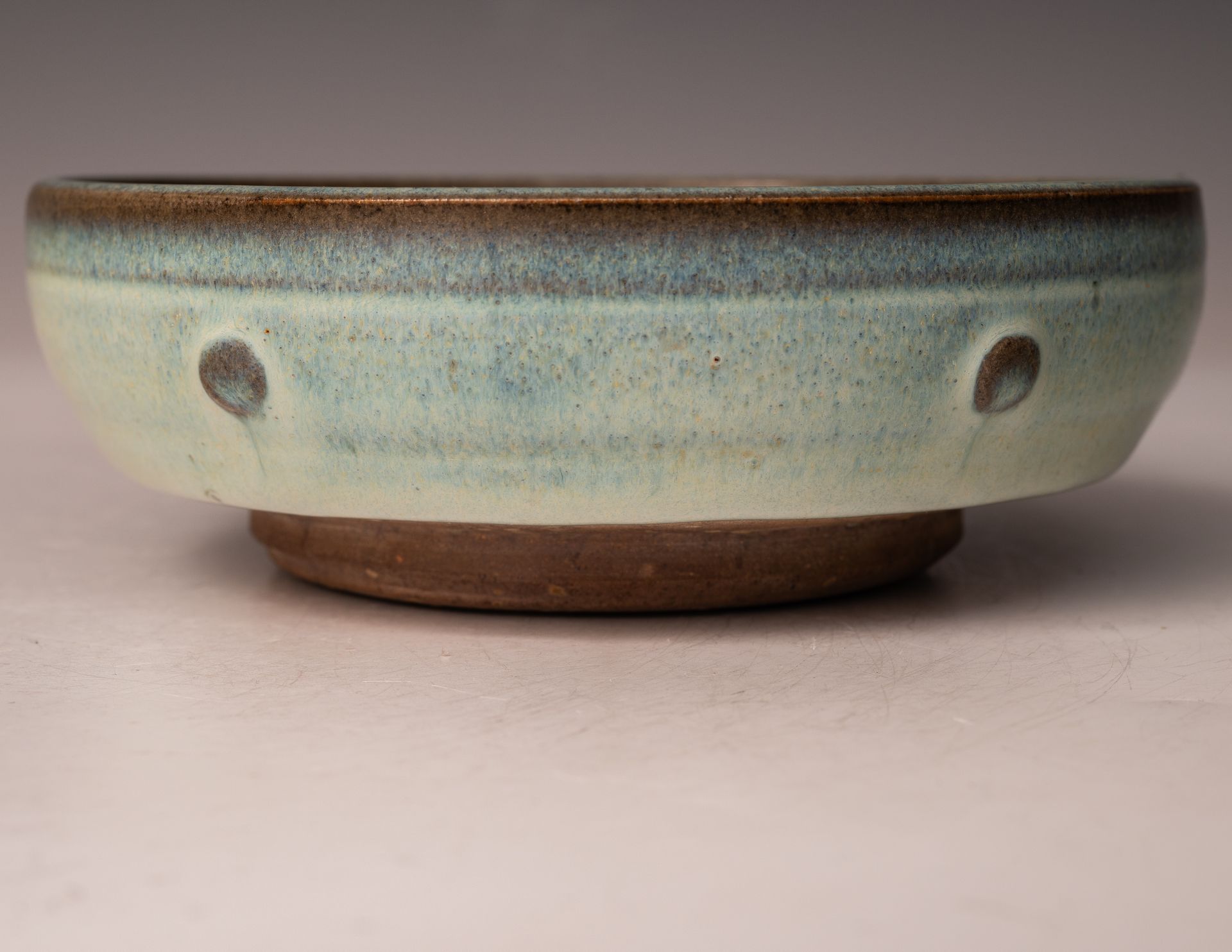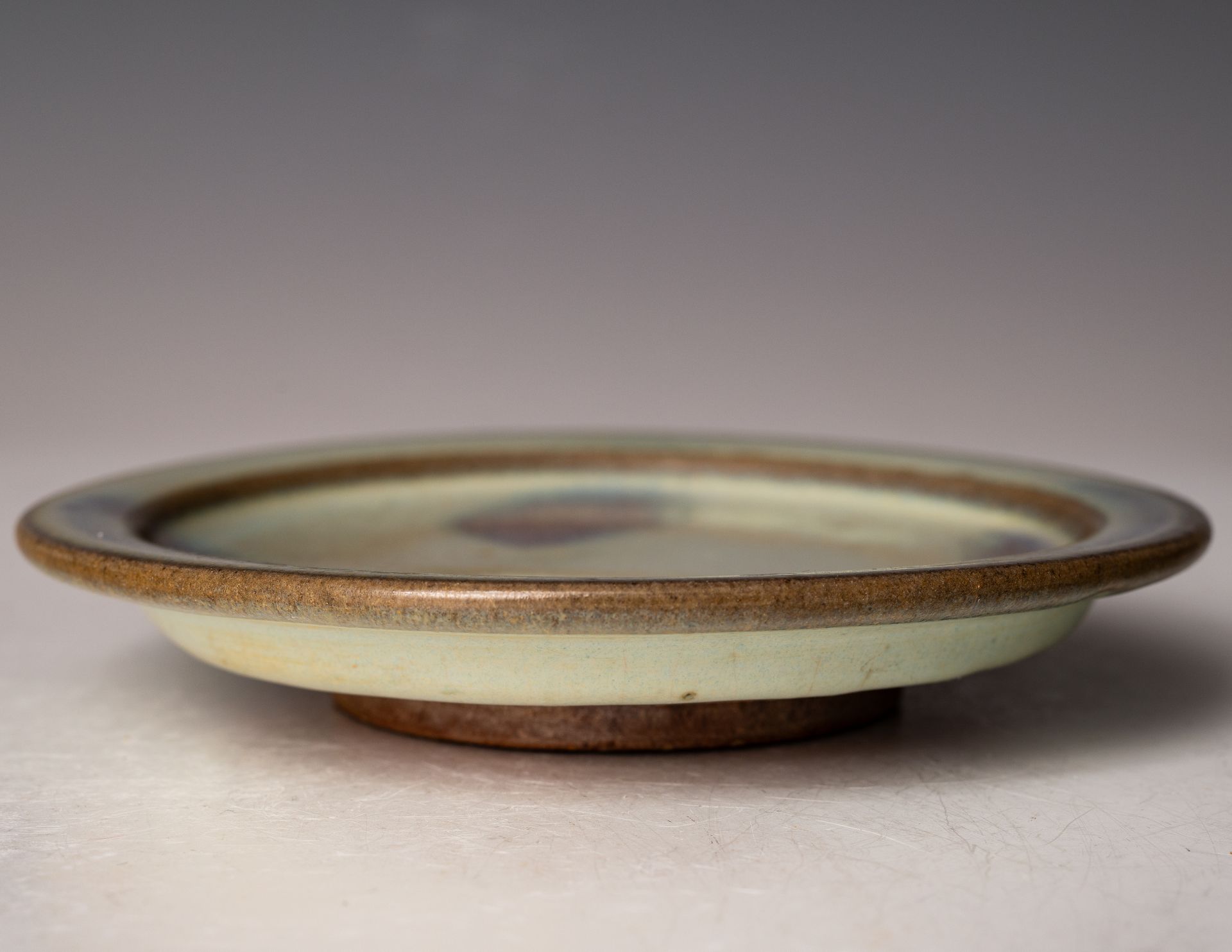 Song-Dynastie. Diese Schale ist im Inneren mit einem rötlich-violetten Farbtupfer auf blauem Grund verziert, und der äußere Rand weist einen leichten violetten Farbton auf, der sich zum Rand hin zu einem pilzfarbenen Ton verjüngt.