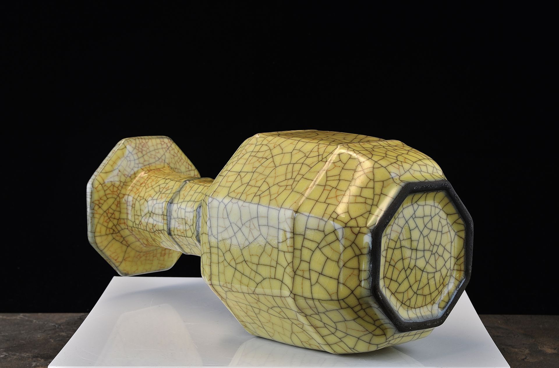 Große, achteckige, hu-förmige Vase mit Röhrenohren aus dem Ge-Ofen der Südlichen Song-/Yuan-Dynastie. Die Vase weist eine goldfarbene Drahtkrakelierung und einen purpurfarbenen Fuß auf, der an Weizen erinnert. Der Ge-Ofen gilt als der ältere Bruderofen der Ge-Keramik und markiert den Übergang von der Südlichen Song- zur Yuan-Dynastie. Diese Vase diente vermutlich als Tributgabe und zeugt aufgrund ihrer beachtlichen Größe (ca. 35 cm Höhe) von außergewöhnlicher Kunstfertigkeit und Pracht. ppjrs
