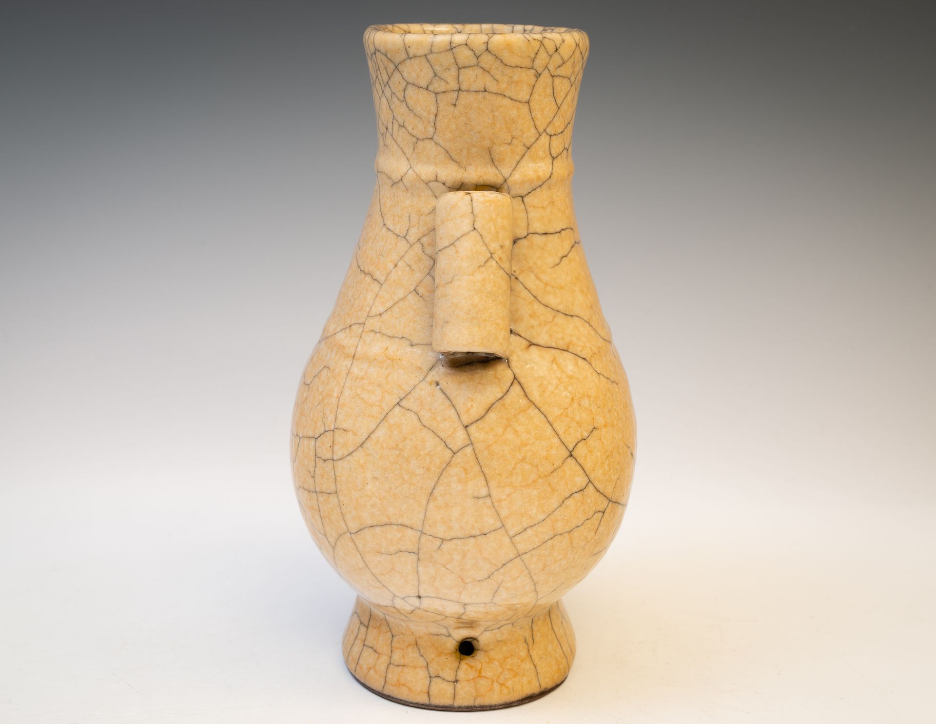 Achteckige, hu-förmige Vase mit Röhrenhenkeln aus dem Ge-Ofen der Südlichen Song-/Yuan-Dynastie, vermutlich aus der frühen Südlichen Song-Zeit. Der Brennvorgang weist Unregelmäßigkeiten auf; die Glasur ist aufgrund der damaligen Ofenbeschränkungen deutlich dicker. Die Vase besitzt einen Eisenfuß und eine weizenfarbene Färbung. Der Ge-Ofen, oft als „Ofen des älteren Bruders“ bezeichnet, ist historisch bedeutsam für den Übergang von der Südlichen Song- zur Yuan-Dynastie. Die Vase ist ca. 19 cm hoch.