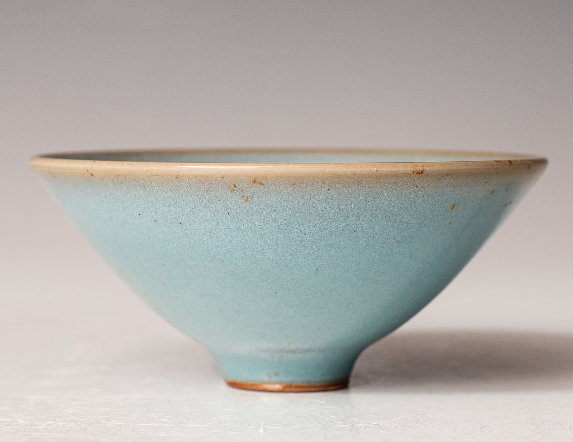 Diese konische Jun-Schale aus der Nördlichen Song-Dynastie besticht durch ihre charakteristische hellblaue Glasur, die innen wie außen mit violetten Sprenkeln verziert ist. Zum Rand hin geht die Glasur allmählich in einen hellen Champignonton über. Die Schale hat einen Durchmesser von 10 cm. ppjrs