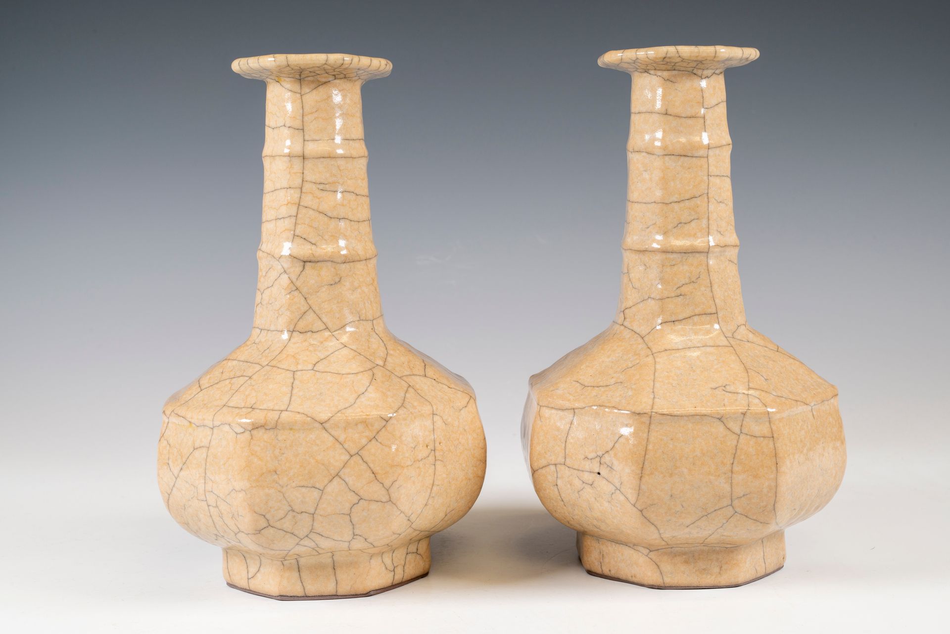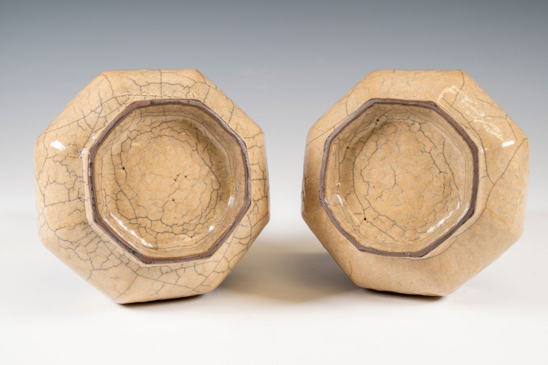 Dieses außergewöhnliche Paar achteckiger Ge-Ware-Vasen zählt zu den seltensten dokumentierten Formen der Kunstkeramik. Charakteristisch für diese Vasen sind ihr weizenfarbener Farbton und die zarte, dünne Wandstärke, die von höchster Handwerkskunst zeugt. Ge-Ware zeichnet sich insbesondere durch ihren eisernen Fuß aus, der am Fußring sichtbar ist. Dieser entsteht durch die Verwendung von hellbraunem Ton mit hohem Eisengehalt, der beim Brennen nachdunkelt. Das Craquelé-Muster auf der Oberfläche erinnert an mit Goldfäden durchzogenen Eisendraht. Der Ge-Ofen, oft auch als Ofen des älteren Bruders bezeichnet, war während der Südlichen Song-Dynastie und bis in die Yuan-Dynastie in Betrieb. Diese Vasen gelten als seltene Artefakte, die vermutlich in der Südlichen Song-Dynastie hergestellt wurden. Dies ist auf ein früheres, weniger ausgefeiltes Brennverfahren zurückzuführen, das aufgrund sich entwickelnder Produktionstechniken zu einem dickeren Glasurauftrag führte. Jede Vase ist etwa 22 cm hoch, was ihre Bedeutung für die Geschichte der chinesischen Keramik unterstreicht.