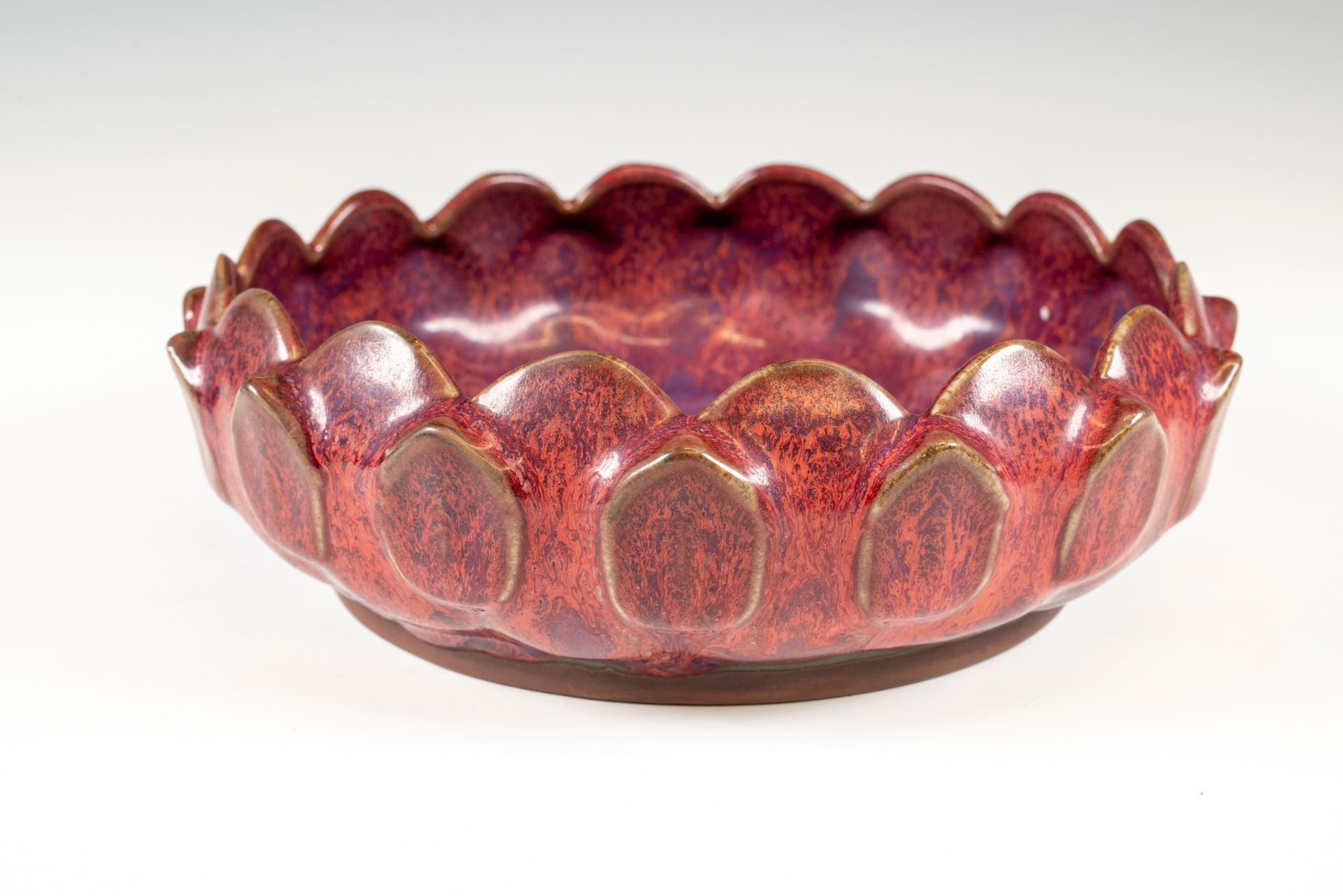Diese Bürstenschale aus Jun-Keramik, die der Nördlichen Song-Dynastie zugeschrieben wird, zeigt ein von Lotusblättern inspiriertes Dekor. Das exquisite Stück zeichnet sich durch einen charakteristischen bräunlichen Überzug mit rötlichen und violetten Untertönen und einem dezenten Blaustich aus. Der Durchmesser beträgt etwa 20 cm. ppjrs