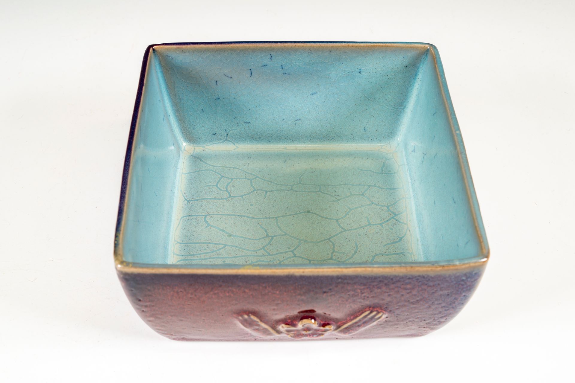 Diese quadratische Bürstenschale aus Jun-Keramik, die aus der Song-Dynastie stammt, zeichnet sich durch ihren charakteristischen bräunlichen Überzug aus. Außen schimmert sie in einem violetten Farbton, während das Innere in einem faszinierenden Robin-Egg-Blau erstrahlt, das von einem dezenten, feinen Craquelé ergänzt wird. Am Boden sind Wurmspuren zu erkennen. Die Schale hat einen Durchmesser von ca. 16,8 cm.