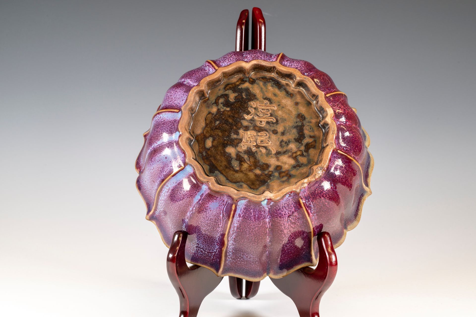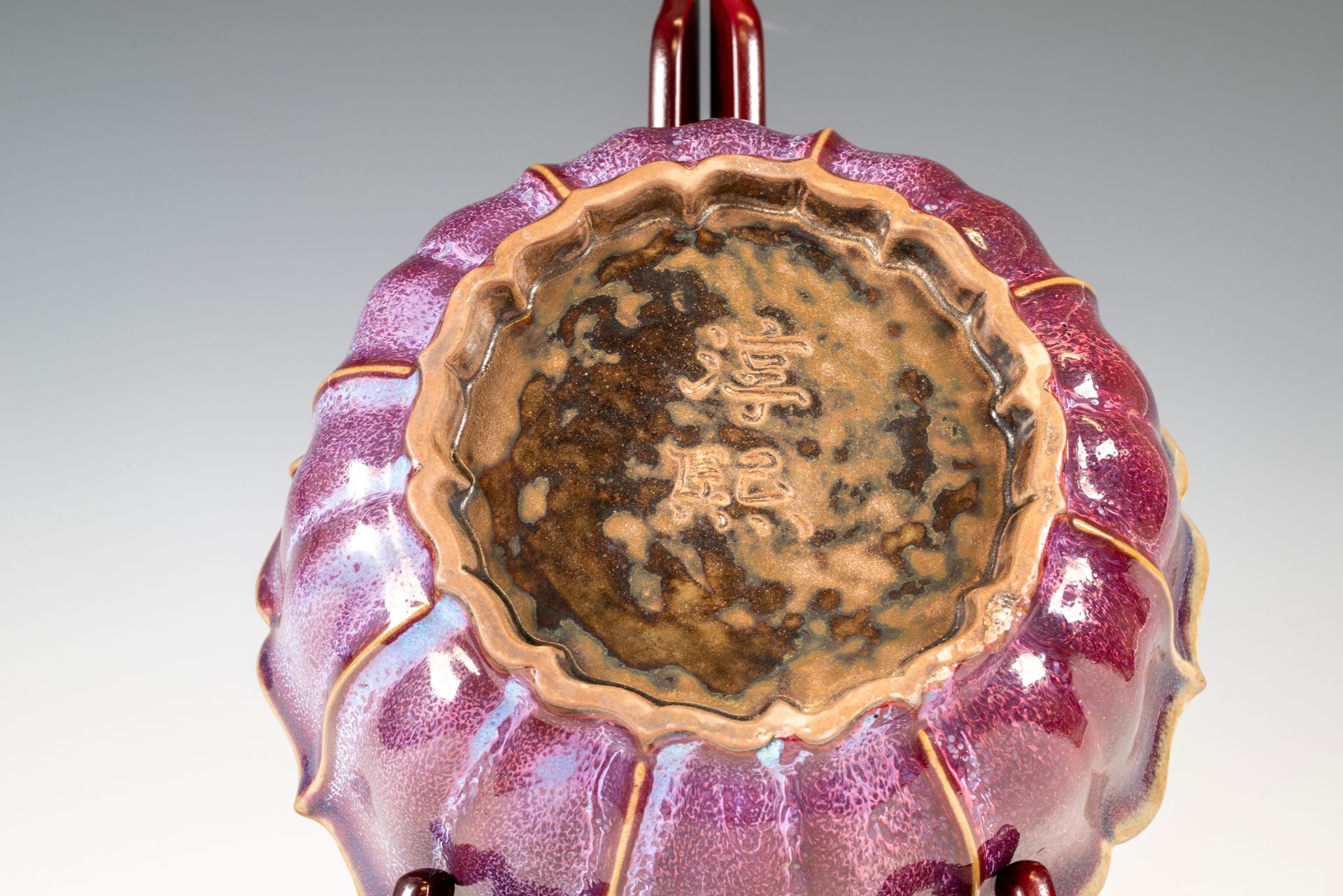 Jun-Ware-Pinselwaschgefäß in Form von Lotusblättern mit rötlich-violetter Glasur aus dem Jun-Brennofen der Nördlichen Song-Dynastie