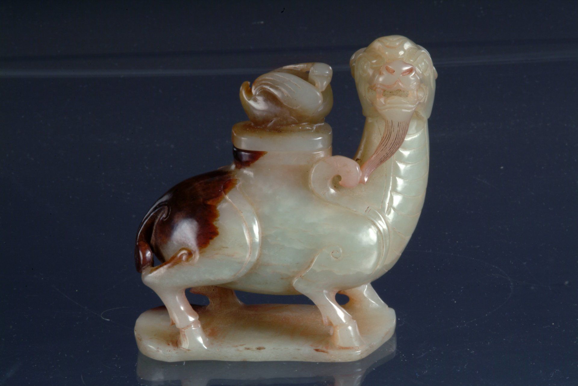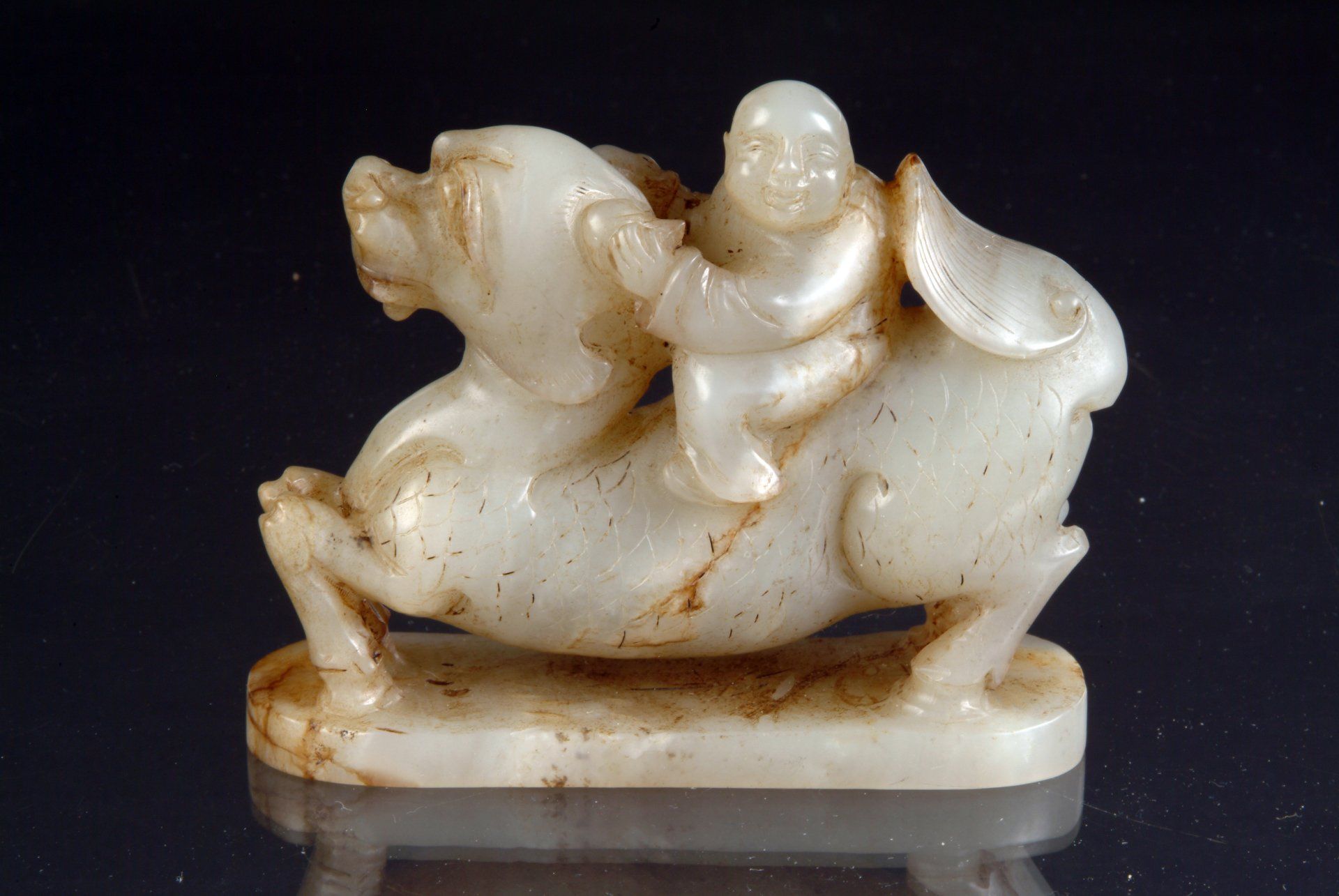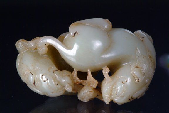 Grauweiße Jadefigur aus der Ming-Dynastie, die ein Fabelwesen mit Reiter darstellt.