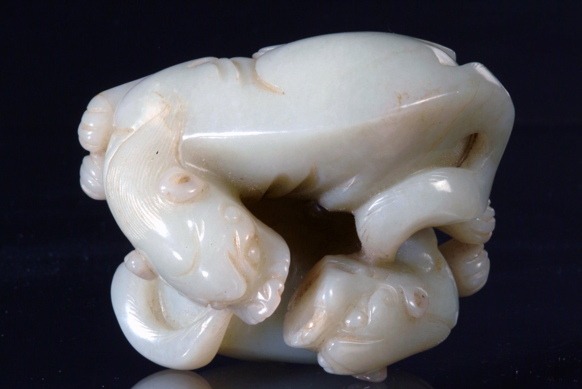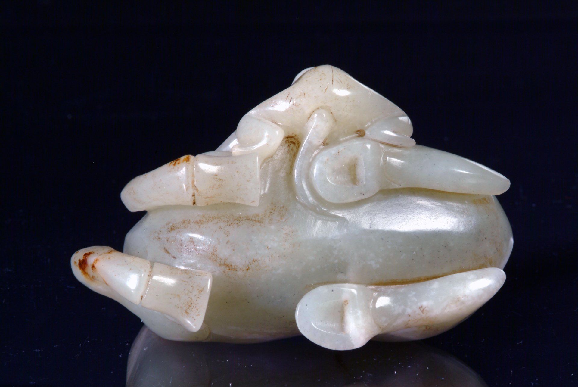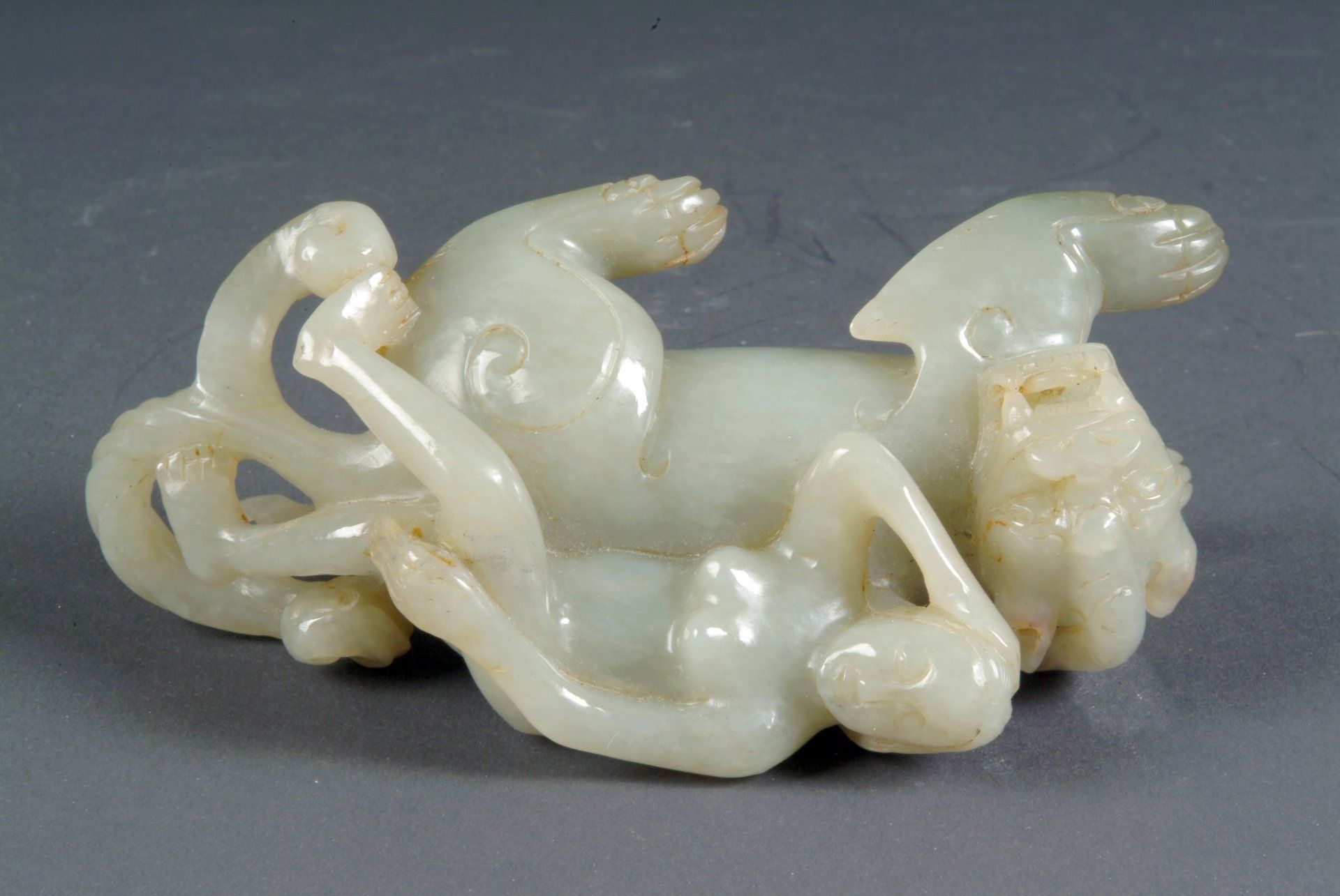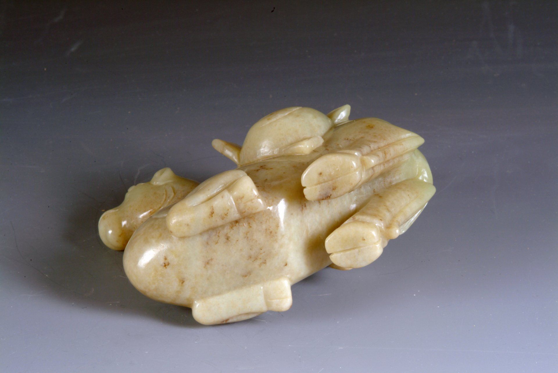 Ming-Dynastie: Liegendes Fabelwesen aus hellem Celadon mit fünf giftigen Kreaturen. Charakteristisch sind die markanten bräunlichen Einschlüsse und der auf das Alter des Objekts hinweisende Schnitzstil. Das Objekt ist etwa 10 cm lang.