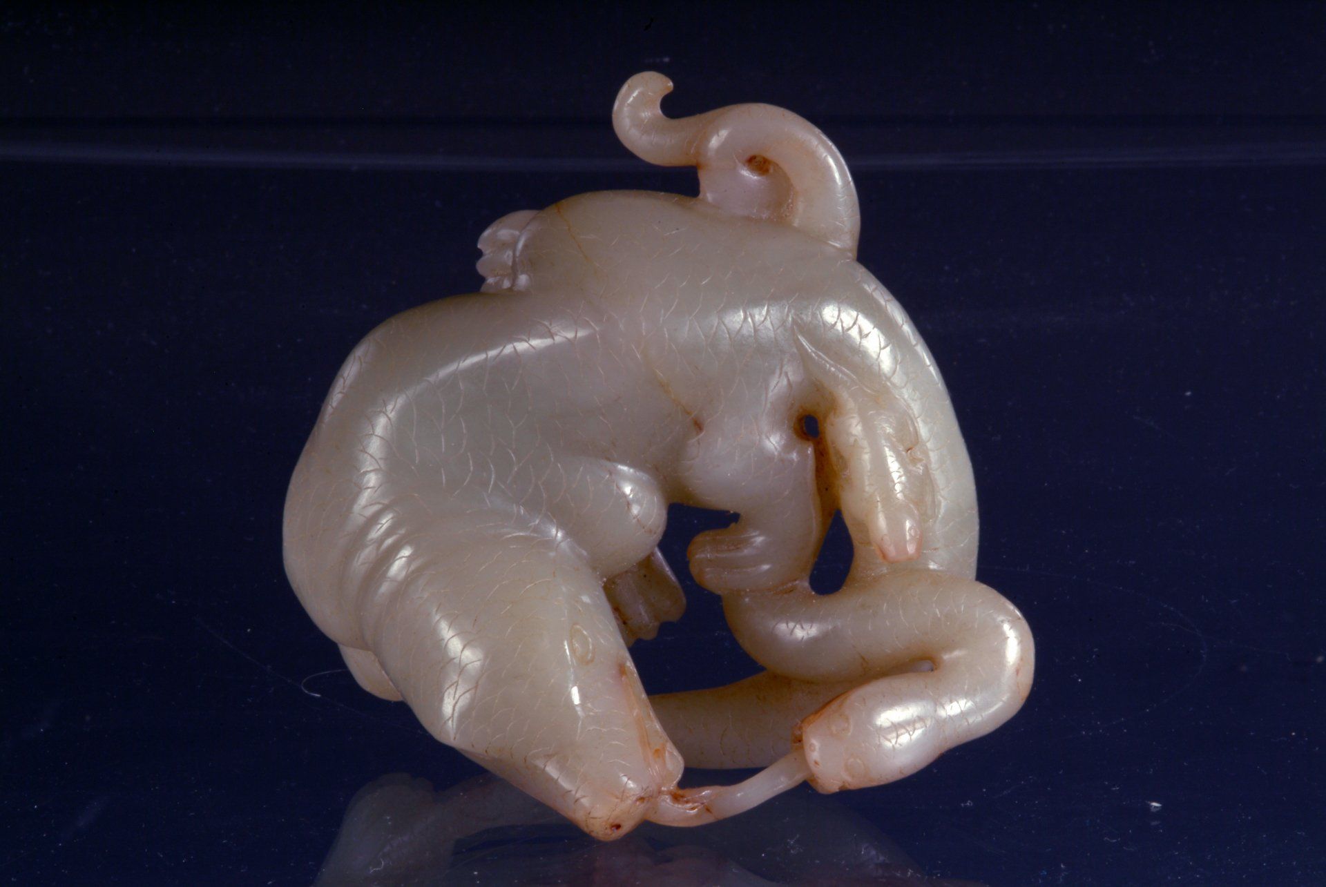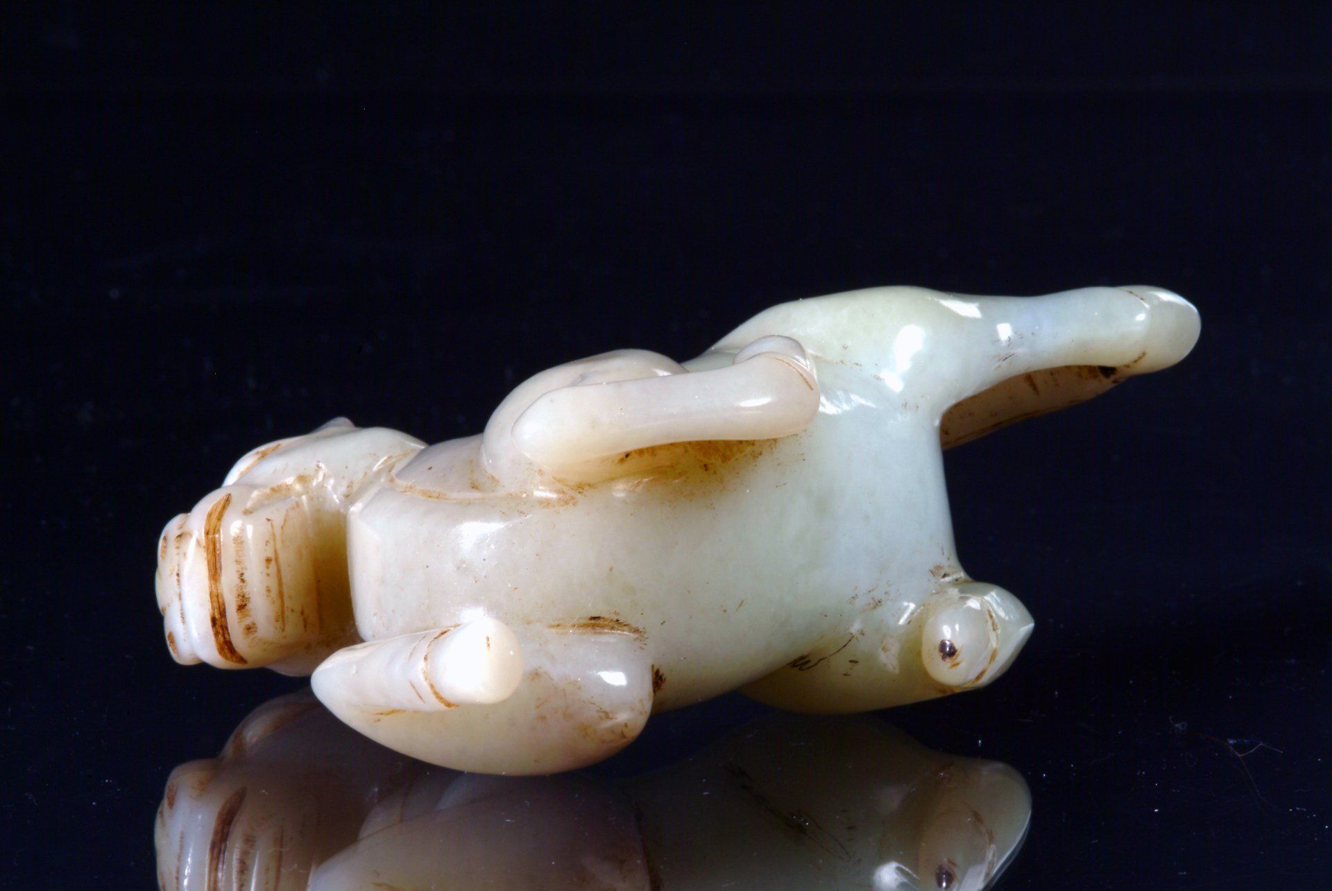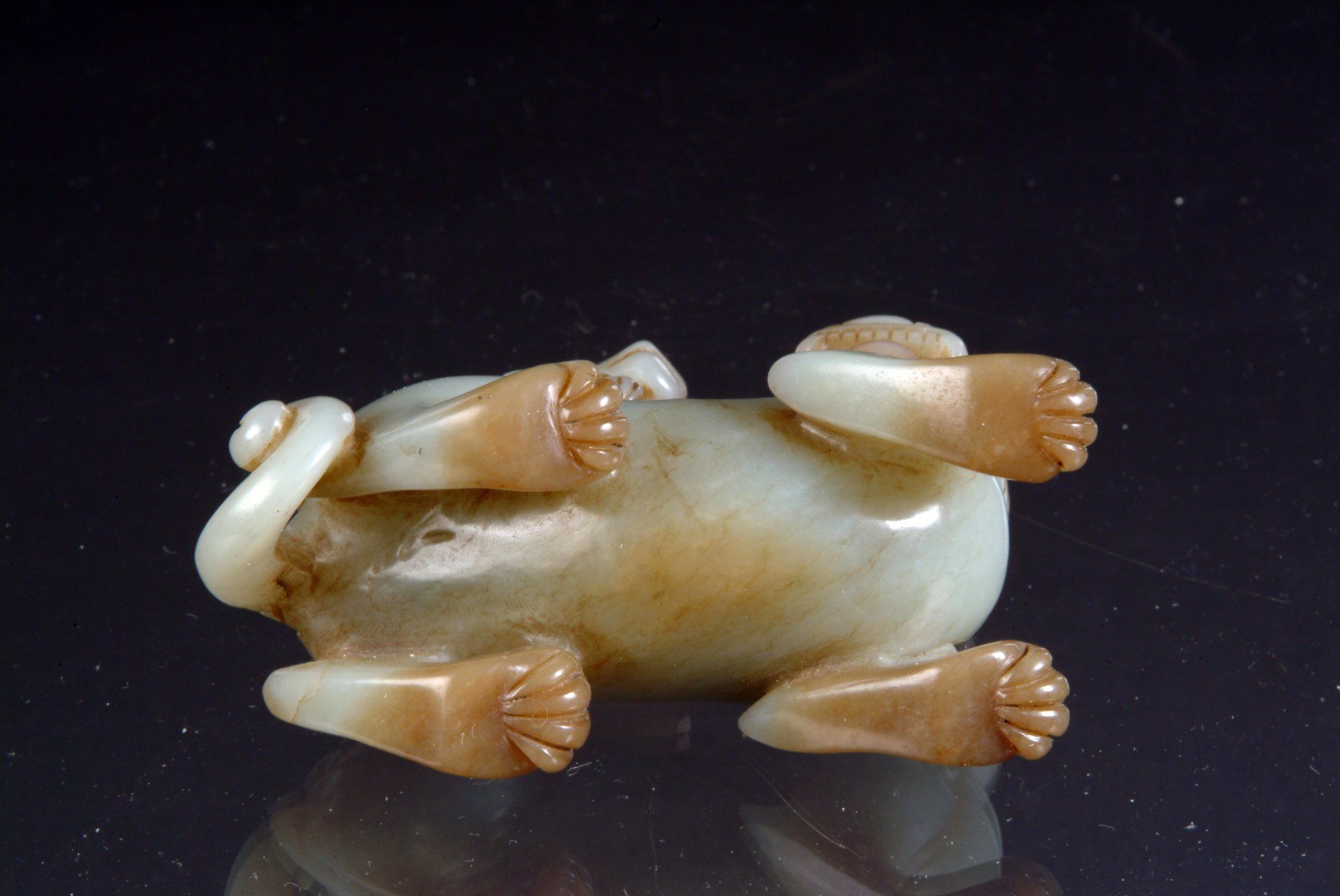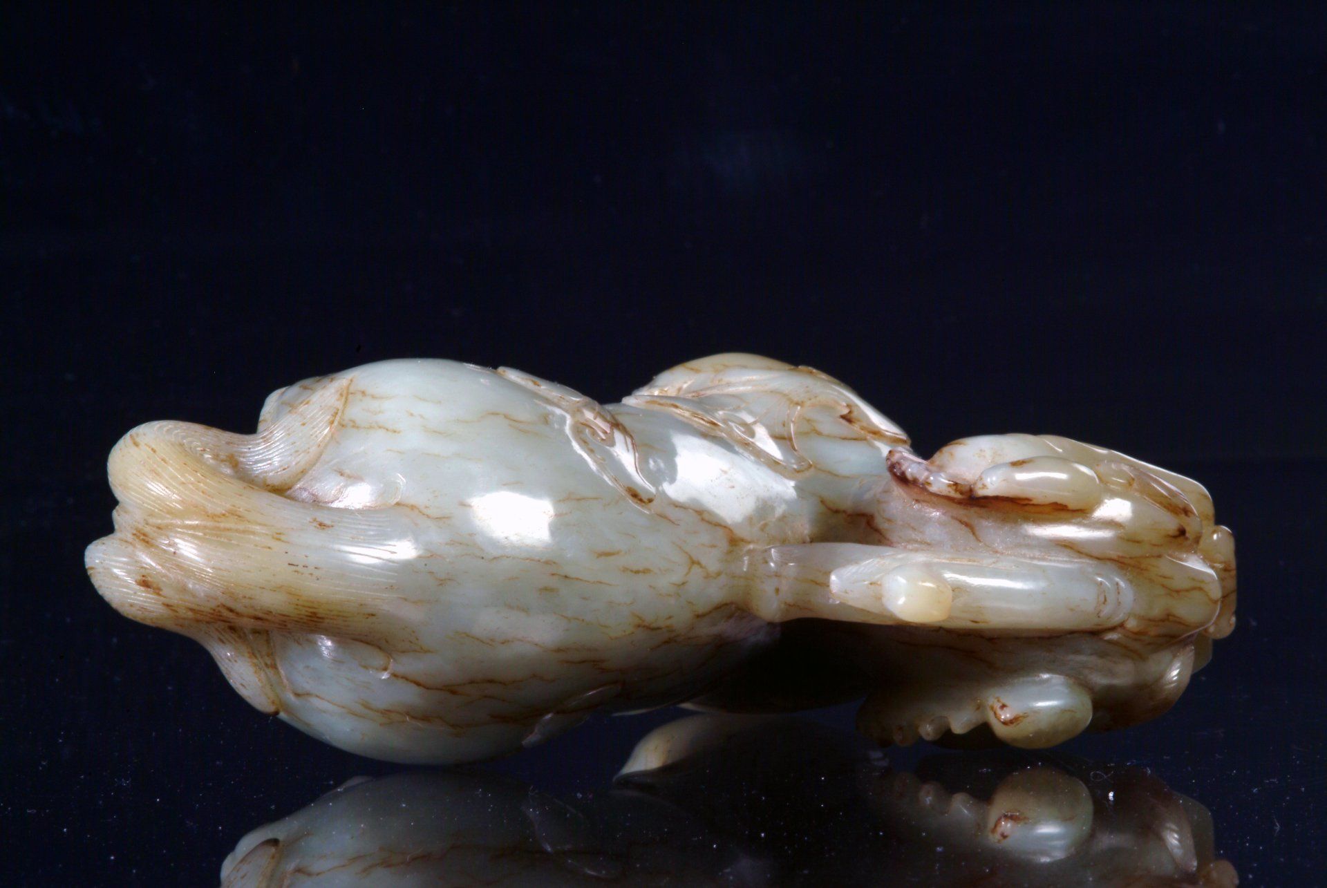 Ming-Dynastie: Liegendes Fabelwesen aus hellem Celadon mit fünf giftigen Kreaturen. Charakteristisch sind die markanten bräunlichen Einschlüsse und der auf das Alter des Objekts hinweisende Schnitzstil. Das Objekt ist etwa 10 cm lang.