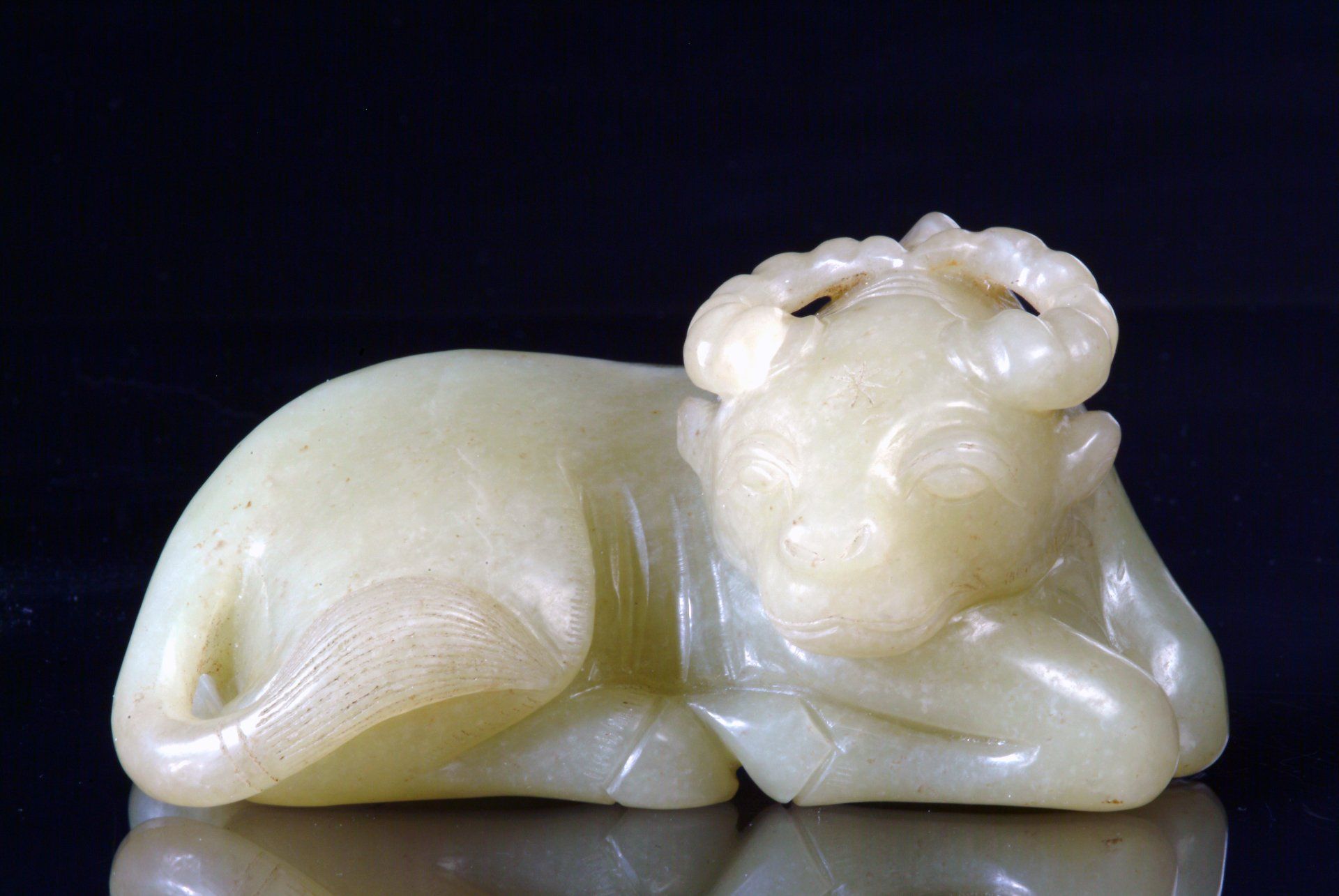 Liegender Widder aus graugrünem Jade aus der Ming-Dynastie