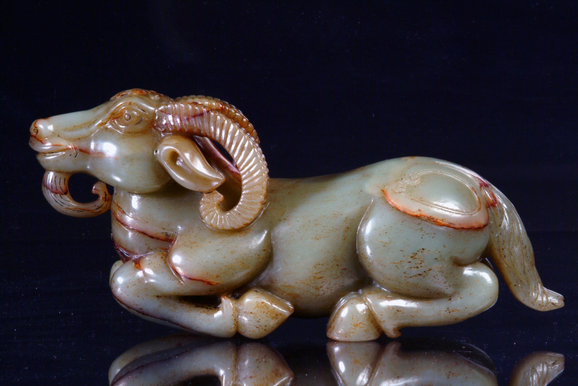 Diese kunstvoll aus Seladonjade gefertigte Statue aus der Ming-Dynastie zeigt einen Widder mit zurückgewandtem Babykopf, der Münzen im Maul hält. Die Skulptur weist trübe Einschlüsse und einen Schnitzstil auf, der ihr Alter belegt. Sie ist etwa 11,5 cm lang.