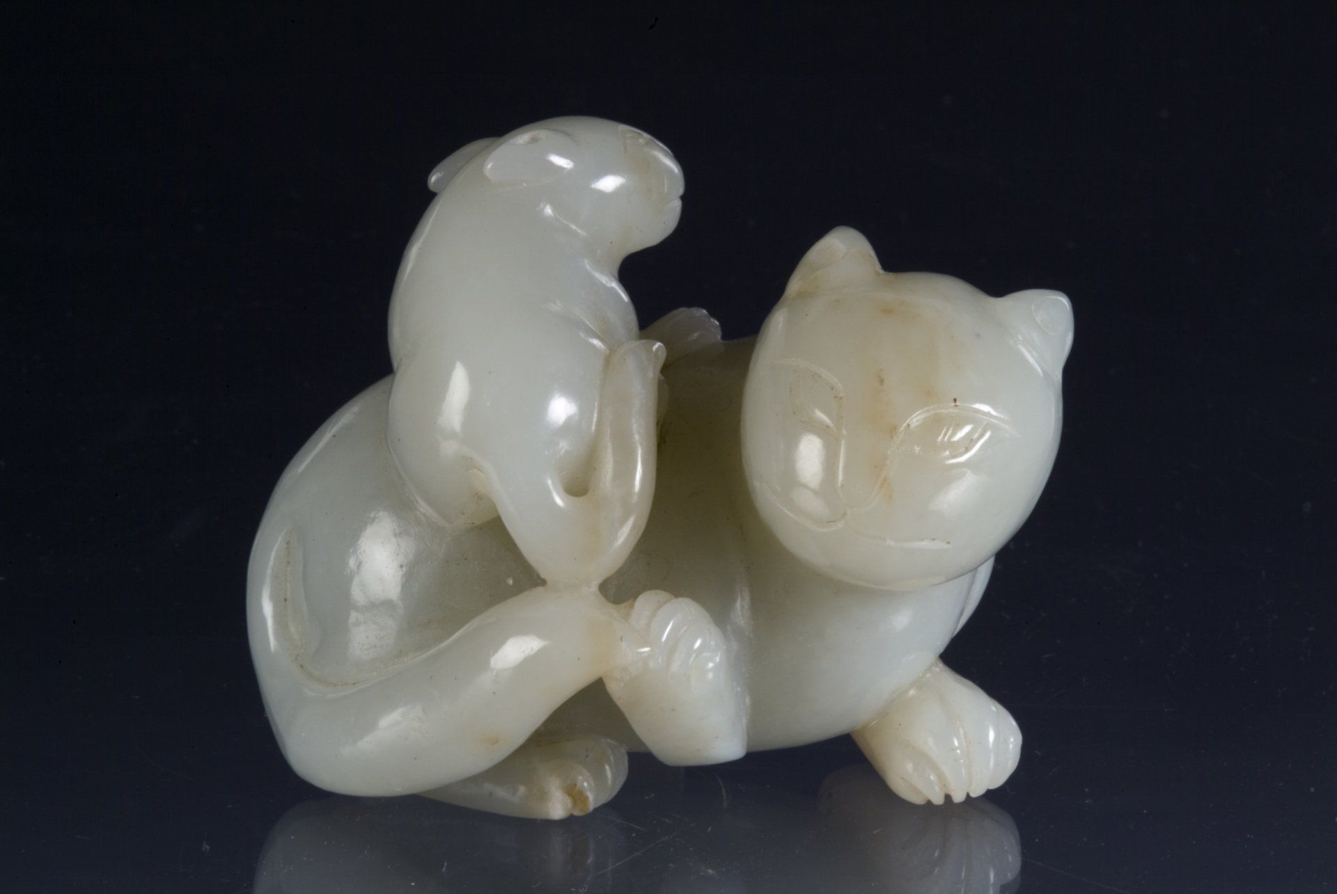 Katzen-Gruppenskulptur aus weißem Jade aus der Ming-Dynastie mit einem Kätzchen