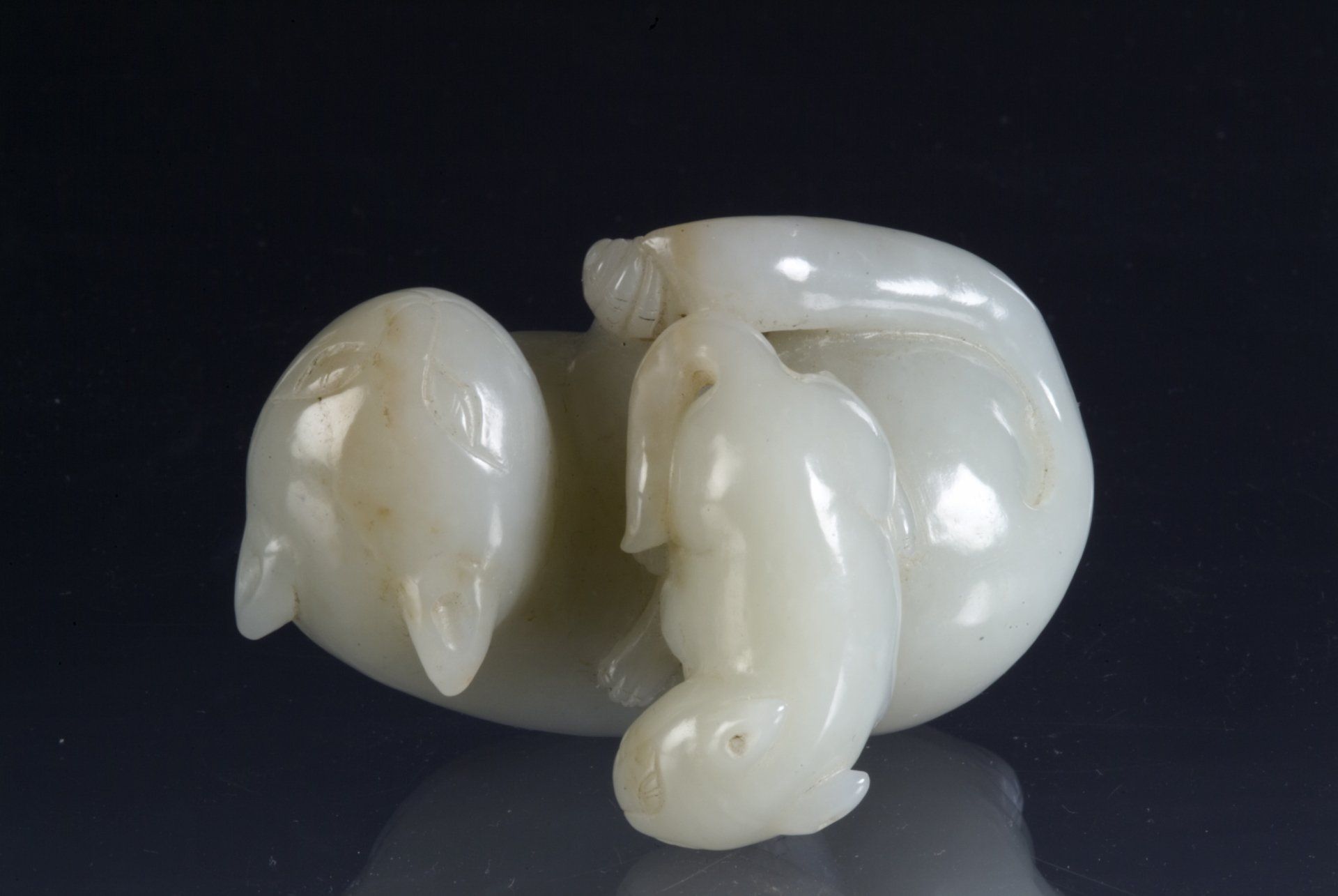 Diese fein gearbeitete Statue aus weißer Jade stellt drei liegende Widder aus der Ming-Dynastie dar. Sie weist altersbedingte Trübungen sowie Gebrauchsspuren und einen für die Epoche typischen Schnitzstil auf. Die Statue ist etwa 7,3 cm breit.