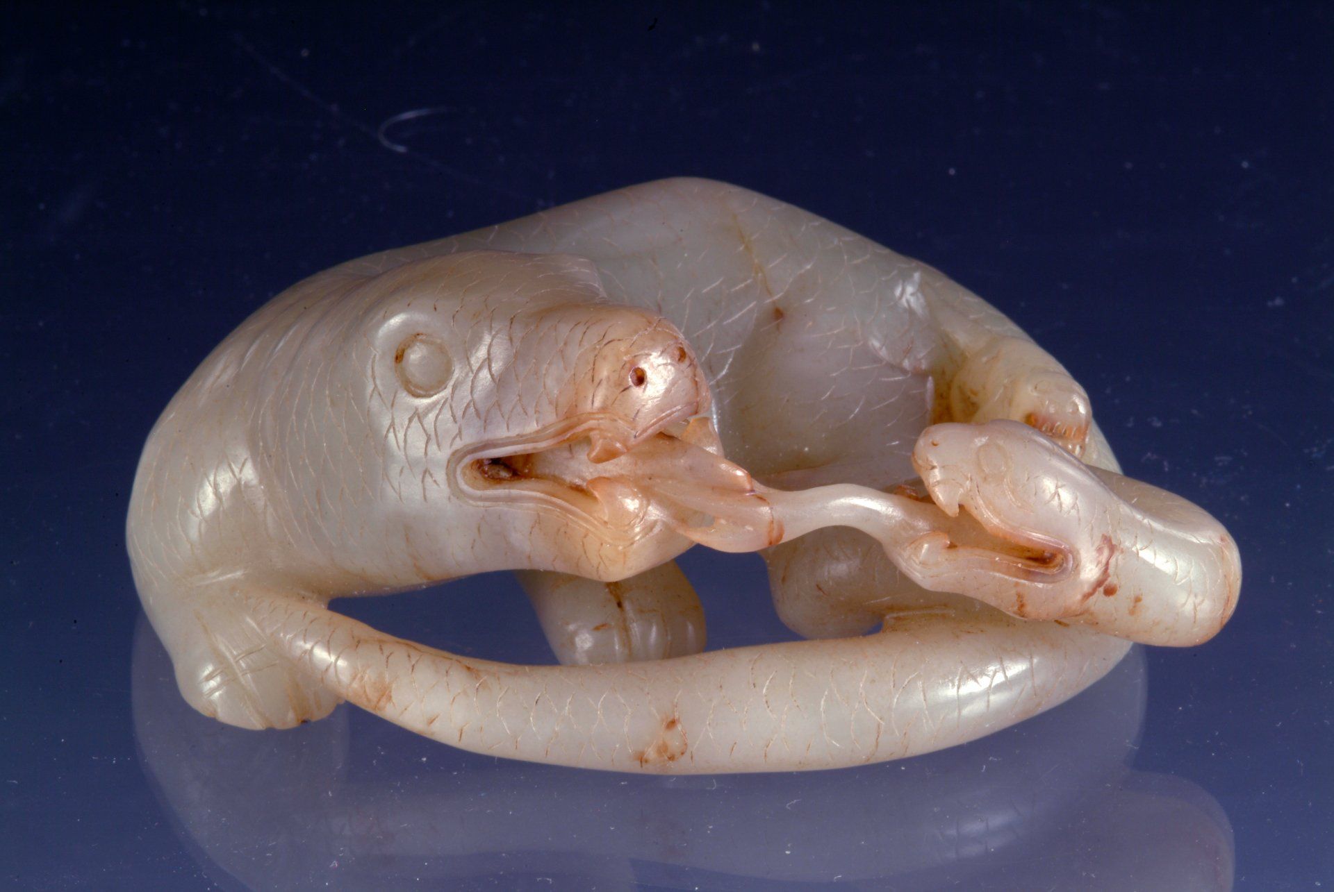 Grauweiße Eidechsenskulptur aus der Ming-Dynastie, begleitet von einem Säugling und einer Schlange