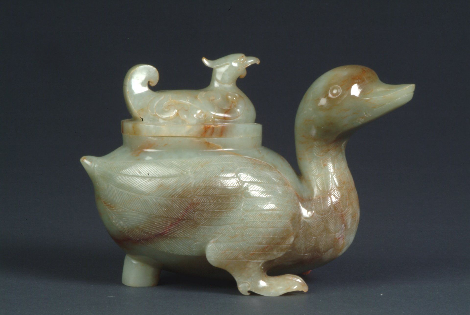 Diese fein gearbeitete Entenstatue aus Celadon-Jade aus der Ming-Dynastie zeigt ein Drachenkopfmotiv. Charakteristische bräunliche Einschlüsse und rotbraune Streifen unterstreichen ihre historische Bedeutung. Die Statue ist etwa 11,5 cm hoch.
