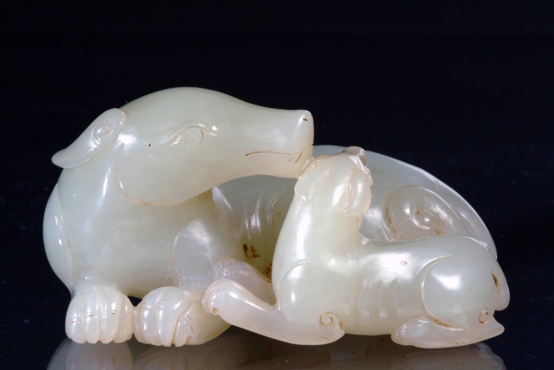 Weiße Jade-Skulptur eines Büffels mit Kalb aus der Qing-Dynastie
