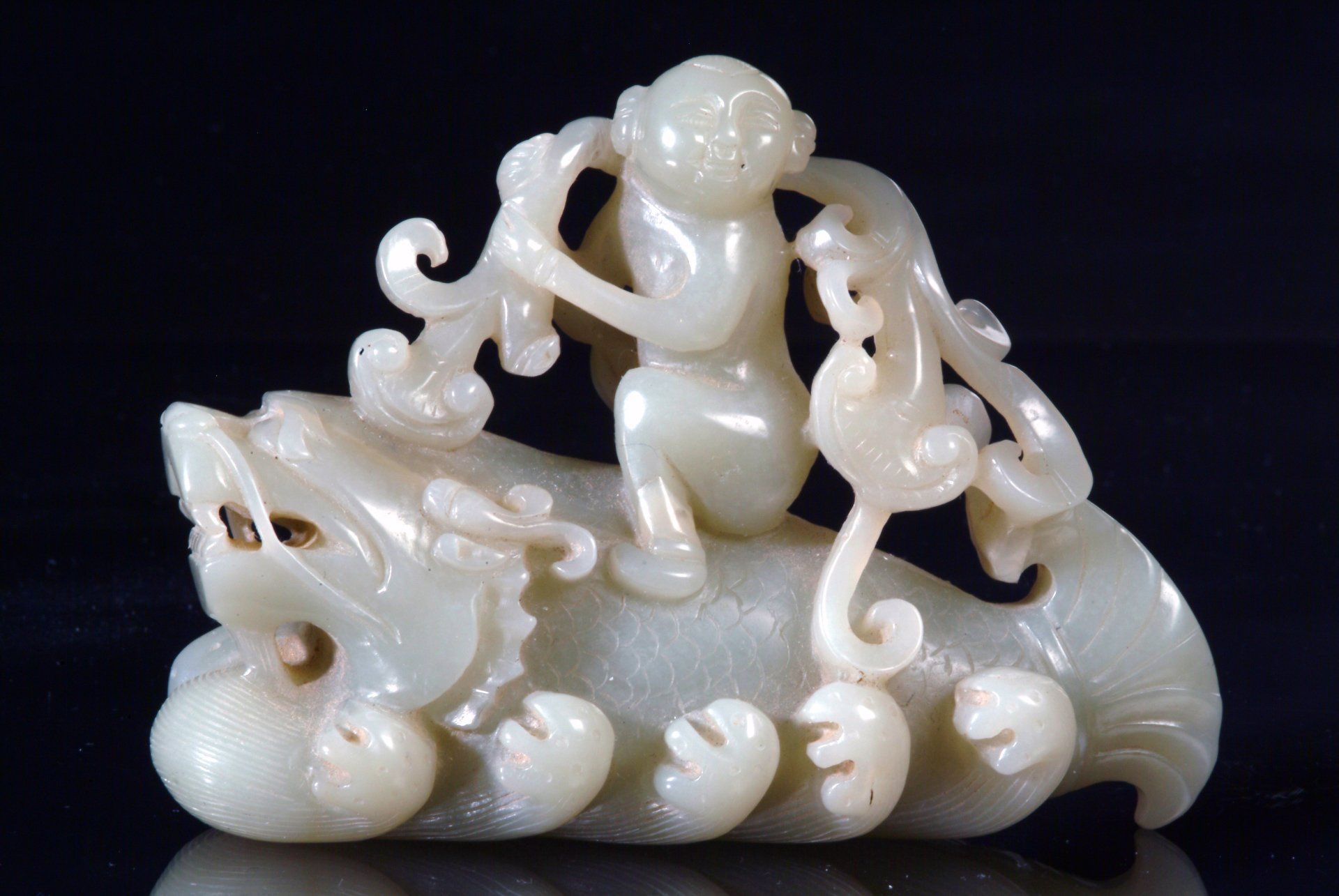 Mythischer Fisch aus grau-weißem Jade der Qing-Dynastie, begleitet von einer Knabenfigur