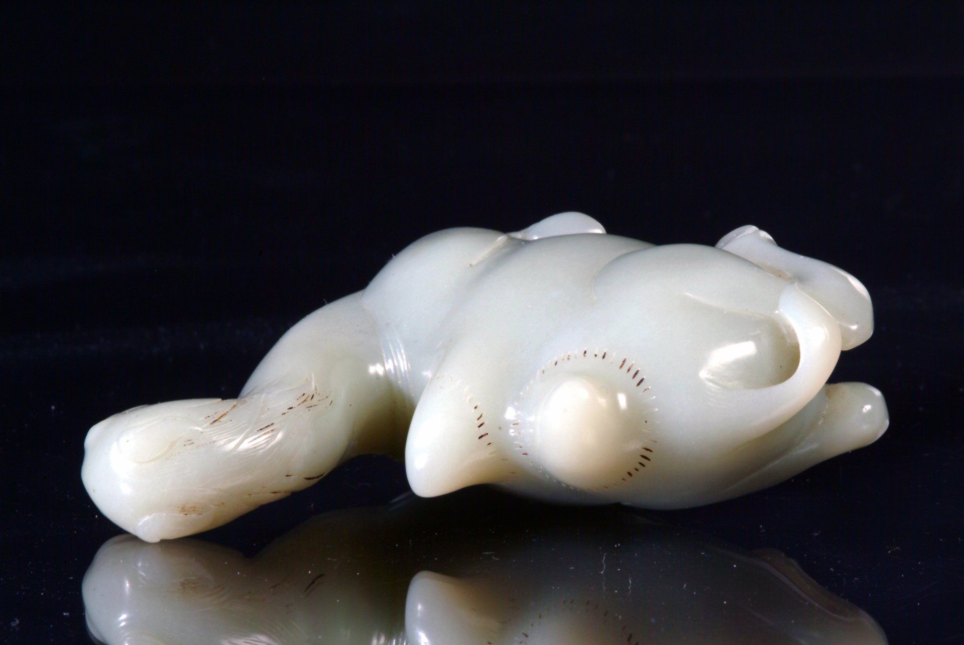 Diese kunstvoll gearbeitete, dreibeinige Froschstatue aus durchscheinendem, hellgrauem Jade aus der Qing-Dynastie ist ein herausragendes Beispiel für die Kunstfertigkeit ihrer Zeit. Der Jade weist eine bemerkenswerte Transparenz auf, mit fein gemusterten Adern und dezenten Trübungen, die sein hohes Alter belegen. Die Statue ist etwa 7,6 cm lang.