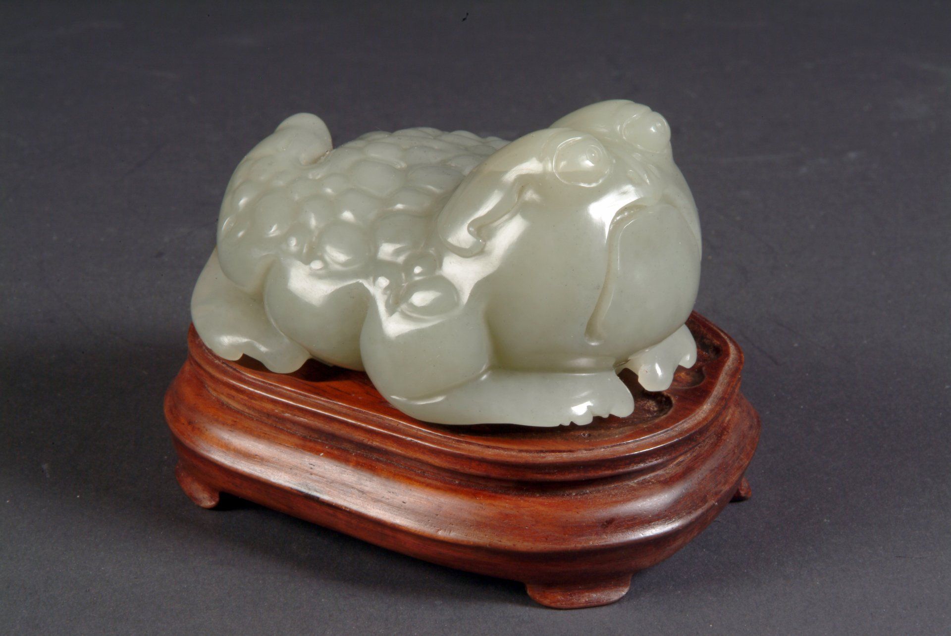 Dreibeinige Froschskulptur aus durchscheinendem, hellgrauem Jade aus der Qing-Dynastie