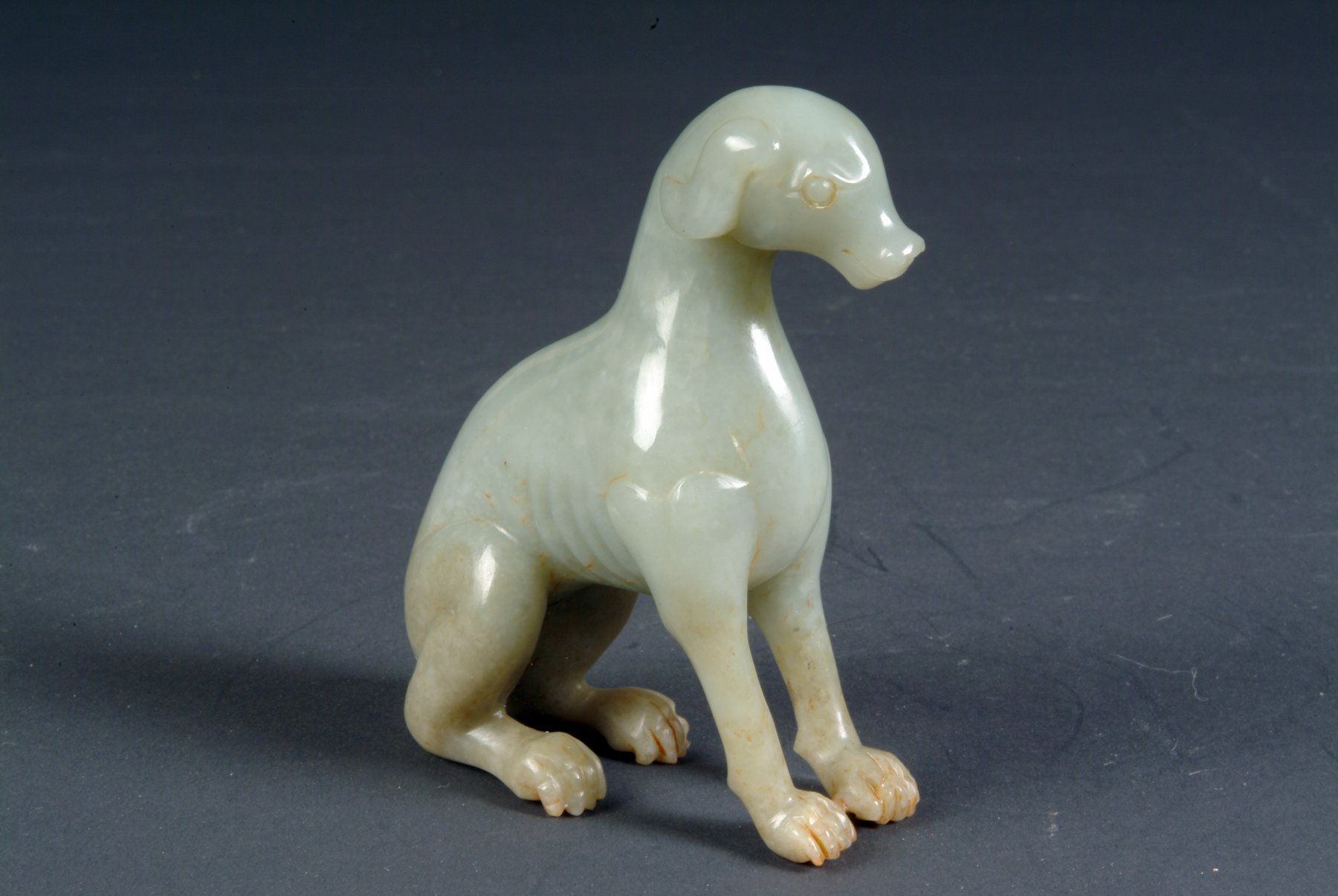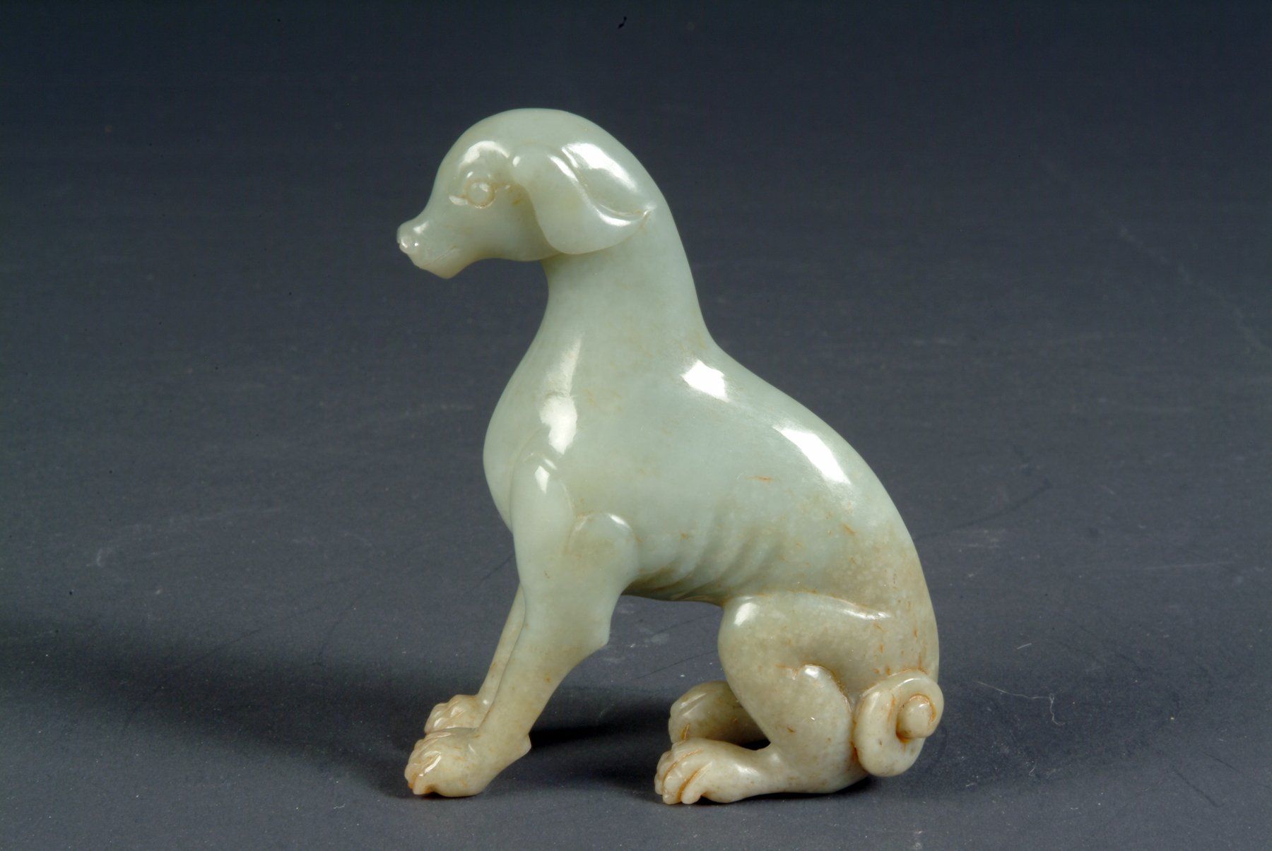 Skulptur eines sitzenden Hundes aus hellgrauer Jade aus der Qing-Dynastie