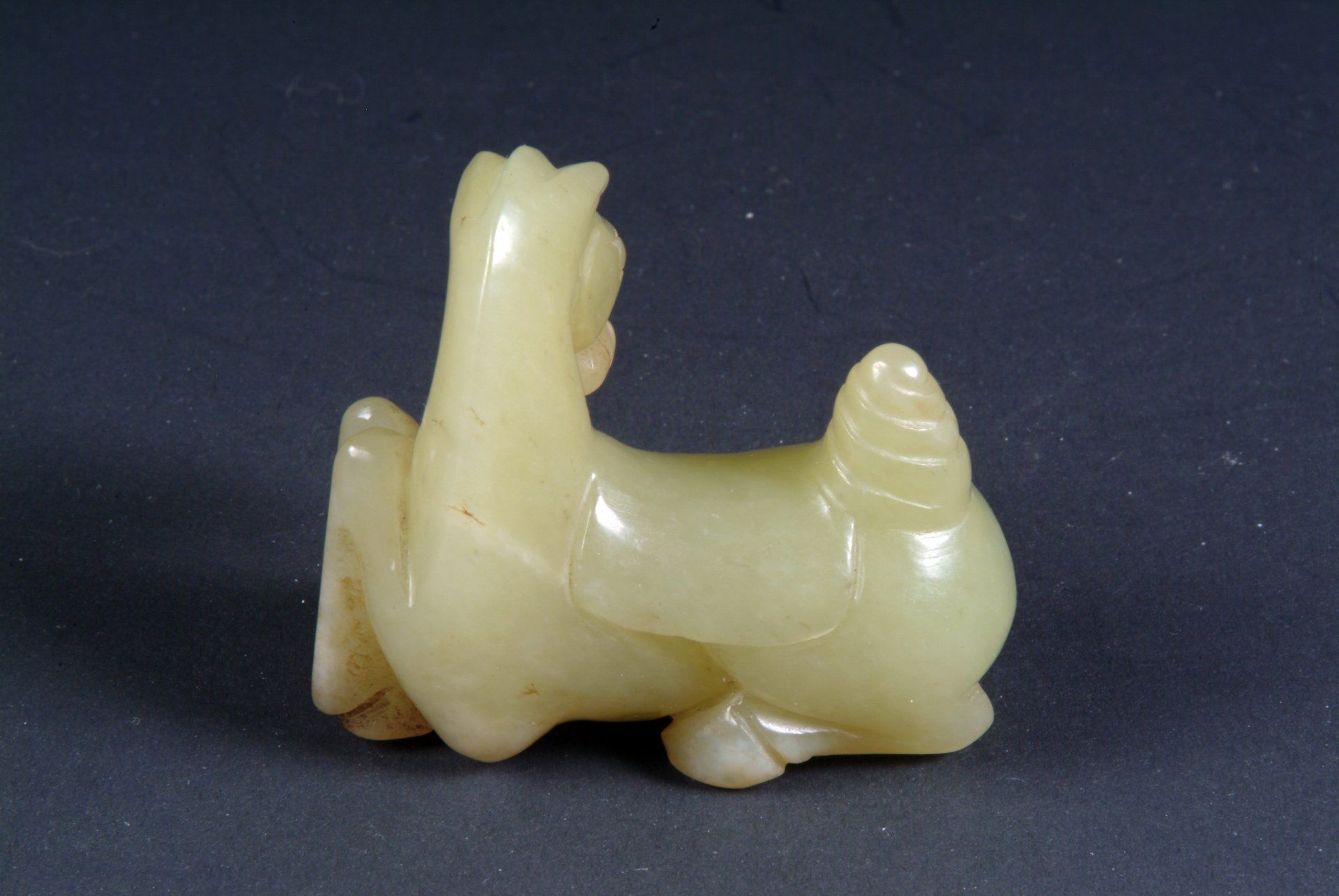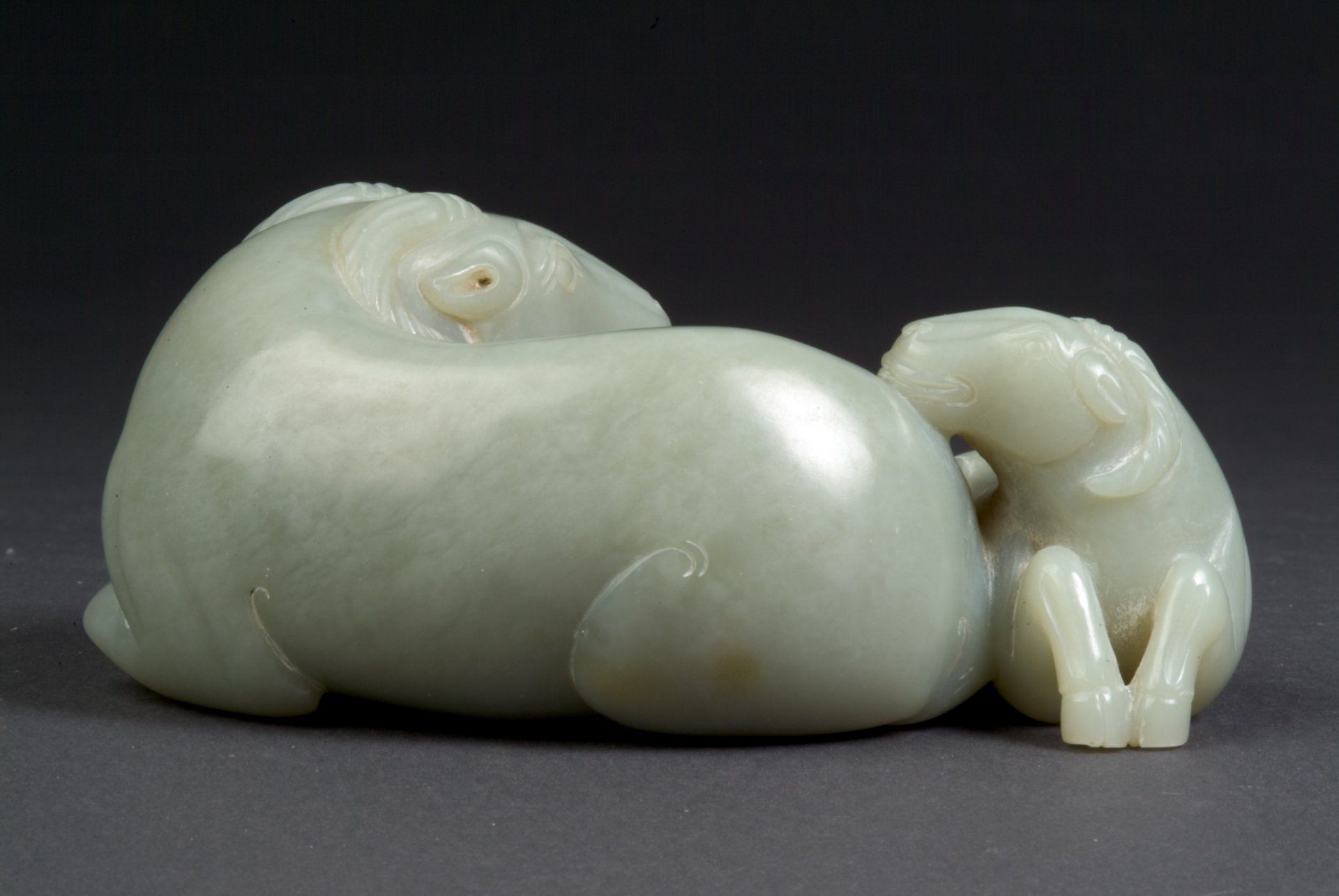 Diese kunstvoll gearbeitete, grünlich-graue Jadeskulptur aus der Qing-Dynastie zeigt ein Pferd mit einem Affen. Besonders auffällig sind die braunen Farbtöne im Affen selbst. Die angewandte Kunstfertigkeit und Schnitztechnik bestätigen eindeutig die Entstehungszeit der Skulptur. Die Gesamtlänge beträgt ca. 9,5 cm.