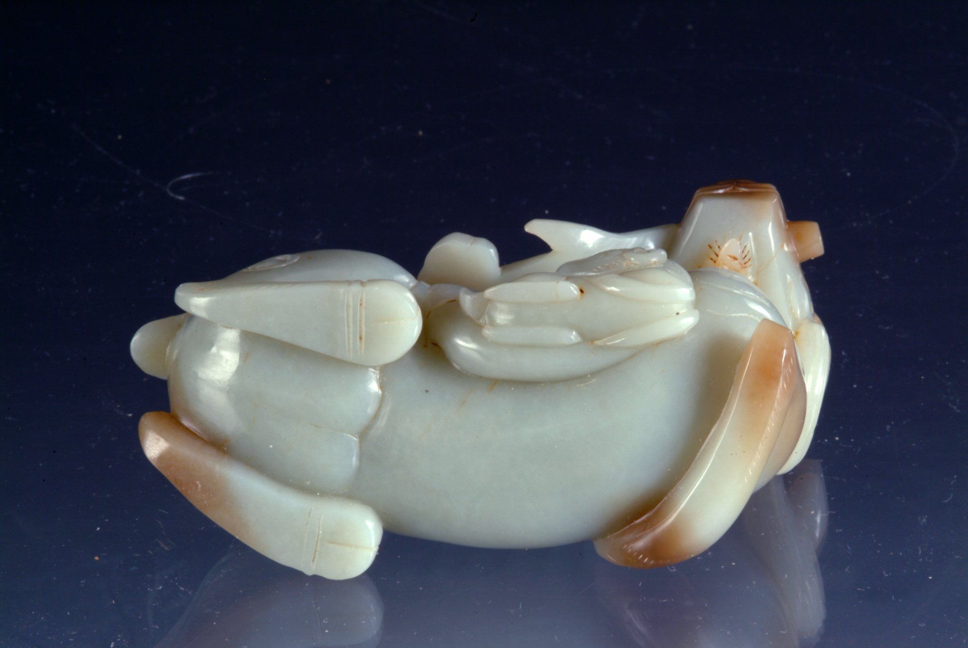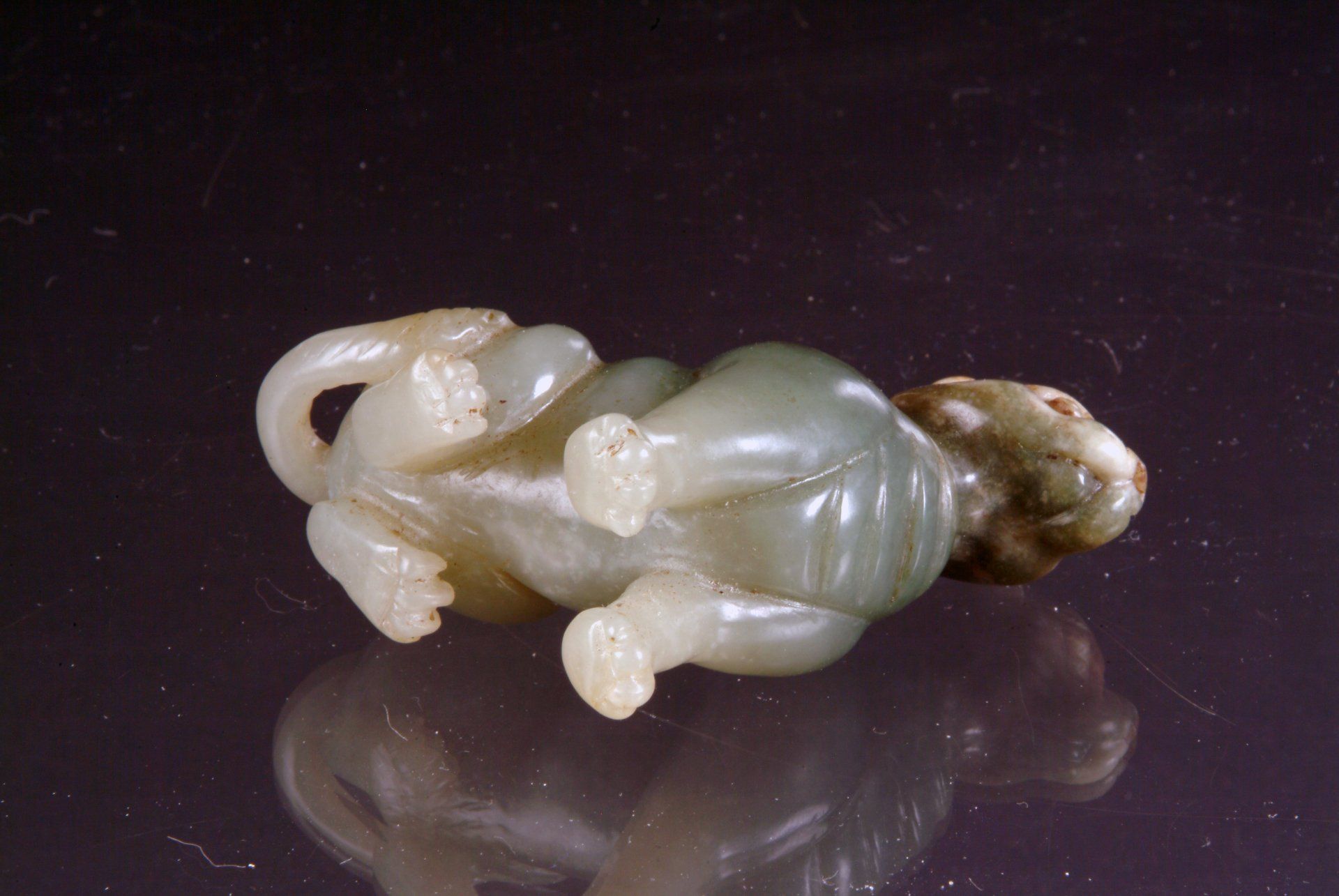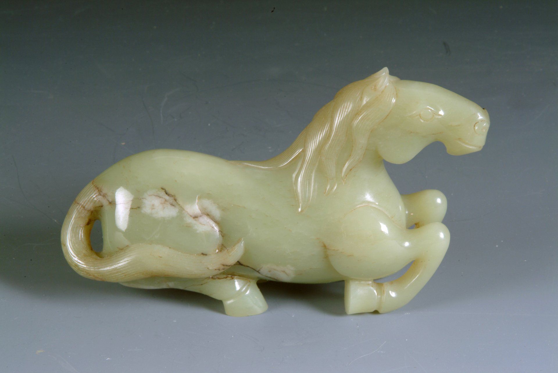 Diese kunstvoll gearbeitete, ruhende Pferdestatue aus der Zeit der Sechs Dynastien ist aus grauweißem Jade gefertigt. Ihre großflächigen bräunlichen Verfärbungen und Trübungen belegen ihre historische Bedeutung und ihr hohes Alter. Die Statue ist etwa 12,5 cm lang.