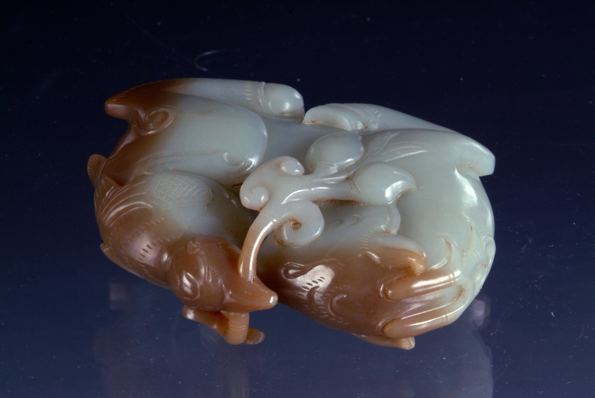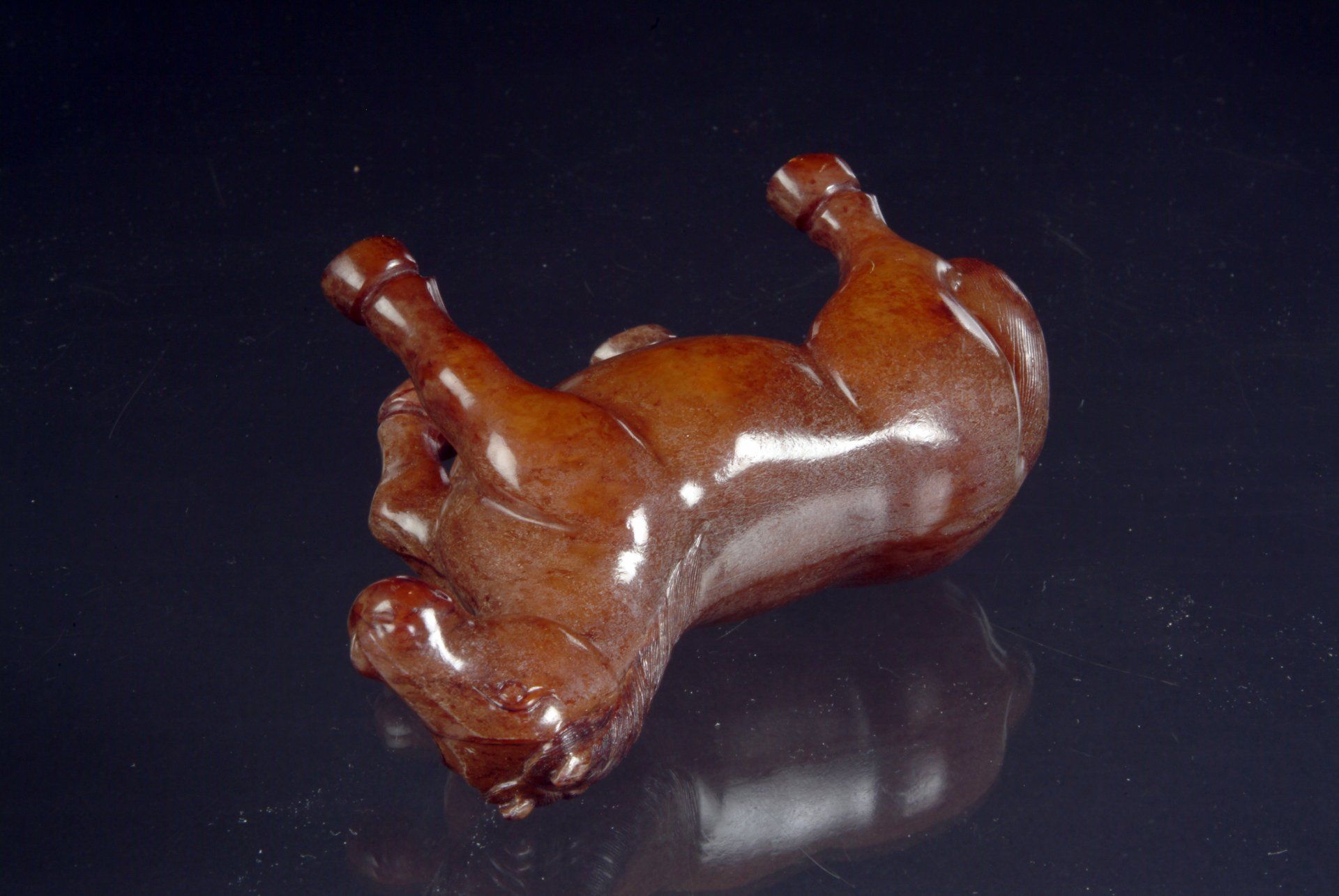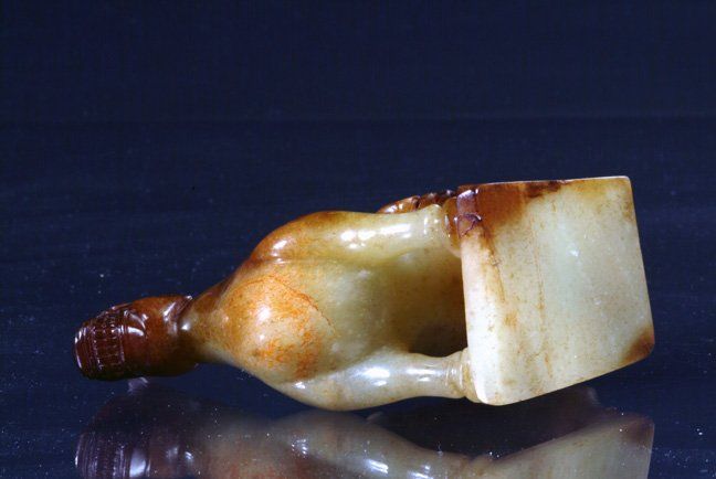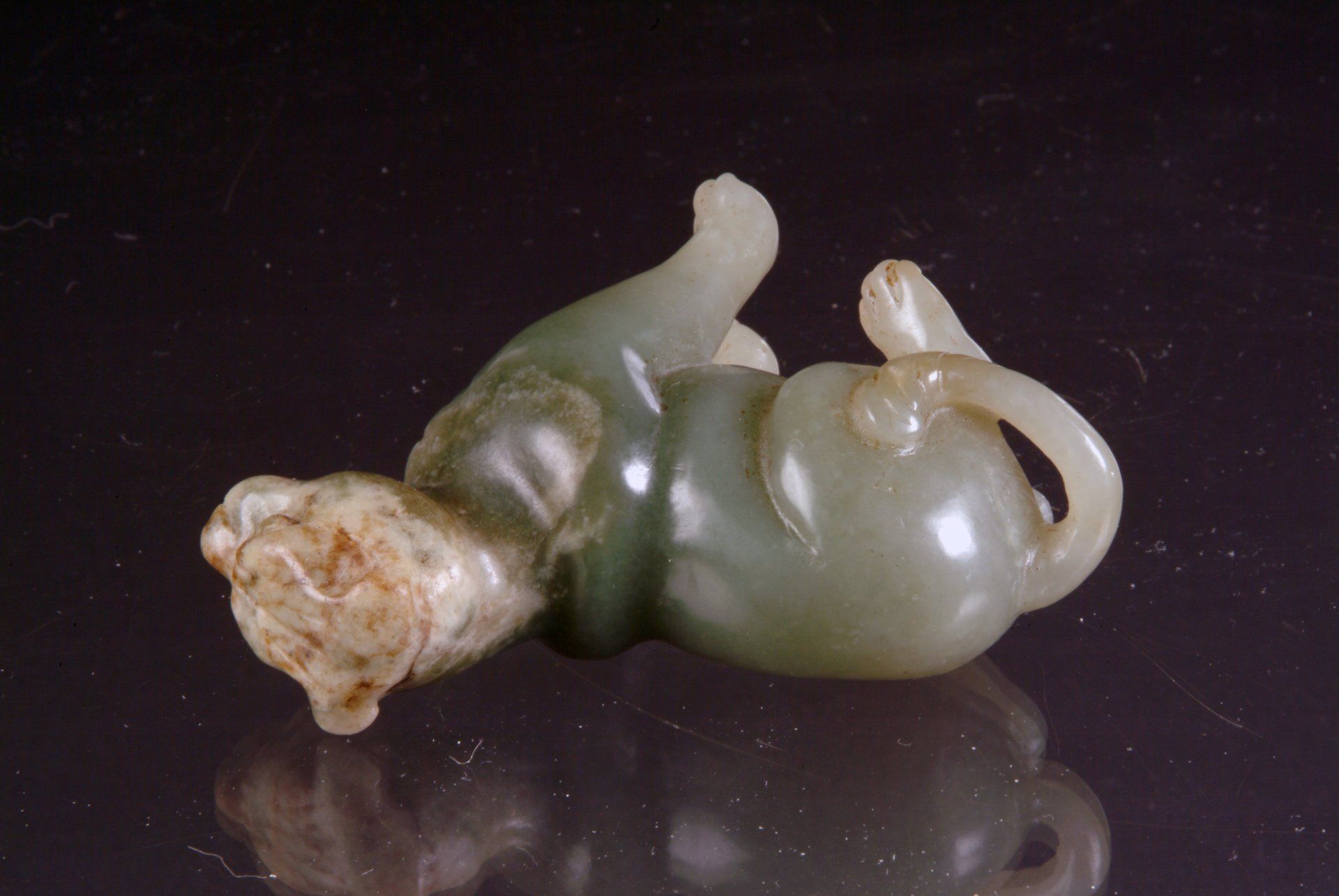 Diese kunstvoll gearbeitete, ruhende Pferdestatue aus der Zeit der Sechs Dynastien ist aus grauweißem Jade gefertigt. Ihre großflächigen bräunlichen Verfärbungen und Trübungen belegen ihre historische Bedeutung und ihr hohes Alter. Die Statue ist etwa 12,5 cm lang.