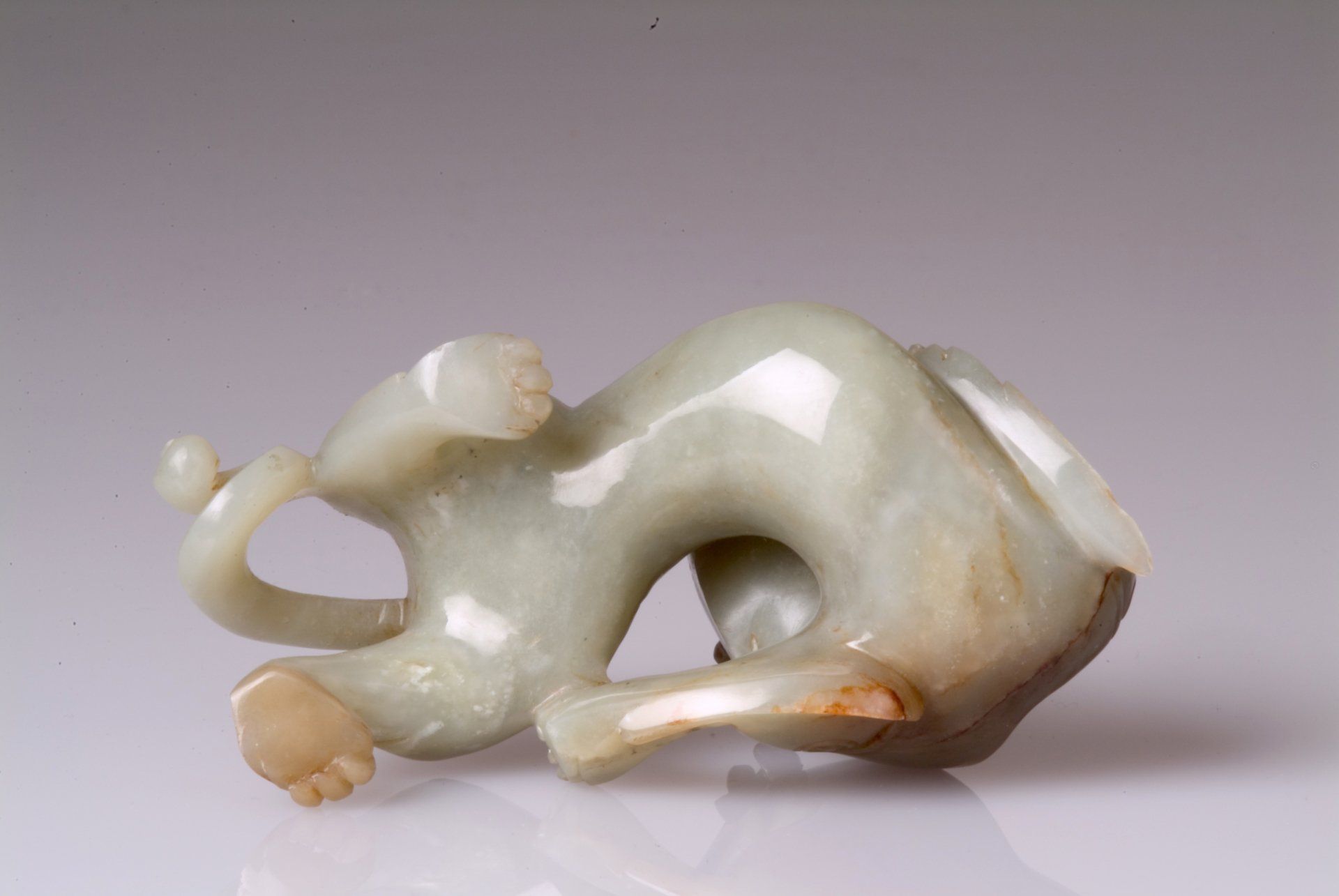 Diese kunstvoll gearbeitete Statue aus graugrünem Jade der Sechs Dynastien zeigt ein filigranes, mythisches Tiermotiv, das sich durch markante braune und rotbraune Einschlüsse auszeichnet. Die detailreiche Schnitzkunst belegt ihre historische Herkunft. Die Statue ist etwa 11,5 cm lang.
