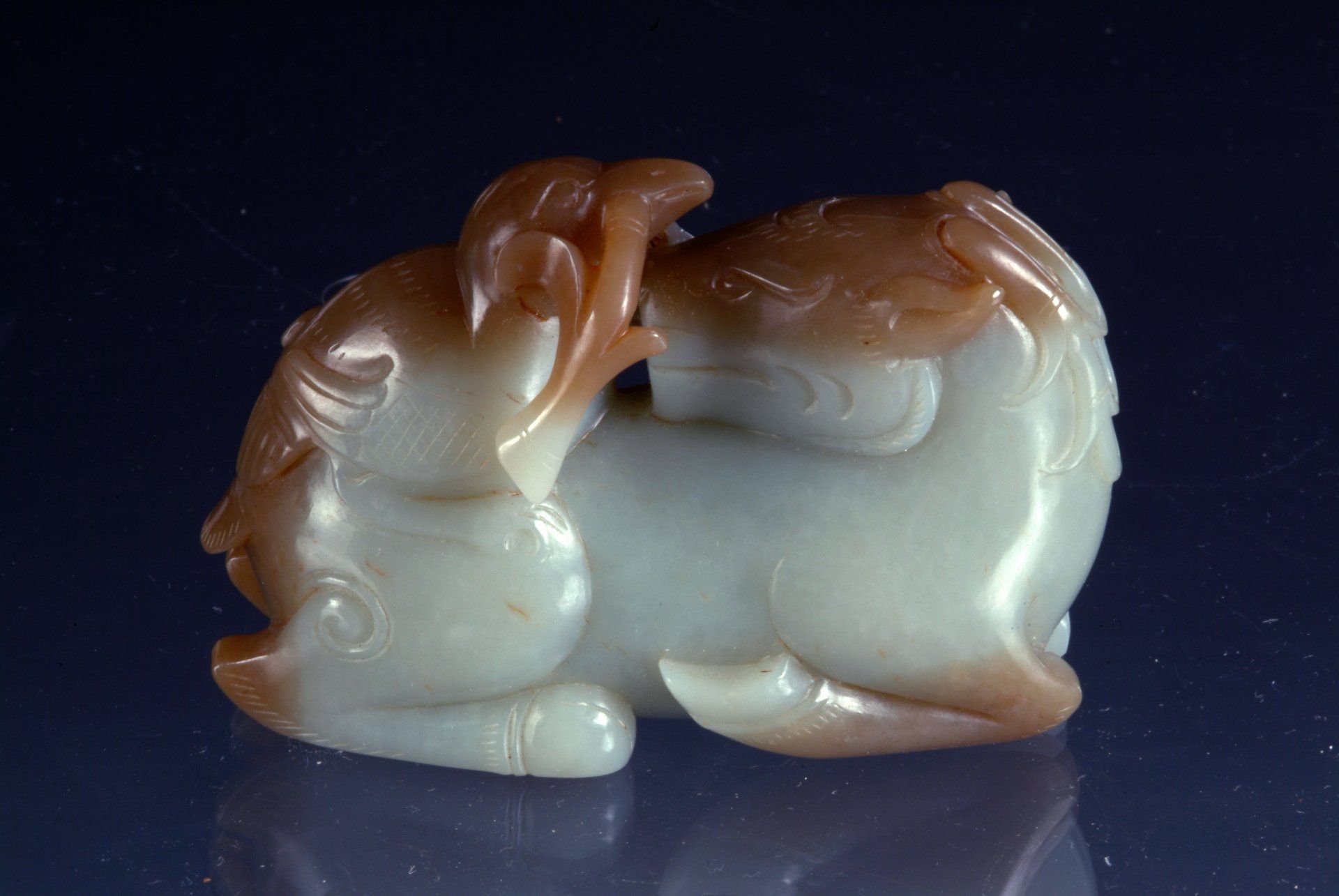 Statue eines ruhenden Hirsches mit Vogel aus graugrünem Jade aus der Zeit der Sechs Dynastien
