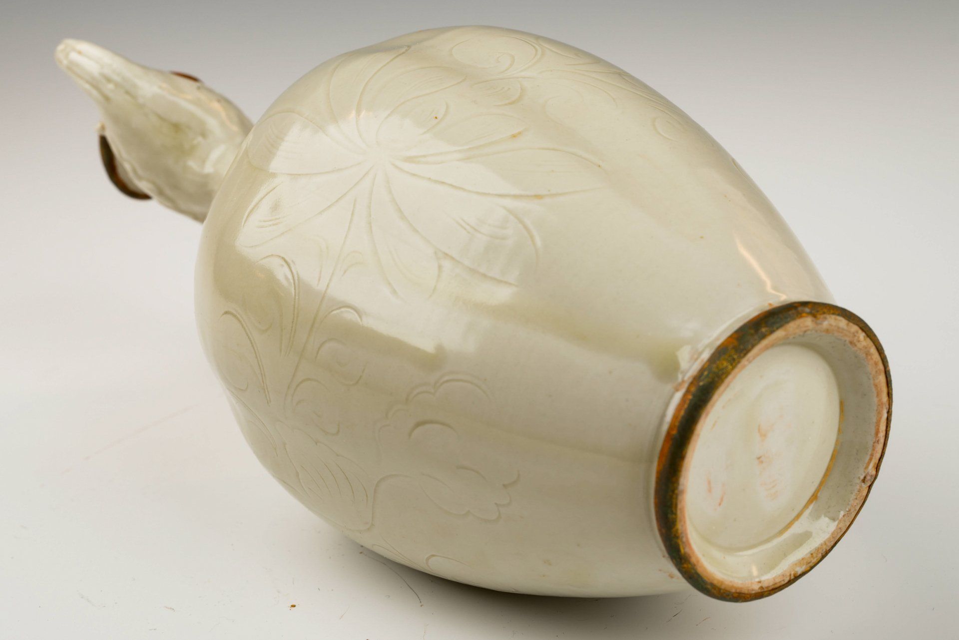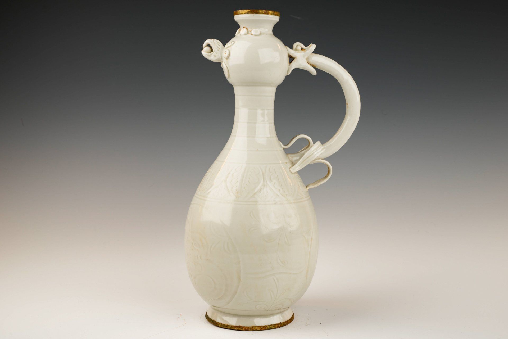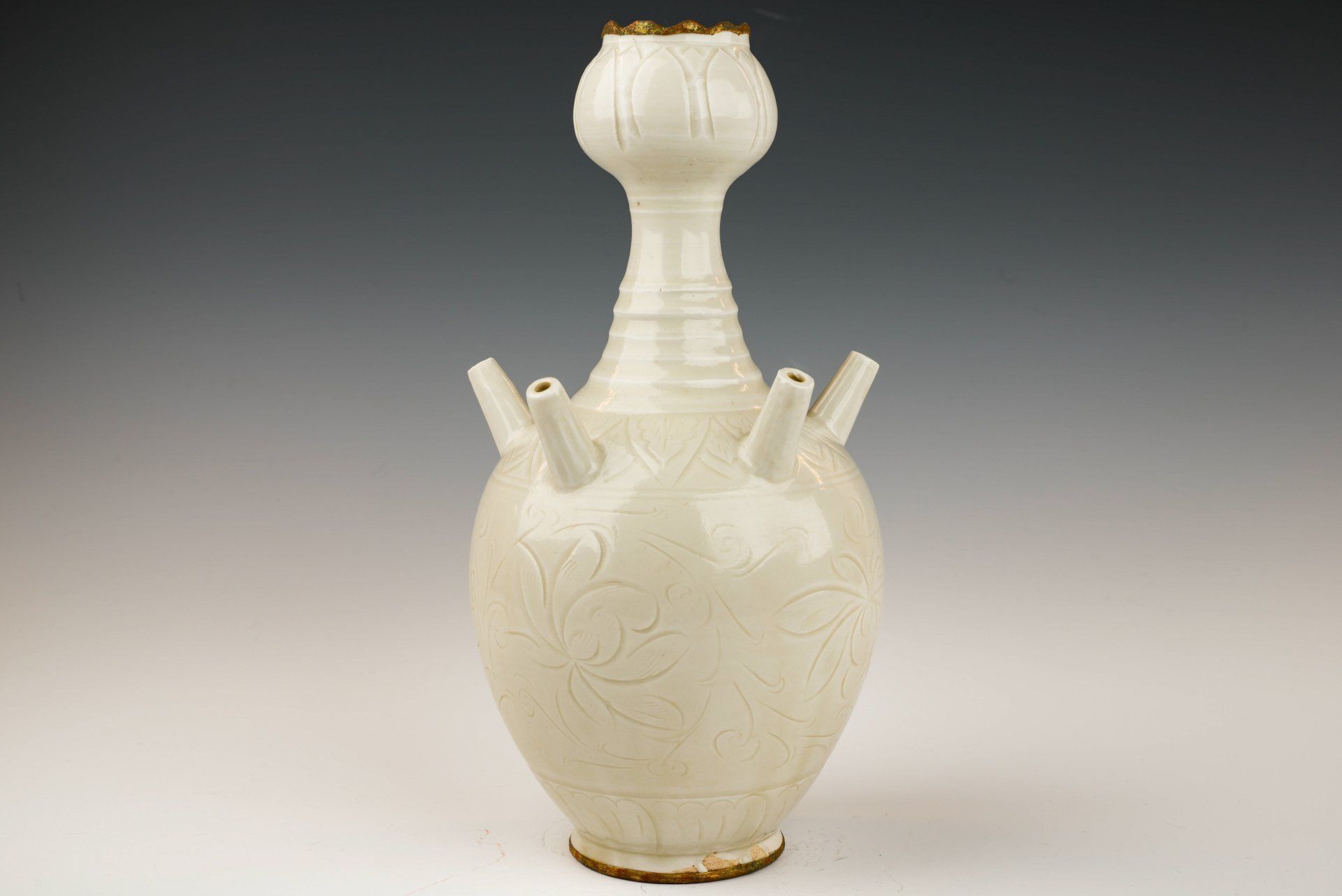 Das weiße, aus dem Ding-Ofen der Nördlichen Song-Dynastie stammende kaiserliche Kundika-Gefäß zeichnet sich durch seine dekorativen floralen Motive aus, die den Korpus umgeben. Es ist mit einer elfenbeinfarbenen, durchscheinenden Glasur auf einem cremeweißen Untergrund verziert, in der deutliche Tränenstreifen sichtbar sind. Die feuervergoldeten Bänder, die sowohl den Rand als auch den Boden schmücken, weisen Porosität auf und sind von rötlichem Cuprit und grünlicher, traubenförmiger Malachitkorrosion durchzogen, was auf die poröse Beschaffenheit der Vergoldung zurückzuführen ist. Diese Korrosion dient als Beleg für das Alter des Gefäßes und gilt als zuverlässiger als die Thermolumineszenzprüfung (TL), da sie von Experten als Kriterium für die Authentifizierung historischer Artefakte anerkannt ist. Das Gefäß ist unmarkiert, was aufgrund der feuervergoldeten Bänder darauf hindeutet, dass es sich möglicherweise um ein Tributstück handelt. Die Höhe des Gefäßes beträgt etwa 32,4 cm (12 3/4 Zoll).