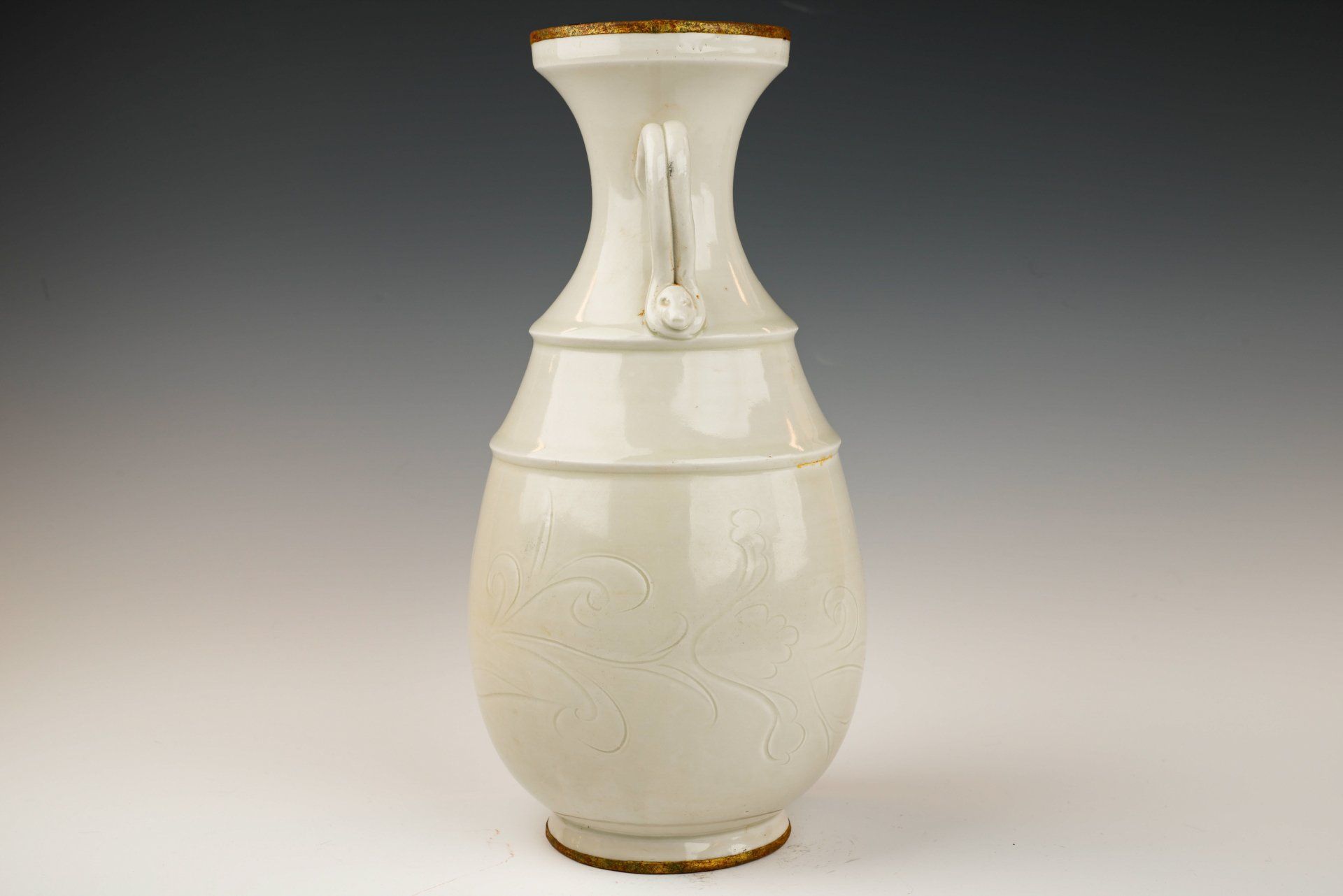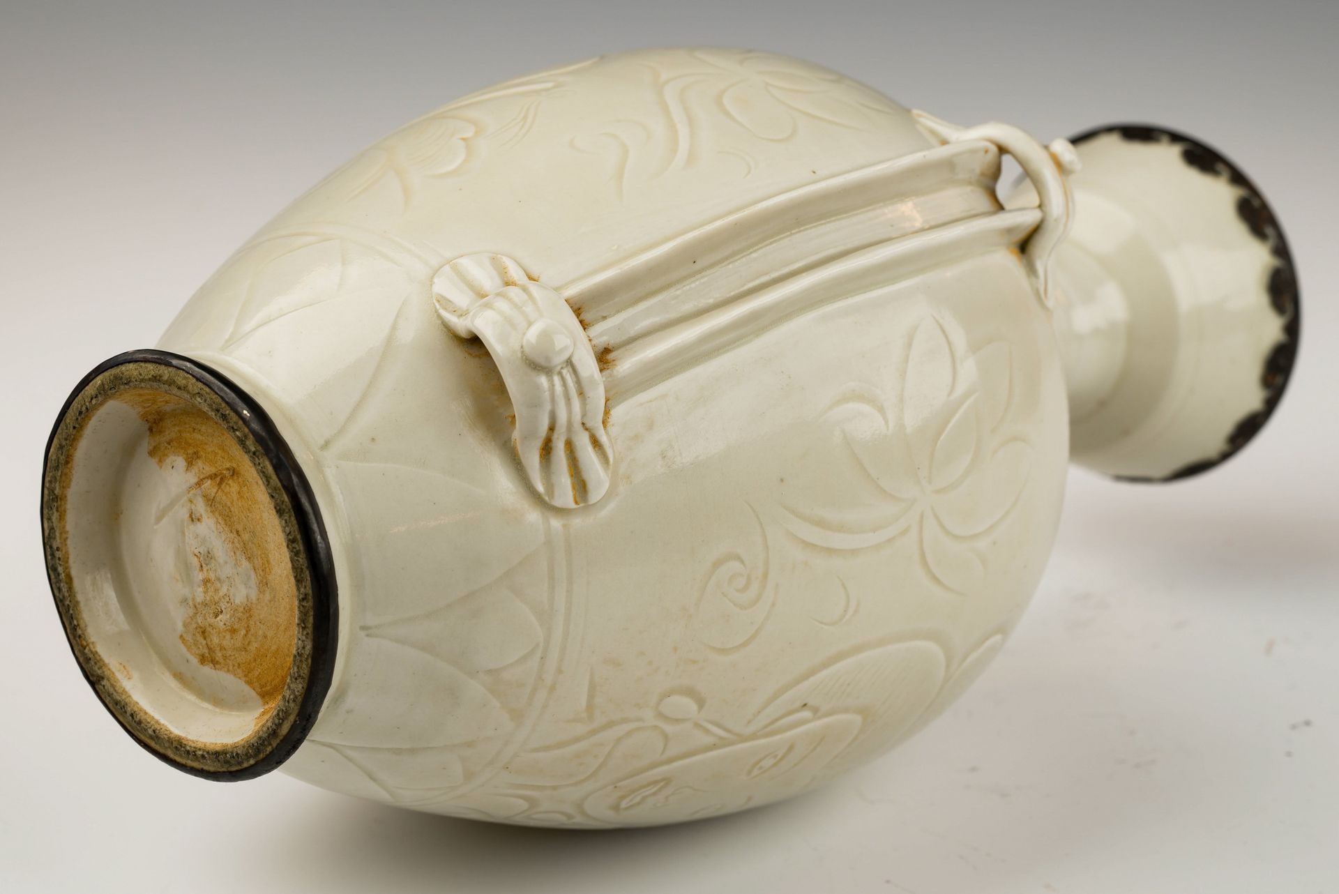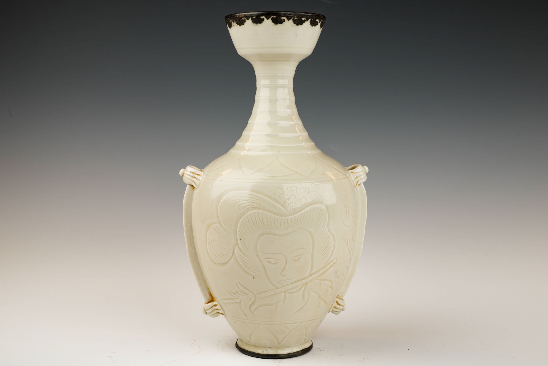 Offizielle kaiserliche Weißwarevase aus dem Ding-Brennofen der Nördlichen Song-Dynastie. Sie zeichnet sich durch ihr elegantes Design mit eingeritzten Frauengesichtern und Lotusblüten sowie zwei Henkeln aus. Die Vase ist mit einer durchscheinenden, elfenbeinfarbenen Glasur überzogen, die auf einen cremeweißen Korpus aufgetragen wurde. Feine, tropfenförmige Linien zeugen von ihrer Authentizität. Besonders hervorzuheben sind die beiden silbernen Bänder am Rand und am Boden, die beide eine markante schwarze Patina aufweisen. Diese Vase, vermutlich ein Tributstück, trägt am Boden das eingeritzte Schriftzeichen „guan“, das ihre offizielle Herkunft belegt. Die Höhe der Vase beträgt ca. 28,3 cm.
