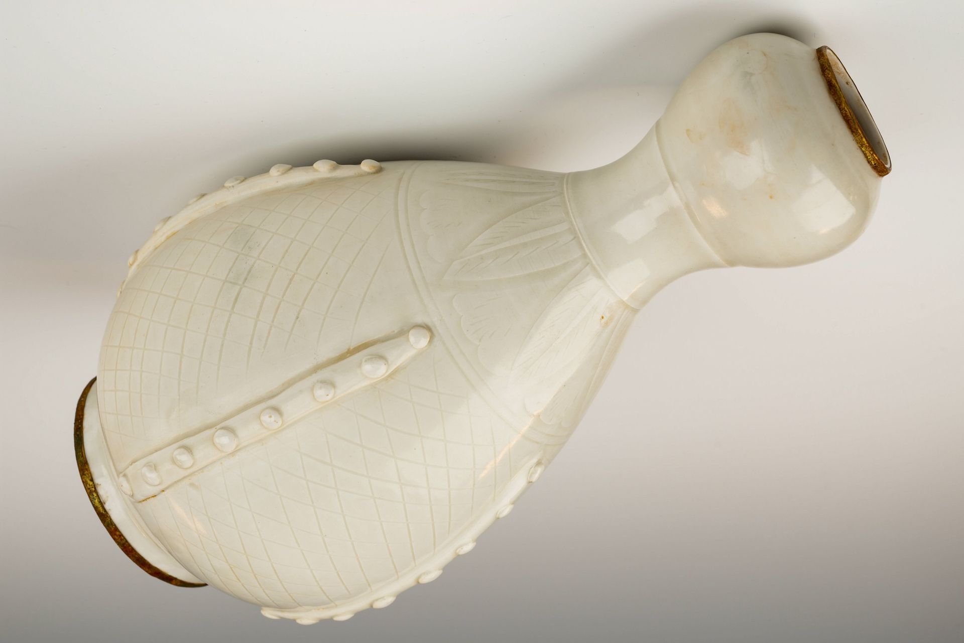 Doppelt kürbisförmige Flasche aus der Song-Dynastie, gefertigt im Ding-Ofen-Verfahren, besticht durch kunstvoll angebrachte Blätter, Blüten und Knospen am Korpus sowie einen blattförmigen Deckel. Die Flasche ist mit einer elfenbeinfarbenen, transparenten Glasur überzogen, die den cremeweißen Korpus bedeckt und deutliche Tränenstreifen aufweist. Besonders auffällig sind die feuervergoldeten Bänder an Deckel und Boden, die porös sind und eine Schichtkorrosion aus rötlichem Cuprit und grünlichem, traubenförmigem Malachit zeigen – ein Hinweis auf das hohe Alter. Diese Korrosion dient als zuverlässigere Authentifizierungsmethode als die Thermolumineszenzprüfung (TL) und genießt daher das Vertrauen von Experten. Das Vorhandensein des feuervergoldeten Bandes kennzeichnet die Flasche zudem als Tributgabe. Sie ist ca. 28 cm hoch.