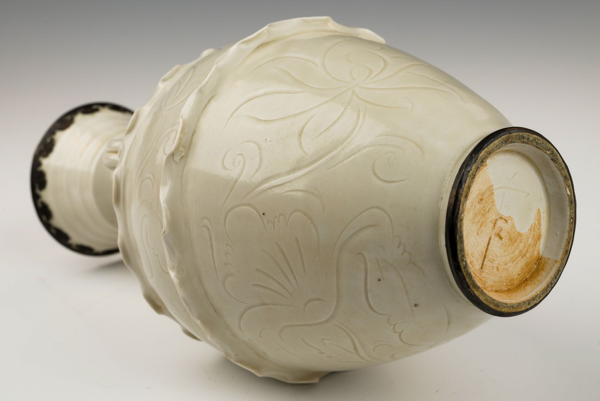 **Kaiserliche Vase aus weißer Ding-Keramik der Nördlichen Song-Dynastie** Diese exquisite kaiserliche Vase aus der Nördlichen Song-Dynastie besticht durch kunstvoll eingeritzte Blatt- und Blumenmotive, die durch elegant angebrachte Henkel ergänzt werden. Charakteristisch für die Vase ist ihre elfenbeinfarbene, transparente Glasur, die einen cremeweißen Korpus mit charakteristischen Tränenstreifen umhüllt. Besonders hervorzuheben sind die feuervergoldeten Bänder am Rand und Boden. Diese porösen Bänder zeigen Schichten aus rötlichem Cuprit und grünlicher, traubenförmiger Malachitkorrosion – ein Phänomen, das durch die Porosität der Vergoldung entstanden ist. Diese natürliche Patina zeugt nicht nur vom hohen Alter des Stücks, sondern dient auch als zuverlässigerer Echtheitsnachweis als die Thermolumineszenz-Analyse (TL), wie Experten auf dem Gebiet der Artefaktauthentifizierung bestätigen. Darüber hinaus ist die Vase entsprechend gekennzeichnet und aufgrund ihrer charakteristischen feuervergoldeten Bänder als Tributstück anerkannt. Die Gesamthöhe dieses bemerkenswerten Artefakts beträgt ca. 28,6 cm (11 1/4 Zoll). ppjrs