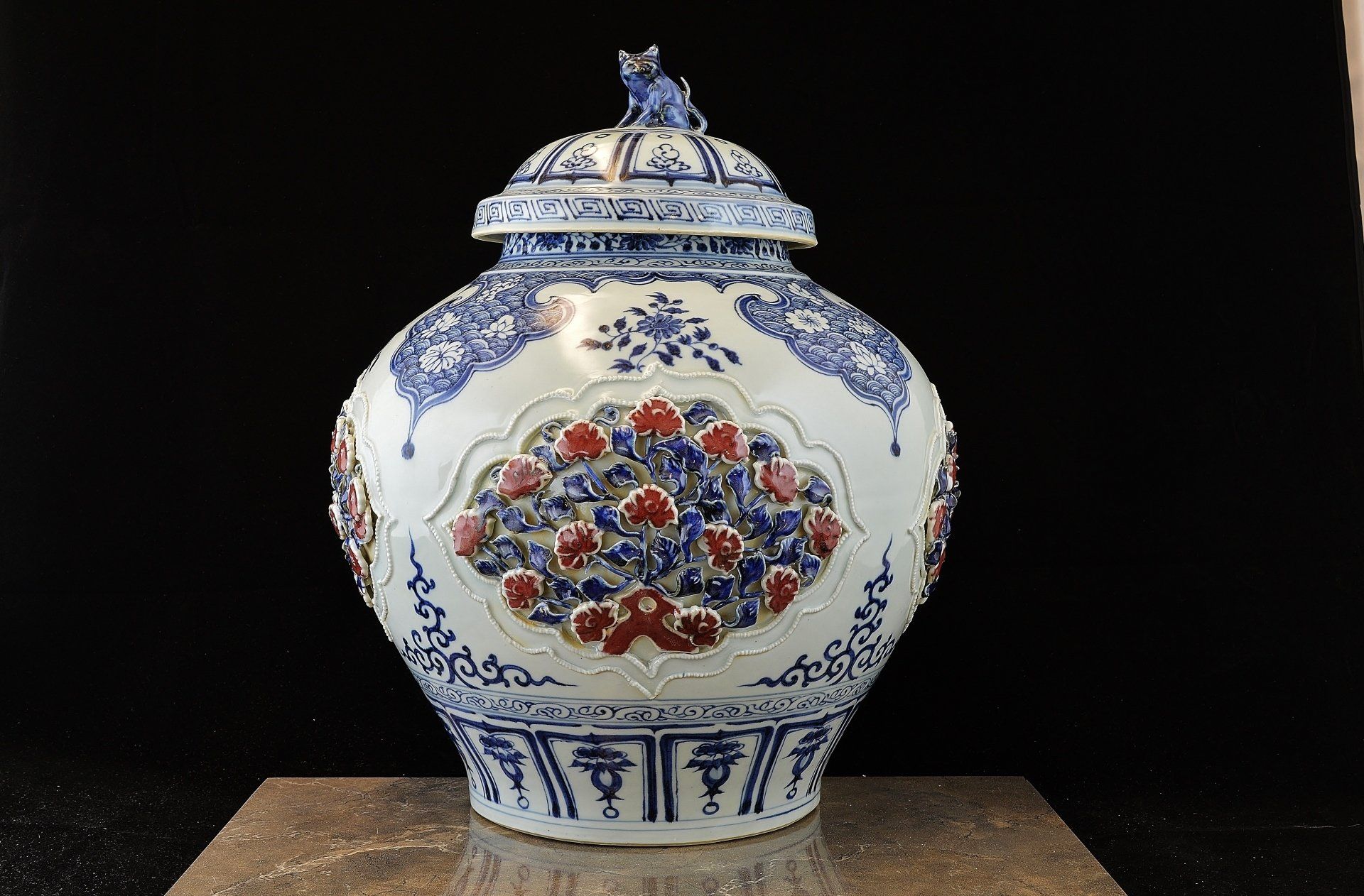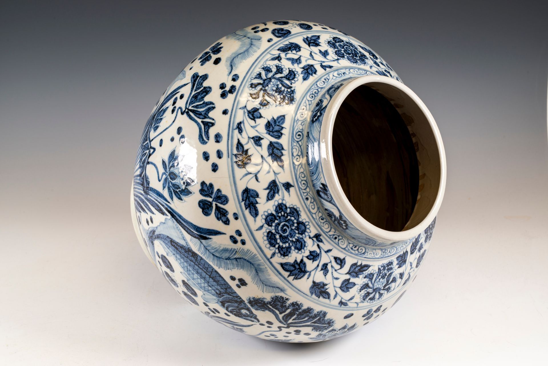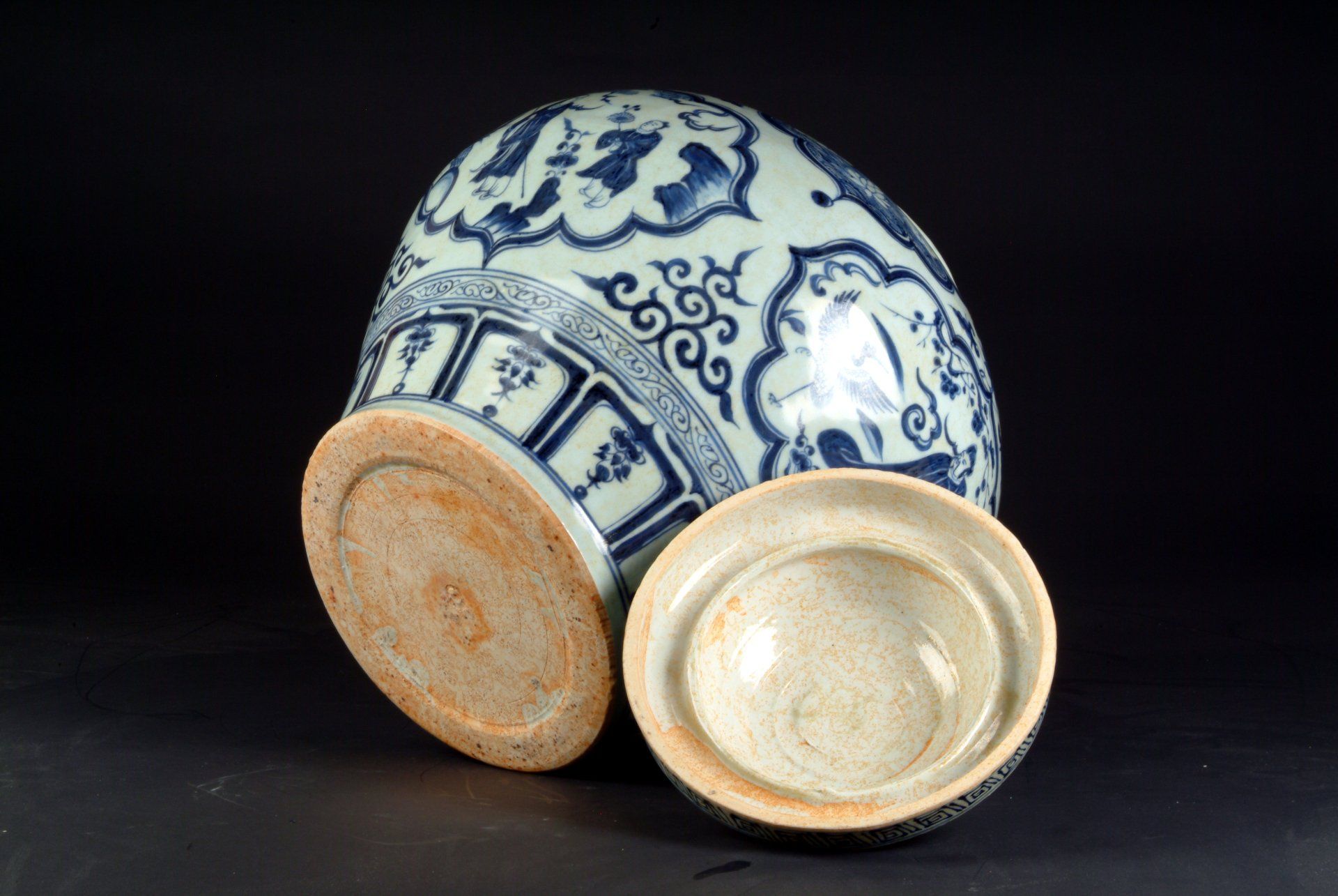 Blau-weiße Yuan-Dynastie-Kanne mit vierteiliger Figurendarstellung und einem Foo-Hund-Knauf. Verwendet wurde importiertes Samali-Blau-Kobalt, das einen schwärzlichen Ton aufweist. Beim Aufbrechen der Glasuroberfläche durch die Schichtung zeigen sich schwarze Flecken oder ein silbriger Schimmer, nicht das Braun, das auf lokales chinesisches Kobalt hindeuten würde. Dies bestätigt das hohe Alter, da dieses Kobalt seit über 500 Jahren nicht mehr erhältlich ist. Auch Abplatzungen im Scherben belegen das hohe Alter. Die Kanne ist ca. 38 cm hoch.