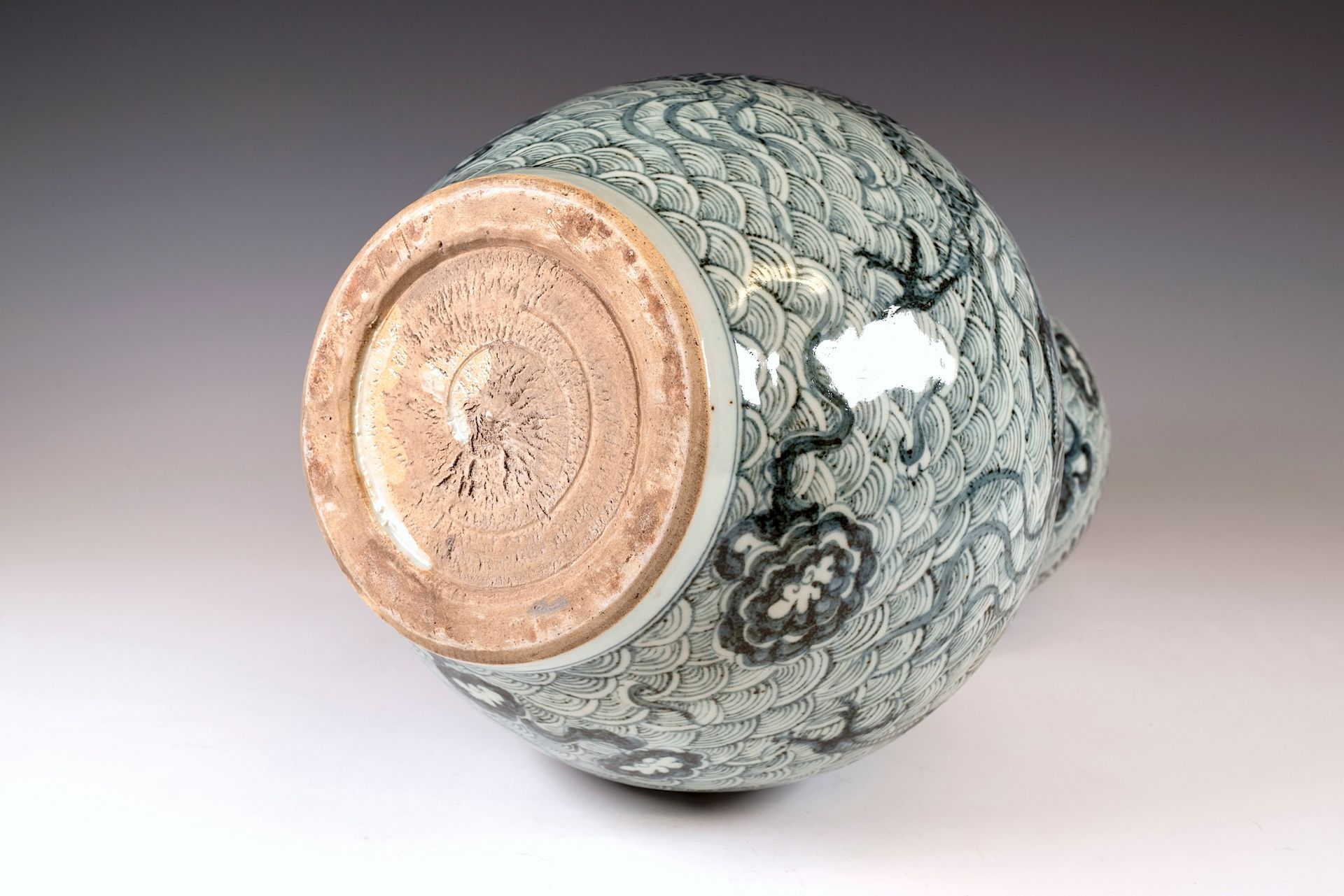 Dieses außergewöhnliche Kunstwerk ist ein blau-weißes Gefäß aus der Yuan-Dynastie, das sich durch die Darstellung eines Drachen, der eine flammende Perle verfolgt, auszeichnet. Die Kunsthandwerker verwendeten importiertes Samali-Blau-Kobalt, das sich durch seinen charakteristischen schwärzlichen Unterton auszeichnet. Besonders auffällig ist, dass beim Auftragen von Farbe in die Glasuroberfläche schwarze Flecken oder ein silbriger Schimmer sichtbar werden, im Gegensatz zum Braunton, der typischerweise mit lokal gewonnenem chinesischem Kobalt assoziiert wird. Diese Beobachtung ist ein wichtiger Indikator für das Alter des Stücks, da dieses spezielle importierte Kobalt seit über 500 Jahren nicht mehr erhältlich ist. Das beigefügte Foto zeigt das Innere des Gefäßes, das in zwei Abschnitte unterteilt ist – ein typisches Merkmal vieler Gefäße aus der Yuan-Dynastie. Darüber hinaus unterstreicht das Abblättern der Glasur das hohe historische Alter des Gefäßes. Das Gefäß ist etwa 28 cm hoch.