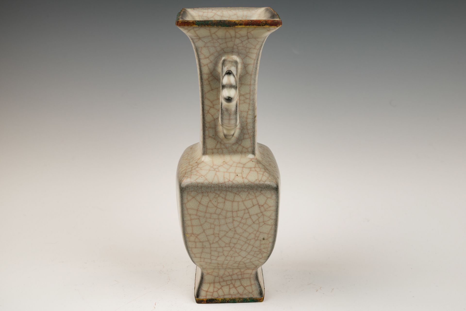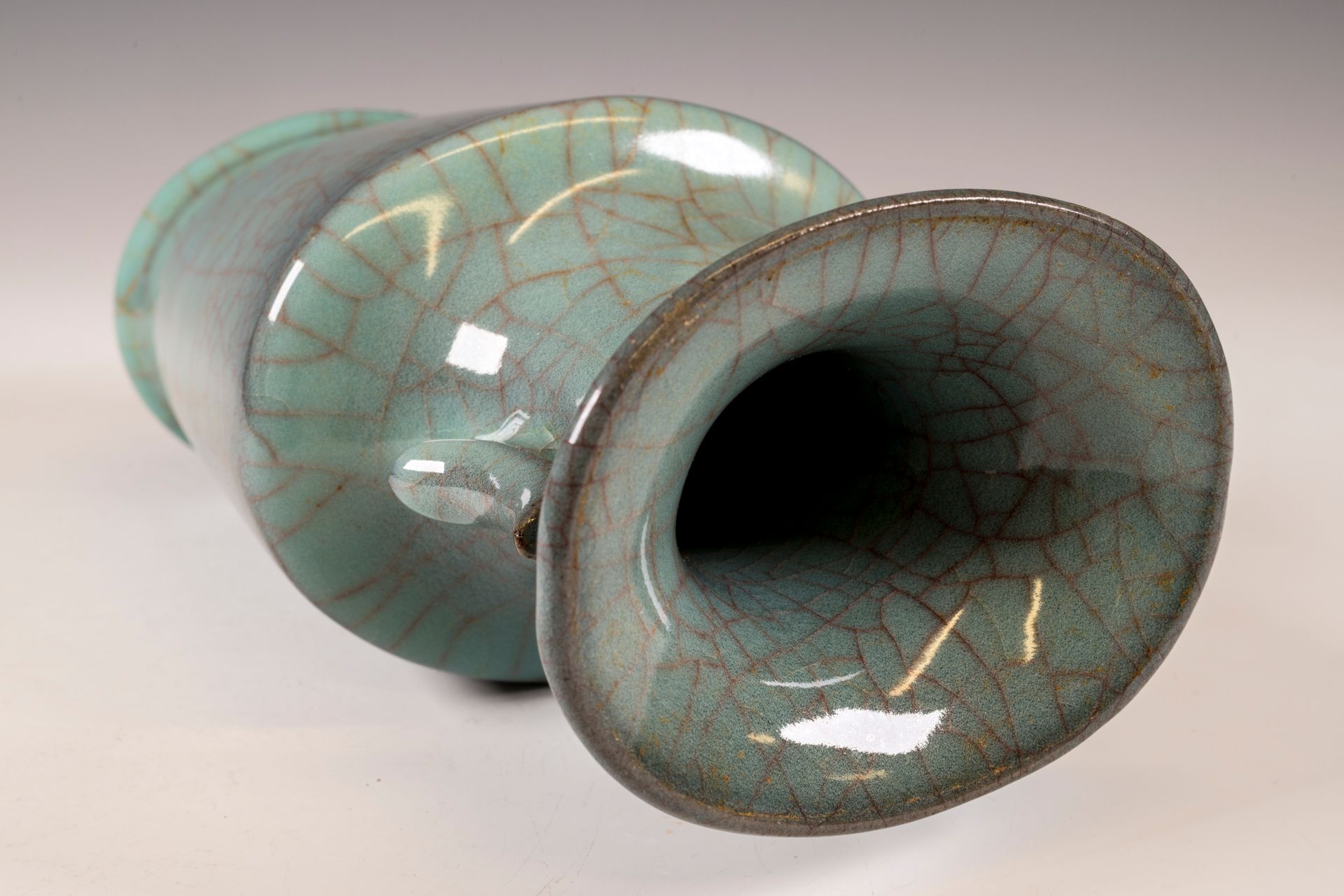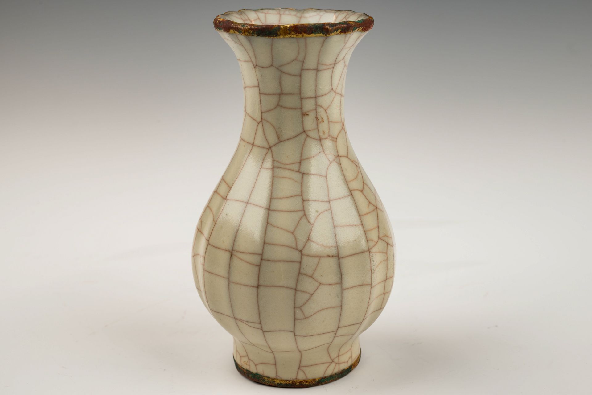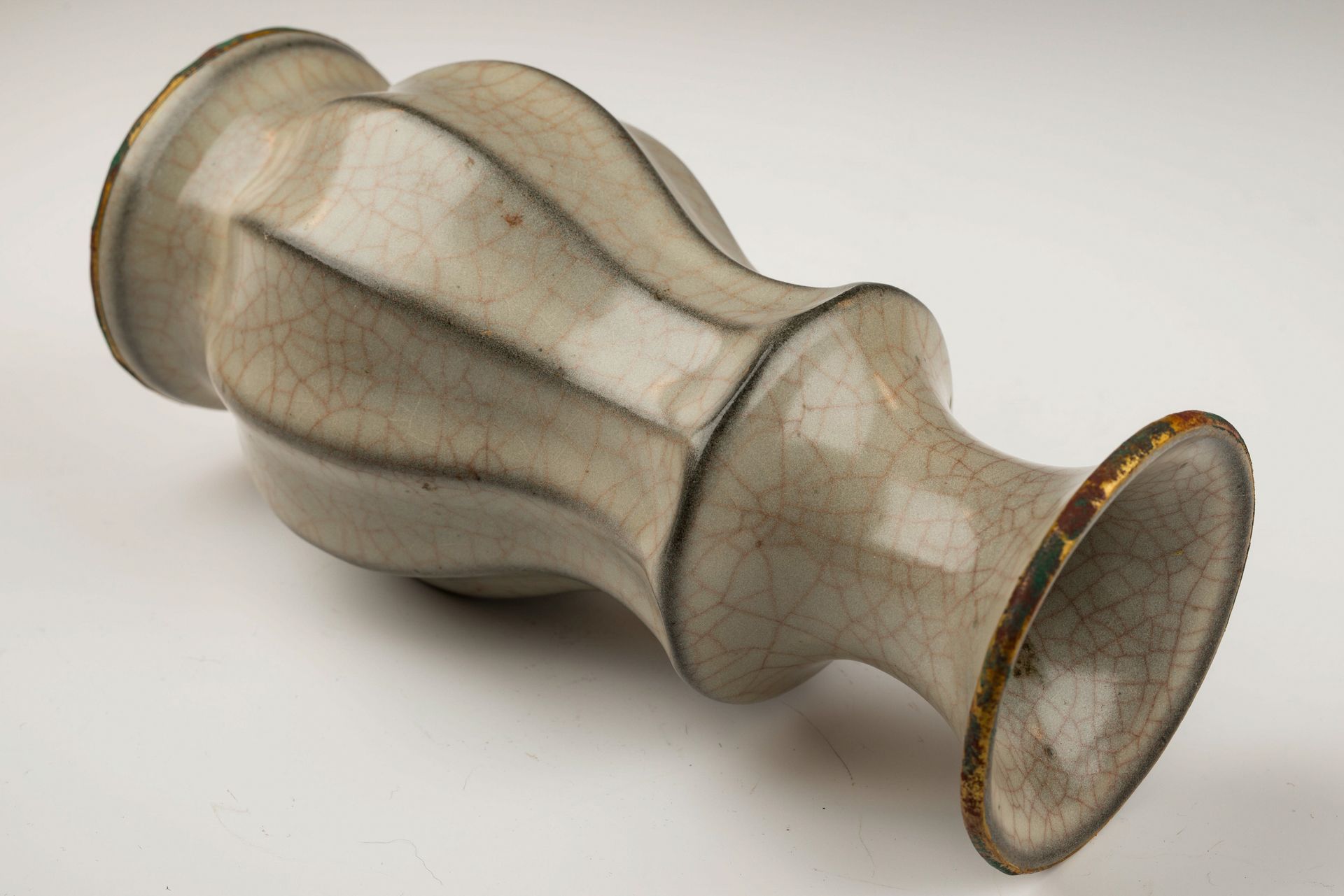 Jarrón oficial Guan Ware de la dinastía Song del Sur: acabado craquelado con bandas y asas doradas al fuego del horno imperial Guan.