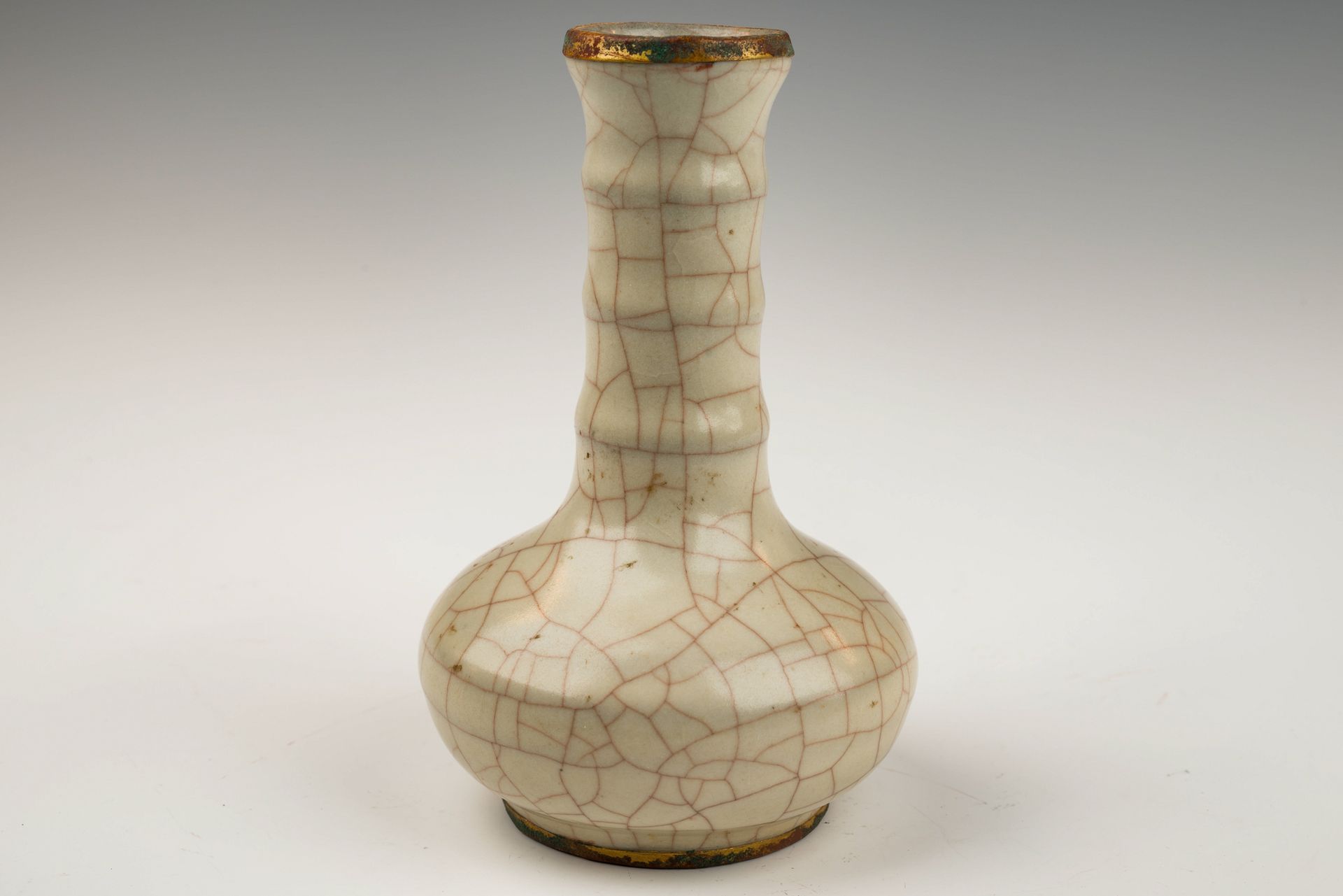 Jarrón botella de cuello de bambú craquelado con bandas doradas al fuego, de la dinastía Song Guan Yao, con horno oficial imperial Guan Ware