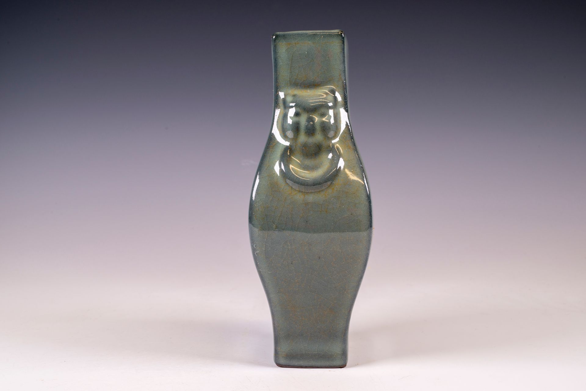 Este excepcional artefacto es un jarrón elaborado durante la dinastía Song del Sur, caracterizado por sus asas de tigre, producido en el prestigioso horno oficial Guan de Xiuneisi, bajo los auspicios del período de la marca imperial de la cerámica Guan. El jarrón presenta múltiples capas de intrincado vidriado verdoso aplicadas sobre un cuerpo delicadamente construido. El jarrón rectangular, elegantemente curvado, presenta un sutil acabado craquelado que realza su atractivo estético y ostenta de forma prominente la marca oficial Guan en su base. Además, la pieza se apoya en una robusta base de hierro, que exhibe el distintivo tono marrón oscuro atribuido a la arcilla utilizada en su creación. Tras la expulsión de la corte imperial por los ejércitos Jin de la dinastía Song del Norte en 1127 d. C., la corte se trasladó al sur, a Hangzhou, lo que marcó el establecimiento de la dinastía Song del Sur. El jarrón mide aproximadamente 22,7 cm de altura. ppjrs