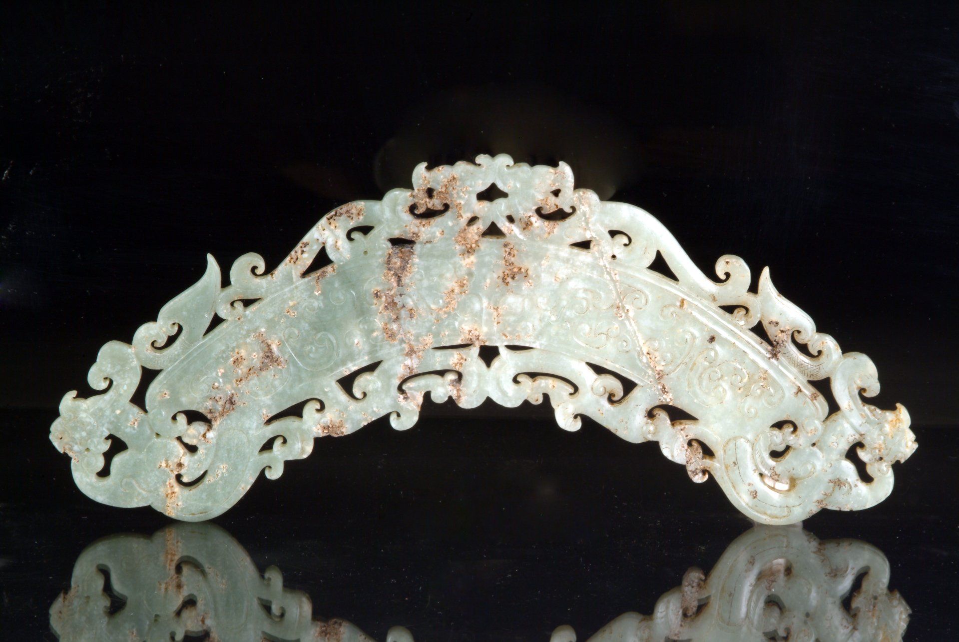 La dinastía Han presenta un colgante de jade blanco de intrincado diseño con un motivo de dragón y fénix, caracterizado por una gran estilización artística. Esta pieza exhibe notables inclusiones calcificadas de color marrón, junto con tonos verdosos resultantes de su entierro junto a artefactos de bronce. El estilo de tallado atestigua aún más su importancia histórica. El colgante mide aproximadamente 16,5 cm cerrado y 44,5 cm completamente abierto.