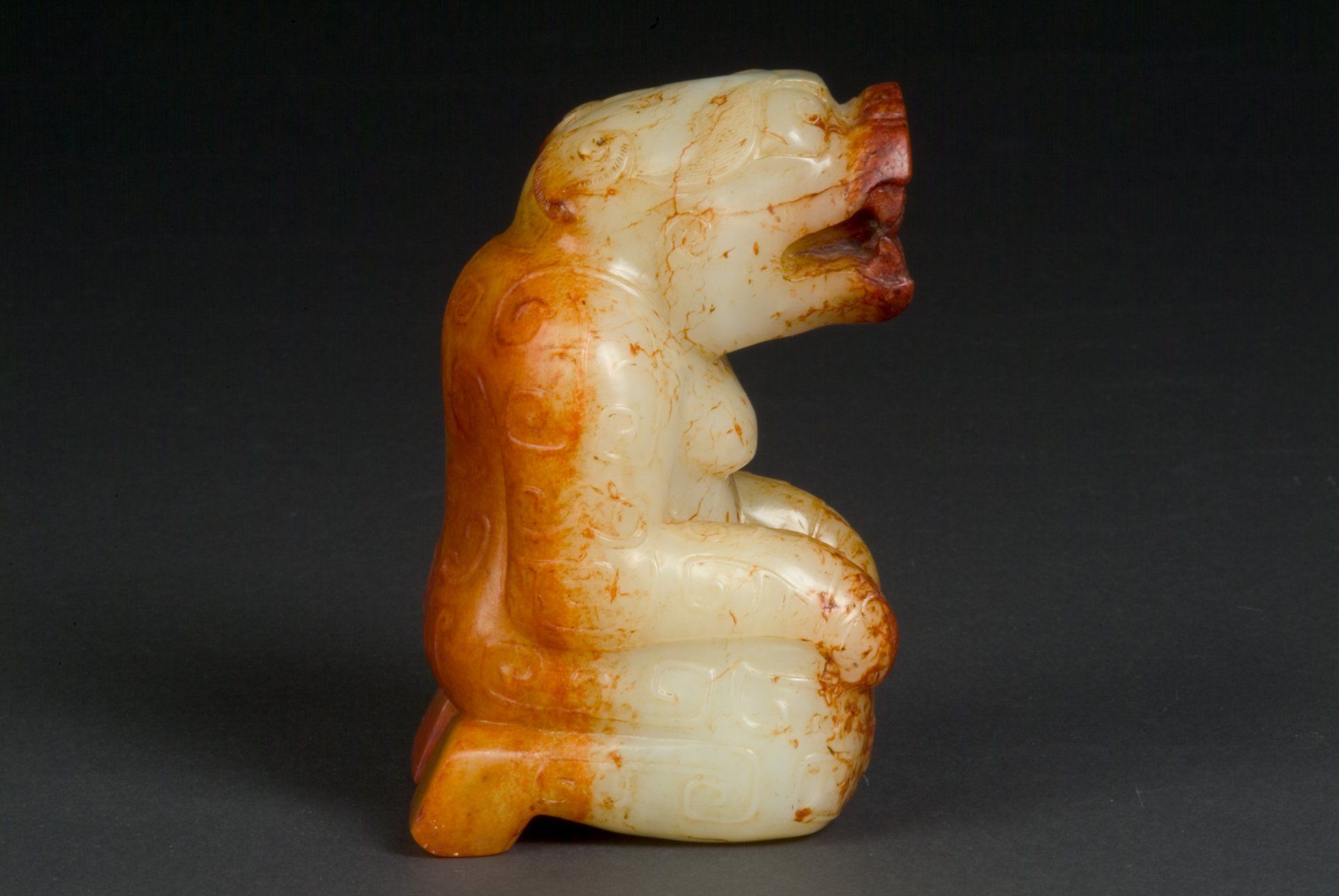 Estatua de animal mítico arrodillado, muy estilizada, de la dinastía Han, tallada con maestría en jade blanco con importantes inclusiones rojizas. Su distintivo estilo de tallado autentica su importancia histórica. Esta exquisita pieza mide aproximadamente 11 cm de altura.