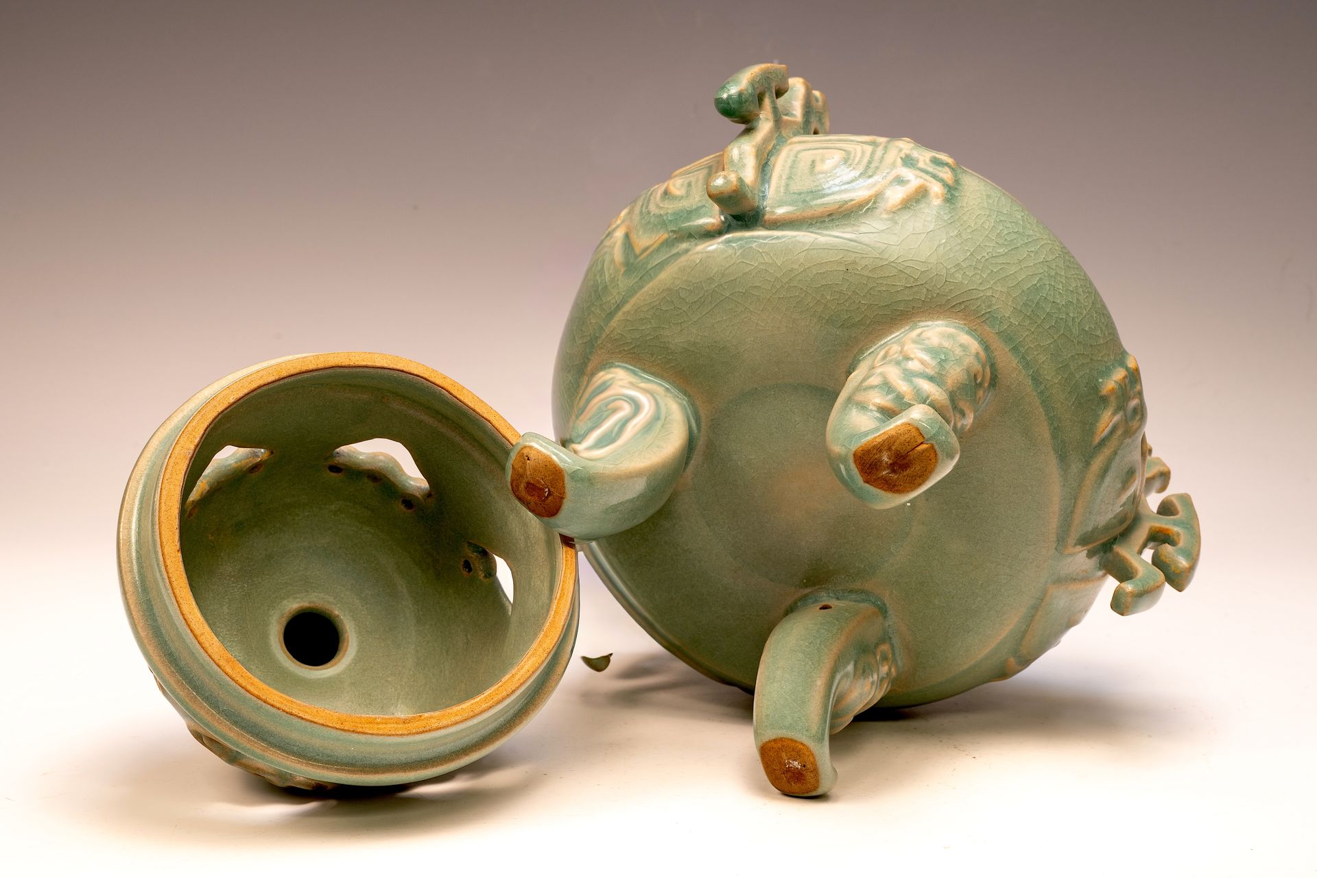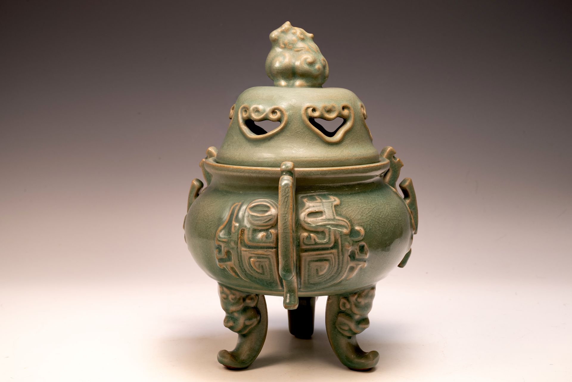 **Un exquisito quemador de tres patas de horno imperial real oficial de Ru, encargado por primera vez, con asas y tapa, adornado con un remate animal mítico: una obra maestra para el emperador Huizong y su corte** Este distinguido quemador, de 24 cm de altura, personifica la excepcional artesanía de la cerámica de principios de la dinastía Song, encargada específicamente para el emperador Huizong y su estimada corte. Su forma elegantemente proporcionada se complementa con asas de diseño intrincado, que ejemplifican la precisión artística. El vidriado celadón revela variaciones matizadas que realzan su atractivo estético. Cabe destacar la delicada textura de hielo agrietado, combinada con ágata azul finamente triturada, una característica exclusiva de las piezas oficiales imperiales reales de Ru, evidente al examinarla más de cerca, como se indica en las imágenes microscópicas proporcionadas. El cuerpo del quemador exhibe una refinada paleta grisácea, que parece marrón como resultado del proceso de cocción. Este notable artefacto es parte de la colección restante de cerámica imperial Ru de la dinastía Song del Norte y sirve como un testimonio significativo del patrimonio artístico establecido bajo el reinado del emperador Huizong. ppjrs