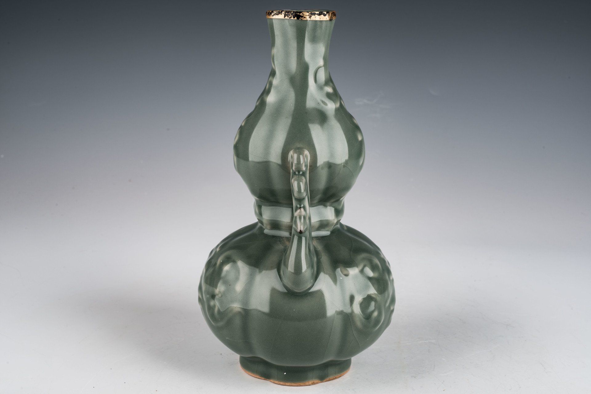 Este estimado jarrón de doble calabaza, realizado por segunda vez en el Real Imperial Ru, se encuentra entre los ejemplos más exquisitos de cerámica de celadón jamás producidos en China. Elaborado específicamente para el emperador Huizong y su corte, este jarrón ejemplifica la elegancia y el lujo propios de la época. El jarrón se caracteriza por su extraordinario vidriado de celadón, que exhibe una textura rica y suave, con un sutil efecto craquelado y líneas tenues. Cabe destacar que se integró ágata triturada en la mezcla del vidriado, observable con una lupa de 20x. Las imágenes microscópicas adicionales ilustran la presencia de motas de ágata en toda la superficie. La inclusión de ágata triturada es una característica distintiva exclusiva de la cerámica Real Imperial Ru encargada por el emperador Huizong. Además, el borde del jarrón está adornado con una banda de plata dorada al fuego. El dorado al fuego de las bandas de plata presenta poros que permiten que el deslustre se filtre a través de ellos, resultando en una marcada corrosión negra en las bandas. El jarrón en sí luce un cuerpo blanquecino que ha adquirido un tono marrón tras el proceso de cocción. Con una altura de 23 cm, este extraordinario jarrón de doble calabaza es un valioso artefacto de la colección superviviente del emperador Huizong de cerámica imperial Ru de la dinastía Song del Norte. ppjrs