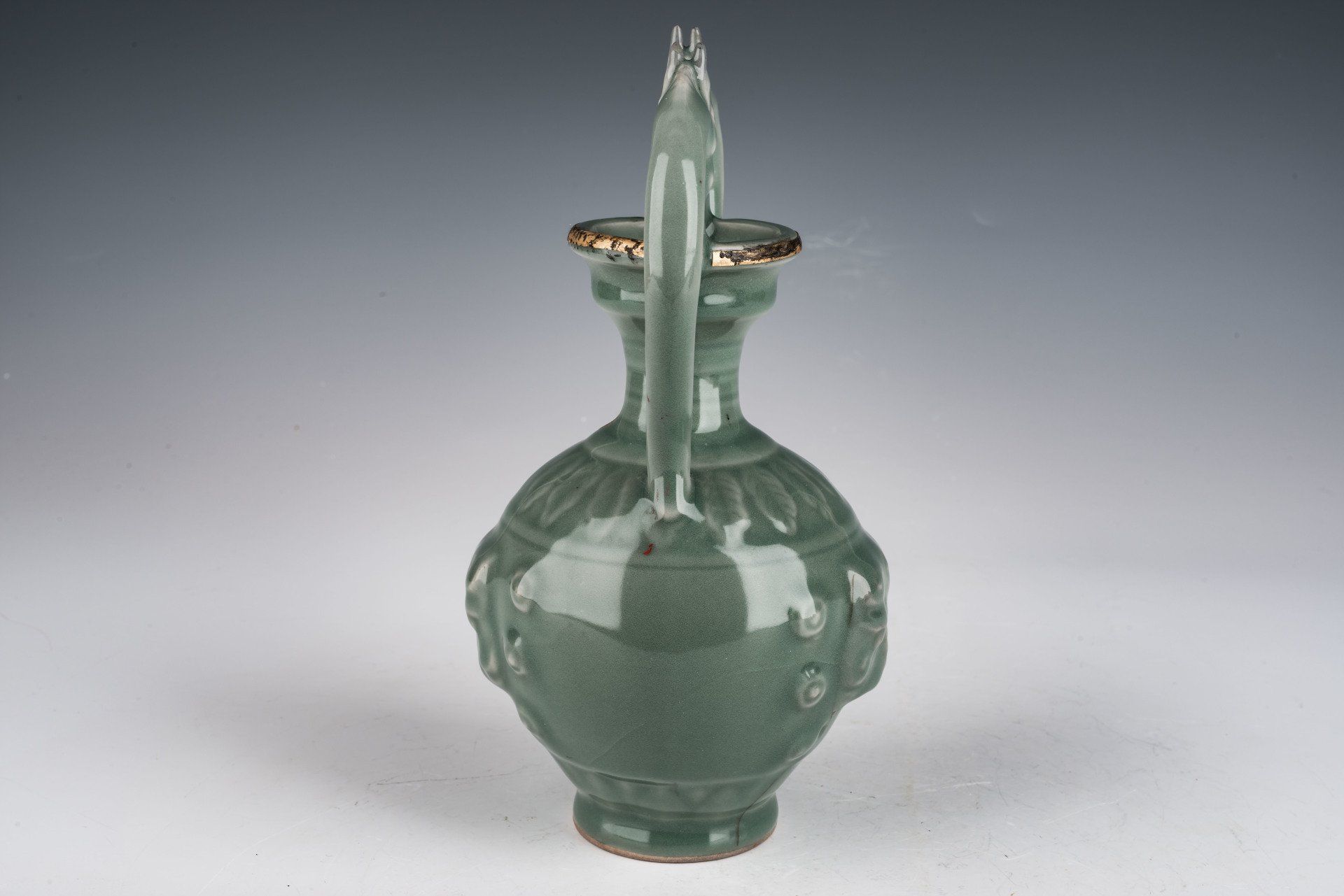 Este prestigioso jarrón con cabeza de carnero, segundo encargo oficial de la Real Orden Imperial Ru, es un ejemplo distinguido de la más exquisita cerámica de celadón producida en China. Elaborado exclusivamente para el emperador Huizong y su corte, este jarrón ejemplifica la cumbre del lujo y la elegancia. El jarrón con cabeza de carnero presenta un excepcional vidriado de celadón, caracterizado por su rica textura y acabado suave, con sutiles patrones craquelados. Además, el vidriado contiene ágata triturada, un detalle que puede observarse con una lupa de 20x, como se ilustra en las fotografías microscópicas adjuntas. El uso de ágata azul triturada es un atributo poco común, reservado exclusivamente para la cerámica oficial de la Real Orden Imperial Ru, desarrollada durante el reinado del emperador Huizong. Asimismo, el jarrón presenta un dorado al fuego sobre una banda de plata a lo largo del borde, que ha sufrido una corrosión significativa. El dorado al fuego de las bandas de plata presenta poros que permiten que el deslustre se filtre a través de ellos, resultando en una marcada corrosión negra en las bandas. El cuerpo del jarrón es de color blanquecino, con un tinte marrón tras la cocción. Con una impresionante altura de 23 cm, esta notable pieza forma parte de la colección sobreviviente de cerámica imperial Ru de la dinastía Song del Norte, asociada al emperador Huizong. ppjrs