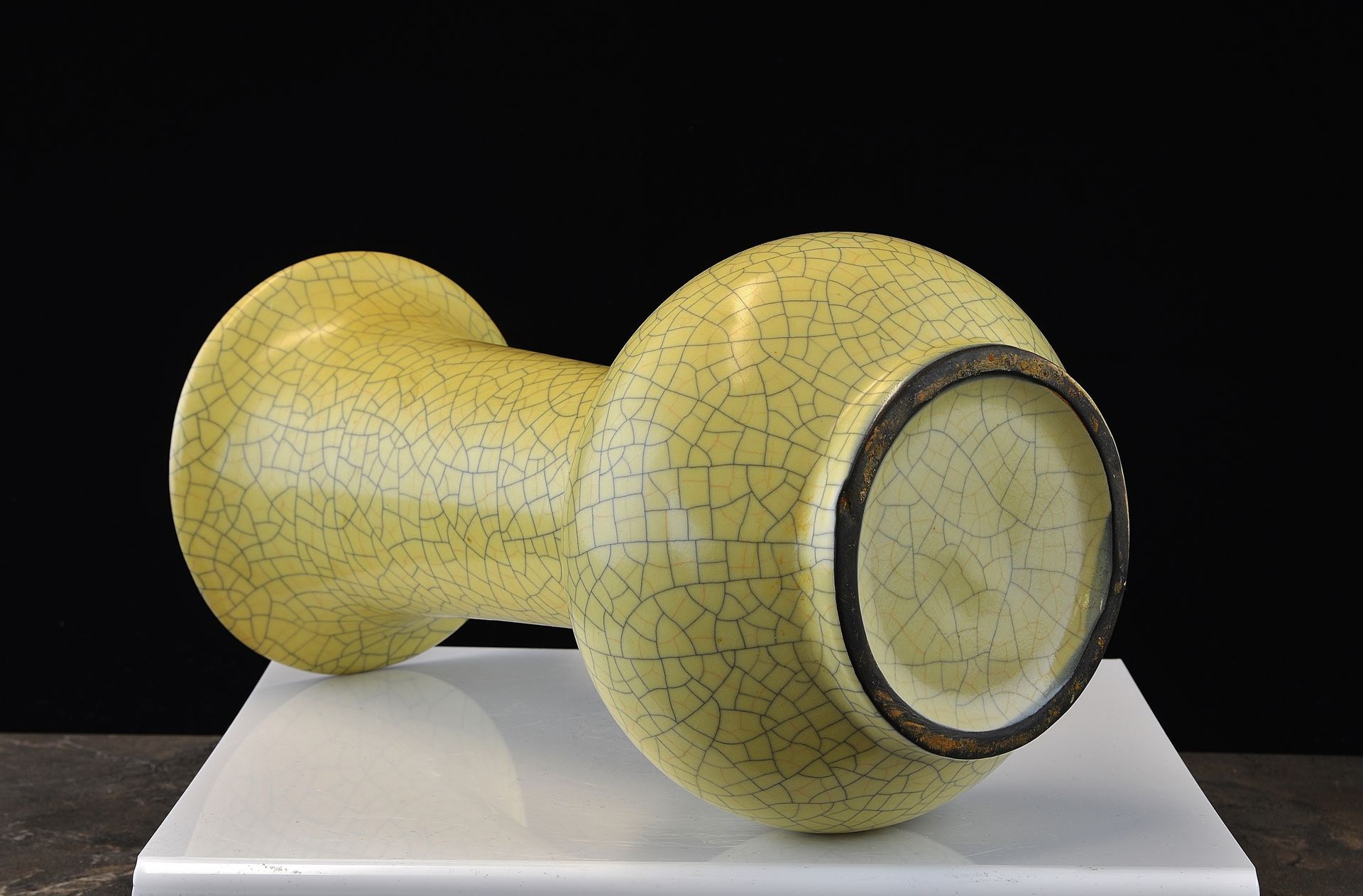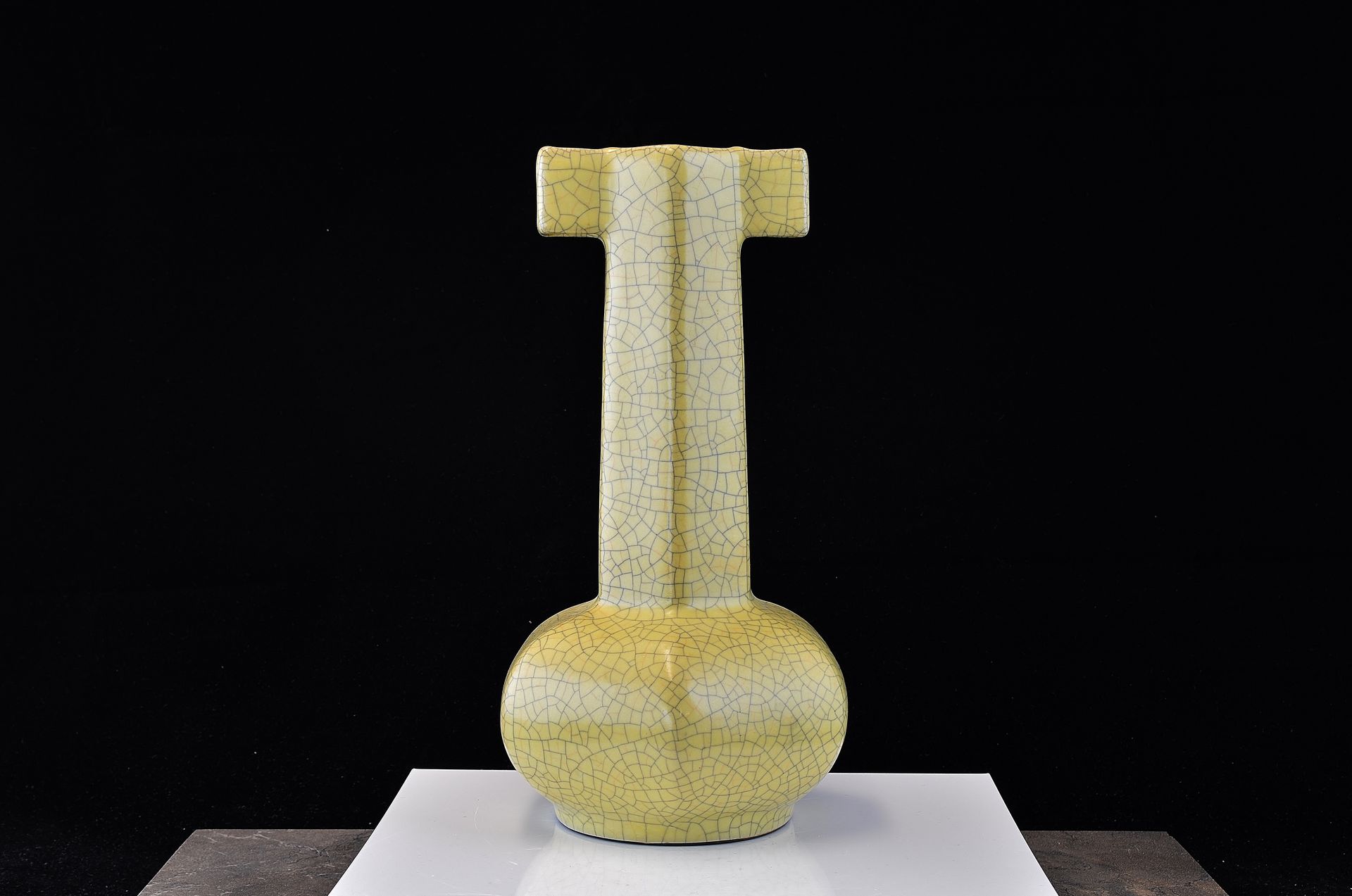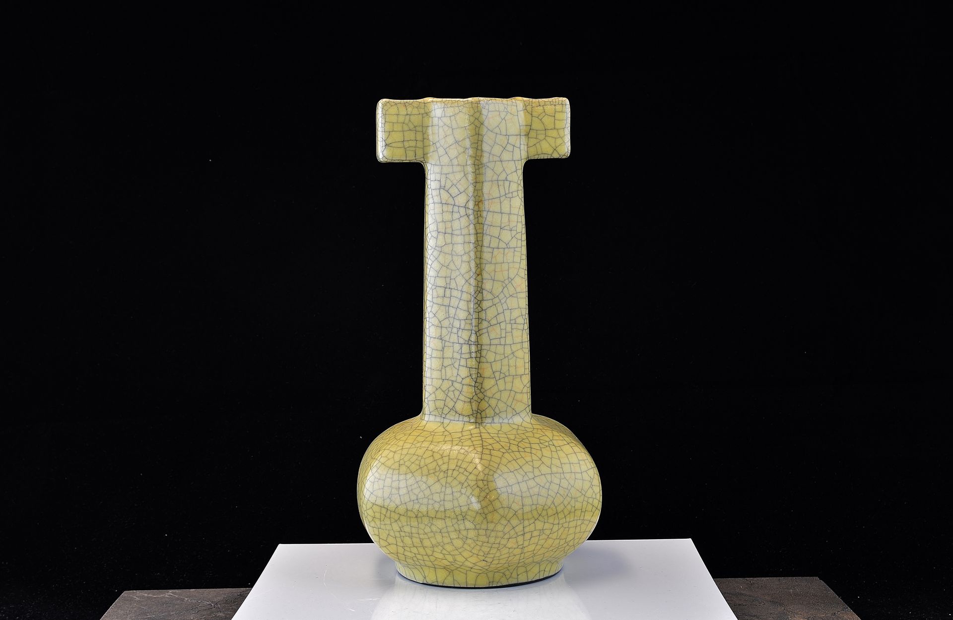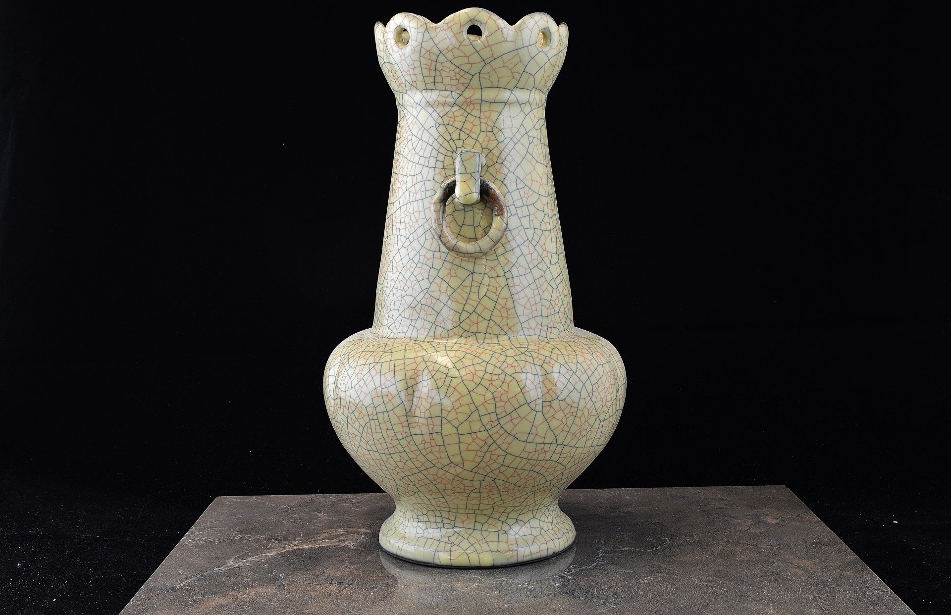 Jarrón con forma de Hu y asas tubulares, fabricado en horno Ge de la dinastía Song del Sur/Yuan, probablemente producido a principios de la dinastía Song del Sur. Presenta un proceso de cocción imperfecto que resultó en un esmaltado más grueso debido al control incompleto de las técnicas en aquella época. El jarrón presenta una base de hierro y una coloración que recuerda al trigo. El horno Ge se considera el predecesor de otros hornos durante el período de transición entre las dinastías Song del Sur y Yuan. La altura aproximada del jarrón es de 21,5 cm. ppjrs