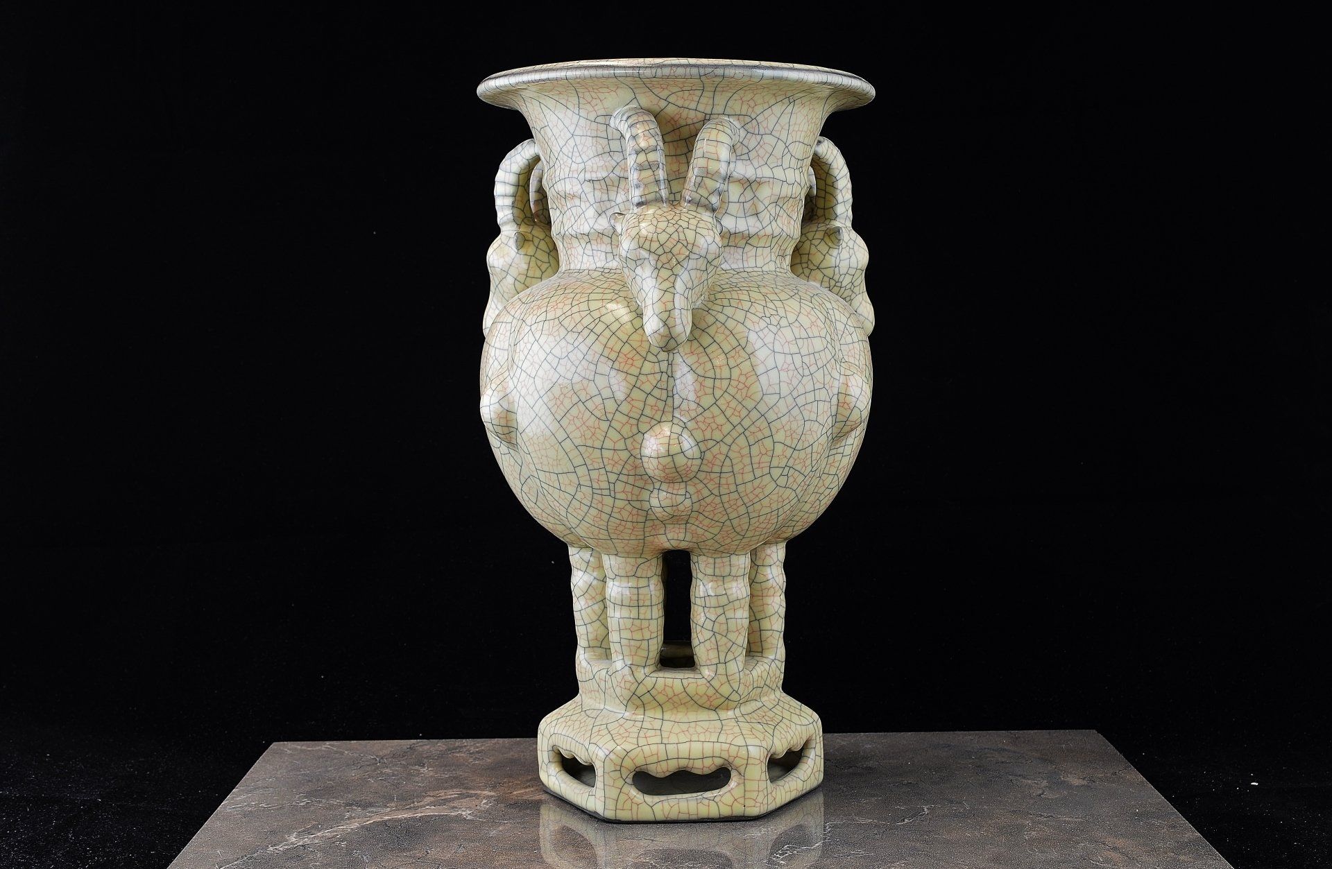 Jarrón grande de cerámica Ge Kiln de la dinastía Song/Yuan del Sur, con tres asas en forma de cabeza de carnero, caracterizado por un color que recuerda al trigo, una boca morada y una base de hierro. La pieza presenta una decoración de alambre de hierro y un peculiar crujido de hilo rojo sangre de anguilas. El horno Ge, a menudo conocido como el horno del hermano mayor durante las dinastías Song y Yuan del Sur, es famoso por su artesanía. Dada su excepcional calidad, atractivo estético y considerables dimensiones (aproximadamente 34 cm de altura), es probable que este jarrón sirviera como cerámica de tributo. ppjrs