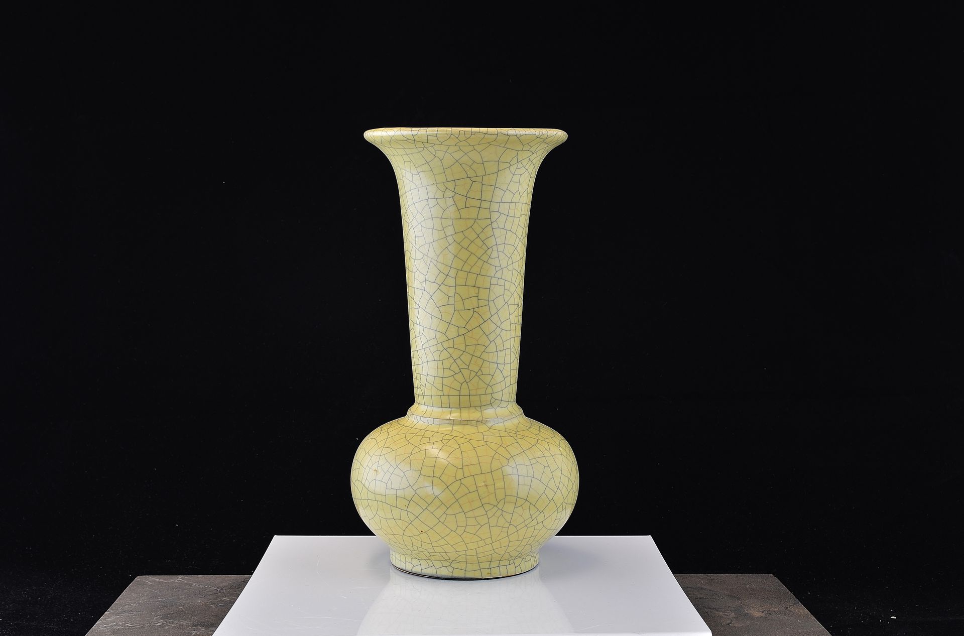 Jarrón con forma de trompeta y cuerno de Ge Ware, de la dinastía Song/Yuan del Sur. Esta exquisita pieza presenta un sutil crujido del alambre de hierro que recuerda a los hilos de sangre de anguila y se complementa con un pie de hierro. Su coloración recuerda a la del trigo, lo que realza su atractivo visual. El horno Ge, considerado el hermano mayor de los hornos durante las dinastías Song del Sur a Yuan, es reconocido por su excepcional artesanía. Este jarrón mide aproximadamente 25 cm de alto. ppjrs