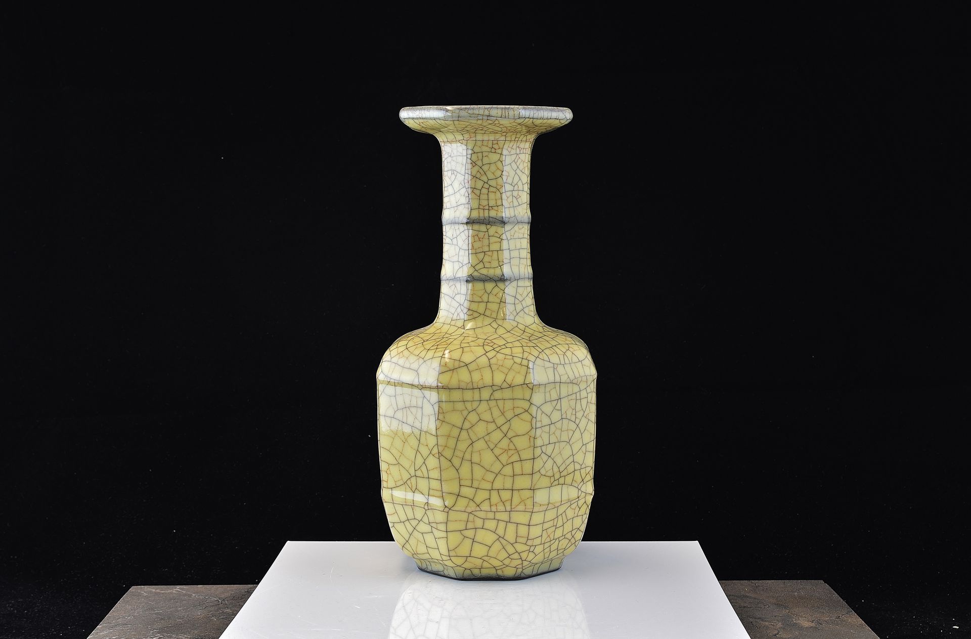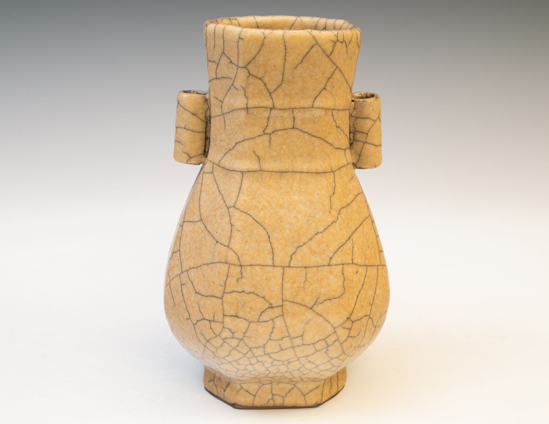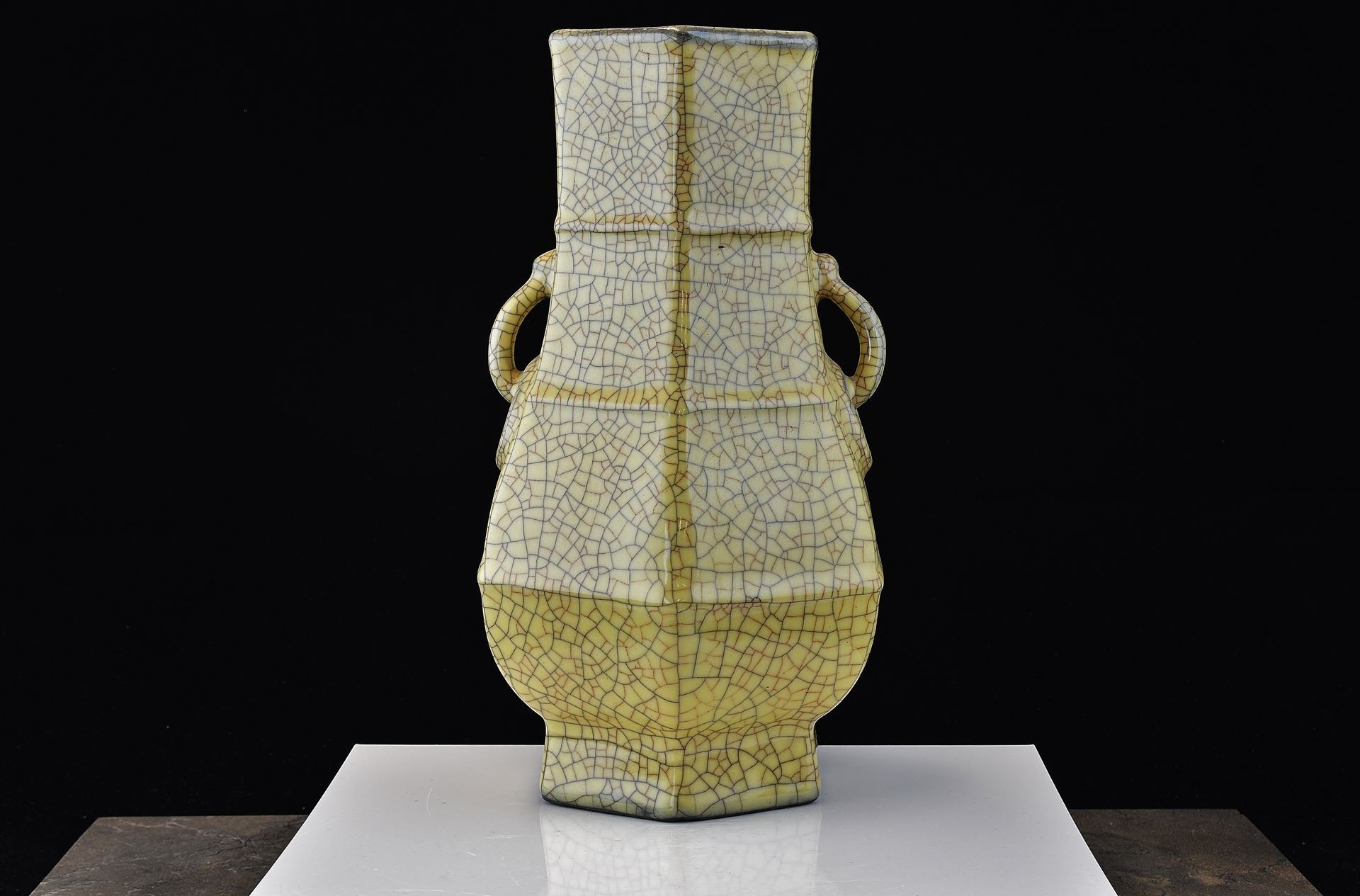 Jarrón octogonal con forma de Hu y asas tubulares, fabricado en horno Ge de la dinastía Song del Sur/Yuan, probablemente a principios del período Song del Sur. El proceso de cocción de esta pieza presenta inconsistencias; el esmaltado es notablemente más grueso debido a las limitaciones operativas del horno en aquella época. Presenta una base de hierro y un color que recuerda al trigo. El horno Ge, a menudo considerado el "horno del hermano mayor", tiene importancia histórica durante la transición de las dinastías Song del Sur a la Yuan. Este jarrón mide aproximadamente 19 cm de alto. ppjrs