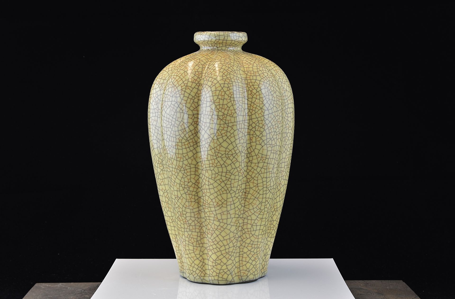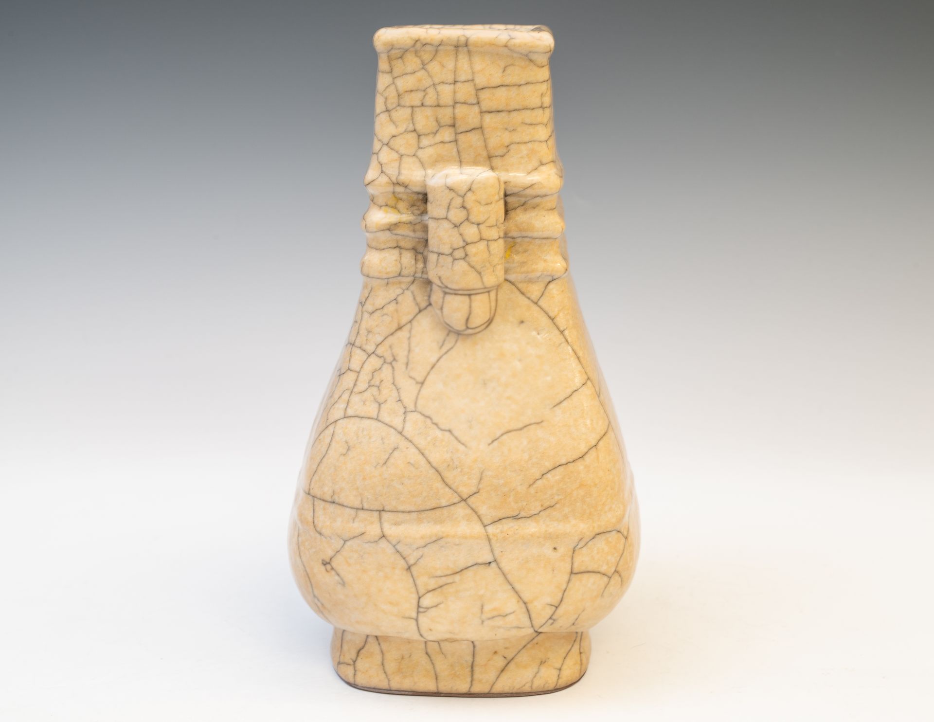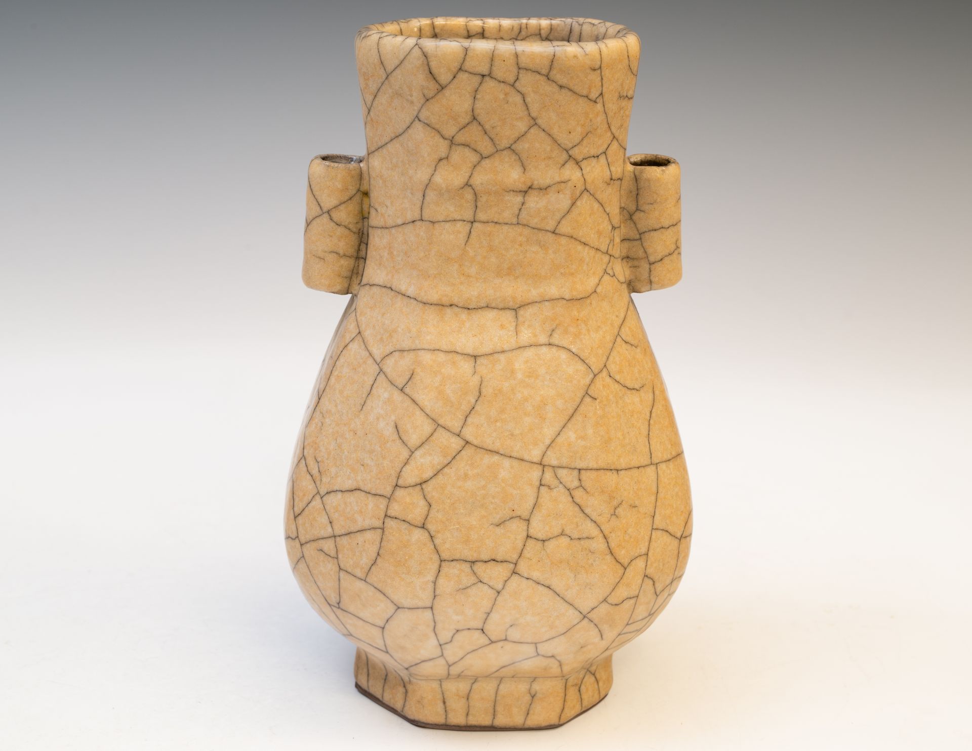 Jarrón octogonal con forma de Hu y asas tubulares, fabricado en horno Ge de la dinastía Song del Sur/Yuan, probablemente a principios del período Song del Sur. El proceso de cocción de esta pieza presenta inconsistencias; el esmaltado es notablemente más grueso debido a las limitaciones operativas del horno en aquella época. Presenta una base de hierro y un color que recuerda al trigo. El horno Ge, a menudo considerado el "horno del hermano mayor", tiene importancia histórica durante la transición de las dinastías Song del Sur a la Yuan. Este jarrón mide aproximadamente 19 cm de alto. ppjrs