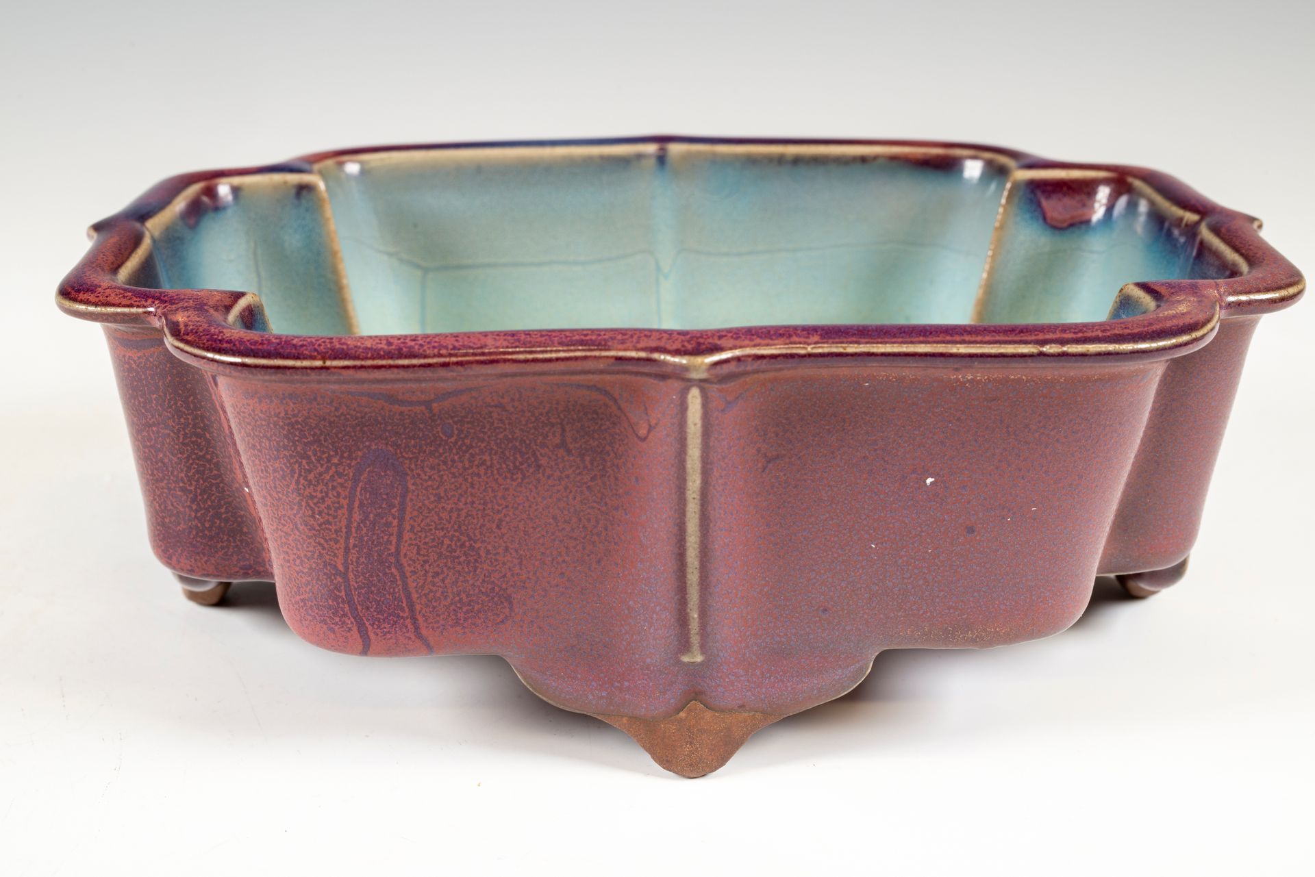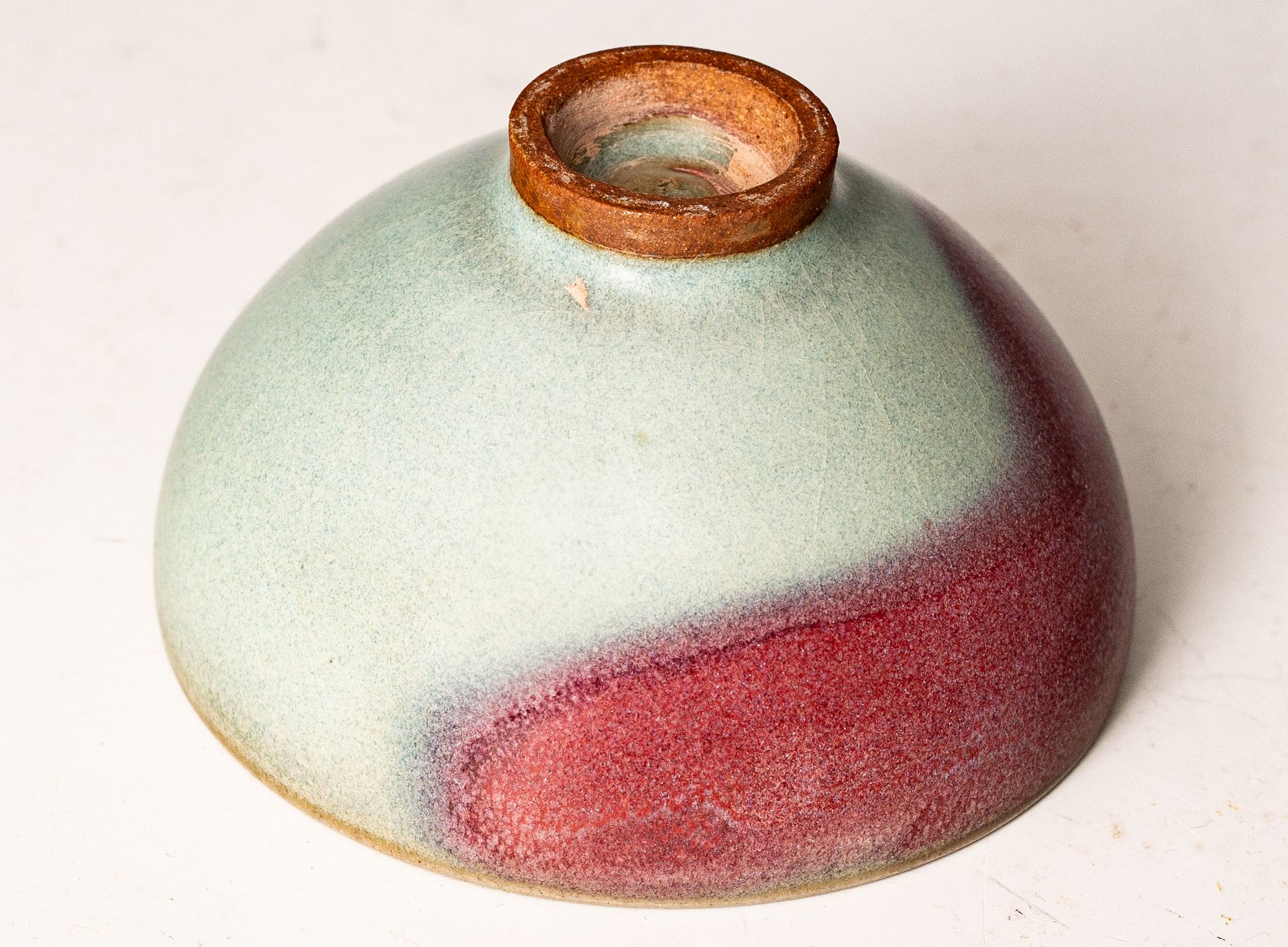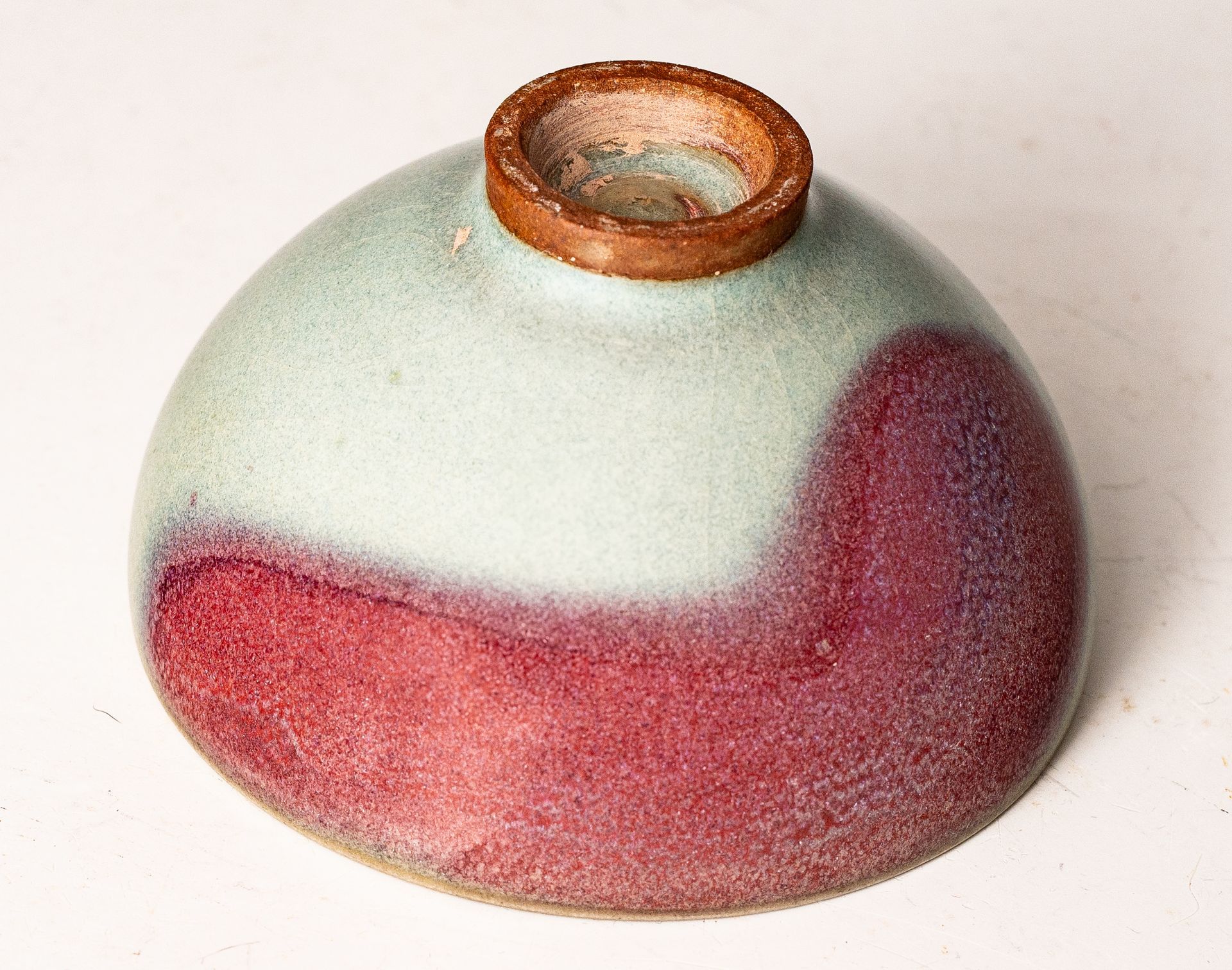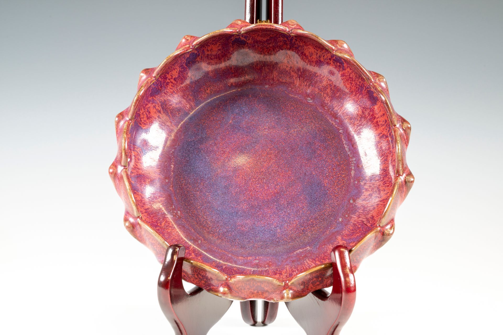 Maceta y plato Jun Ware de la dinastía Song con borde, esmaltado rojizo e interior azul con huellas de gusano.