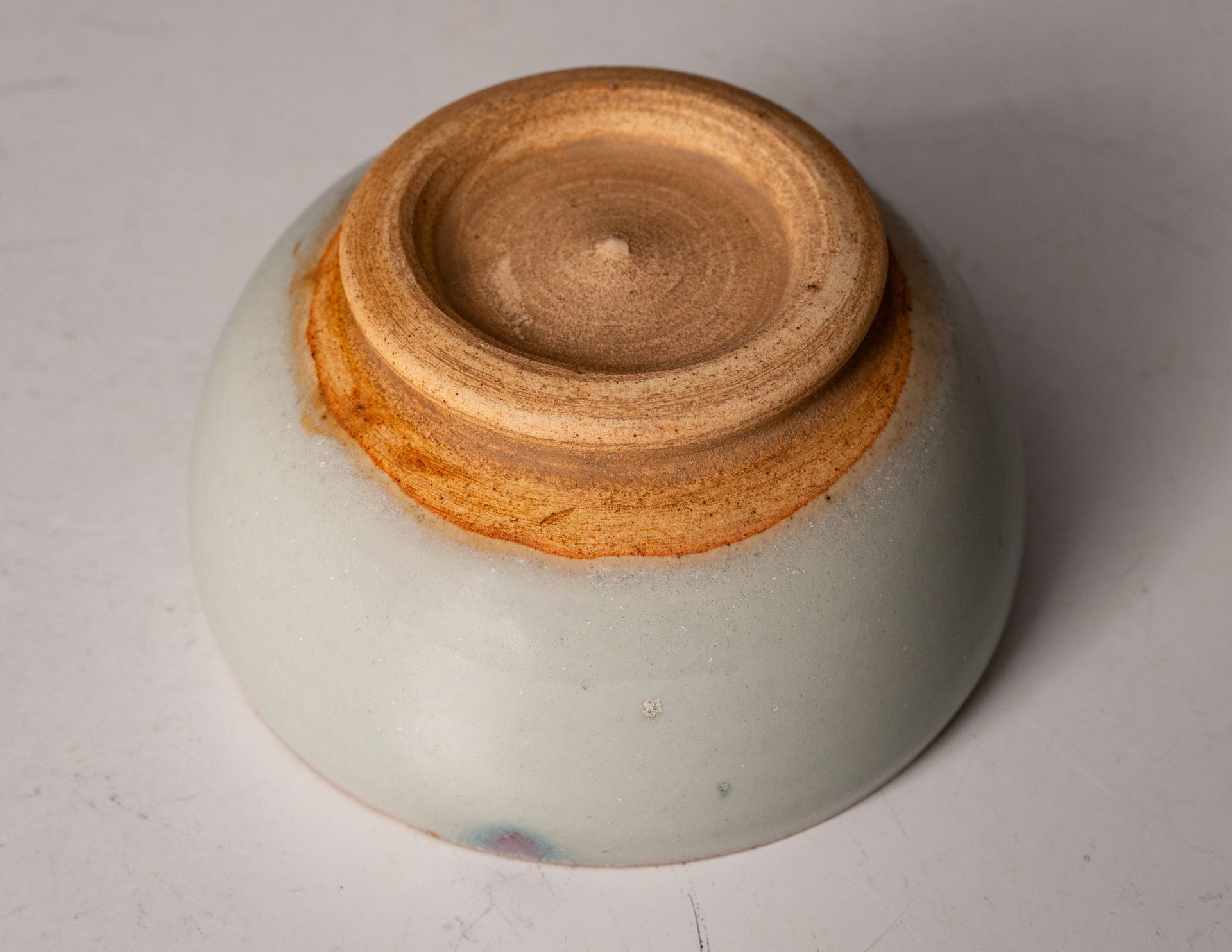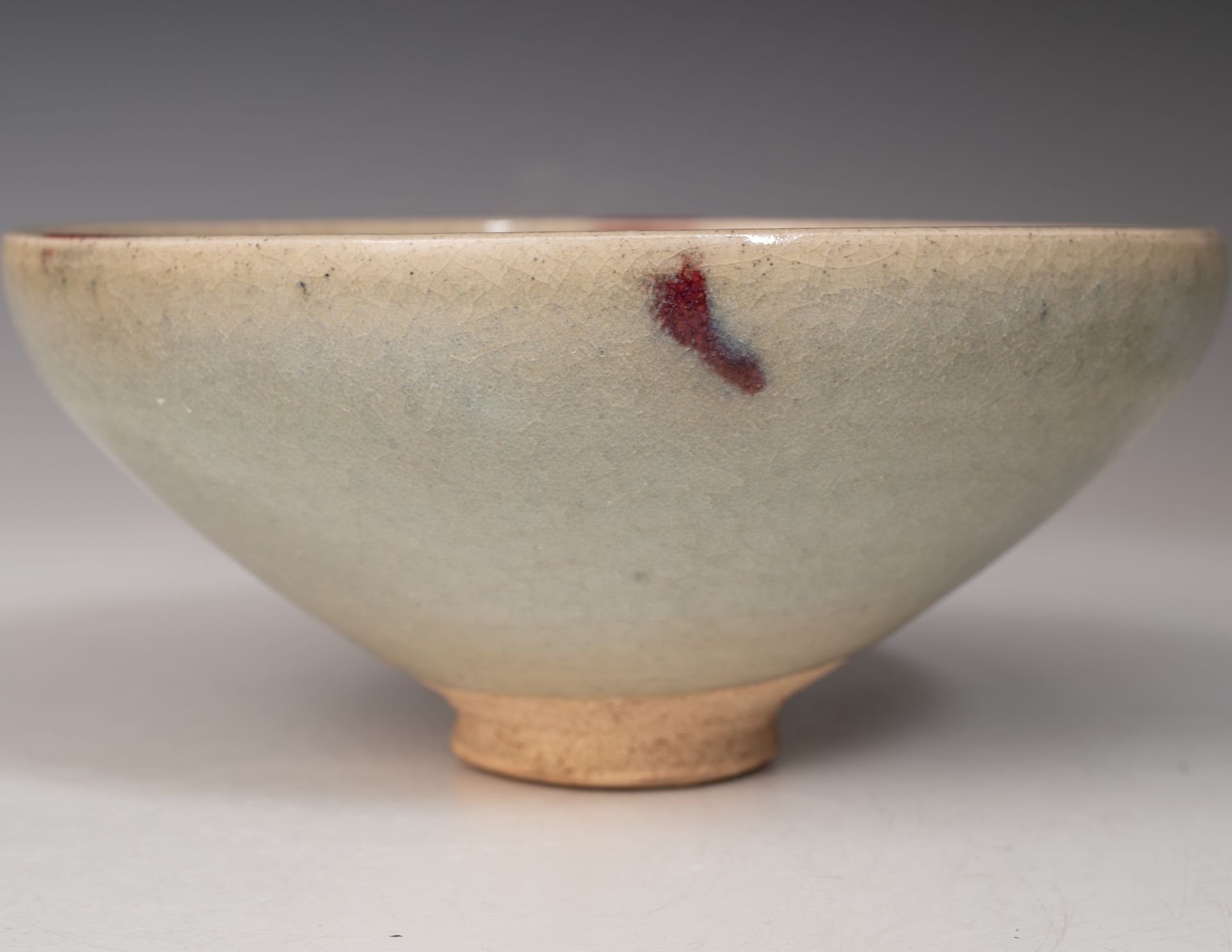 Este cuenco cónico de la dinastía Yuan, caracterizado por su esmaltado blanco azulado pálido, presenta salpicaduras violáceas tanto en el interior como en el borde. El esmaltado adquiere un delicado tono hongo en el borde. El cuenco tiene un diámetro de 8,9 cm. ppjrs